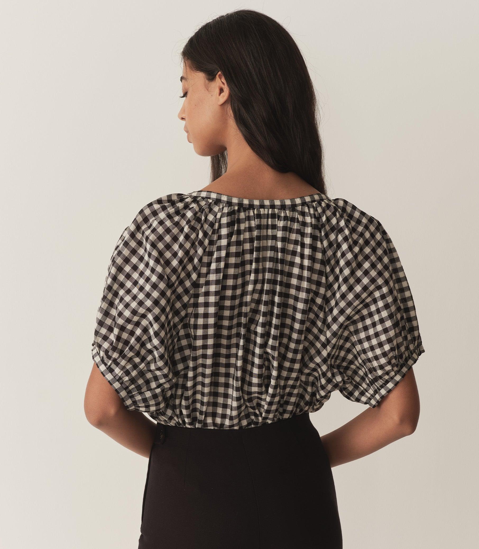 Crafted from a soft, lightweight organic cotton voile, the June Top is a short-sleeved take on our beloved Jane Blouse. Now refreshed in a ‘50s-inspired Noir Greta Gingham, the June features a gathered scoop neckline, full raglan sleeves, and a relaxed, breezy cut. A line of mother-of-pearl buttons extends down the center front. Wear it loose, or tuck it into your favorite high-waisted jeans or shorts.