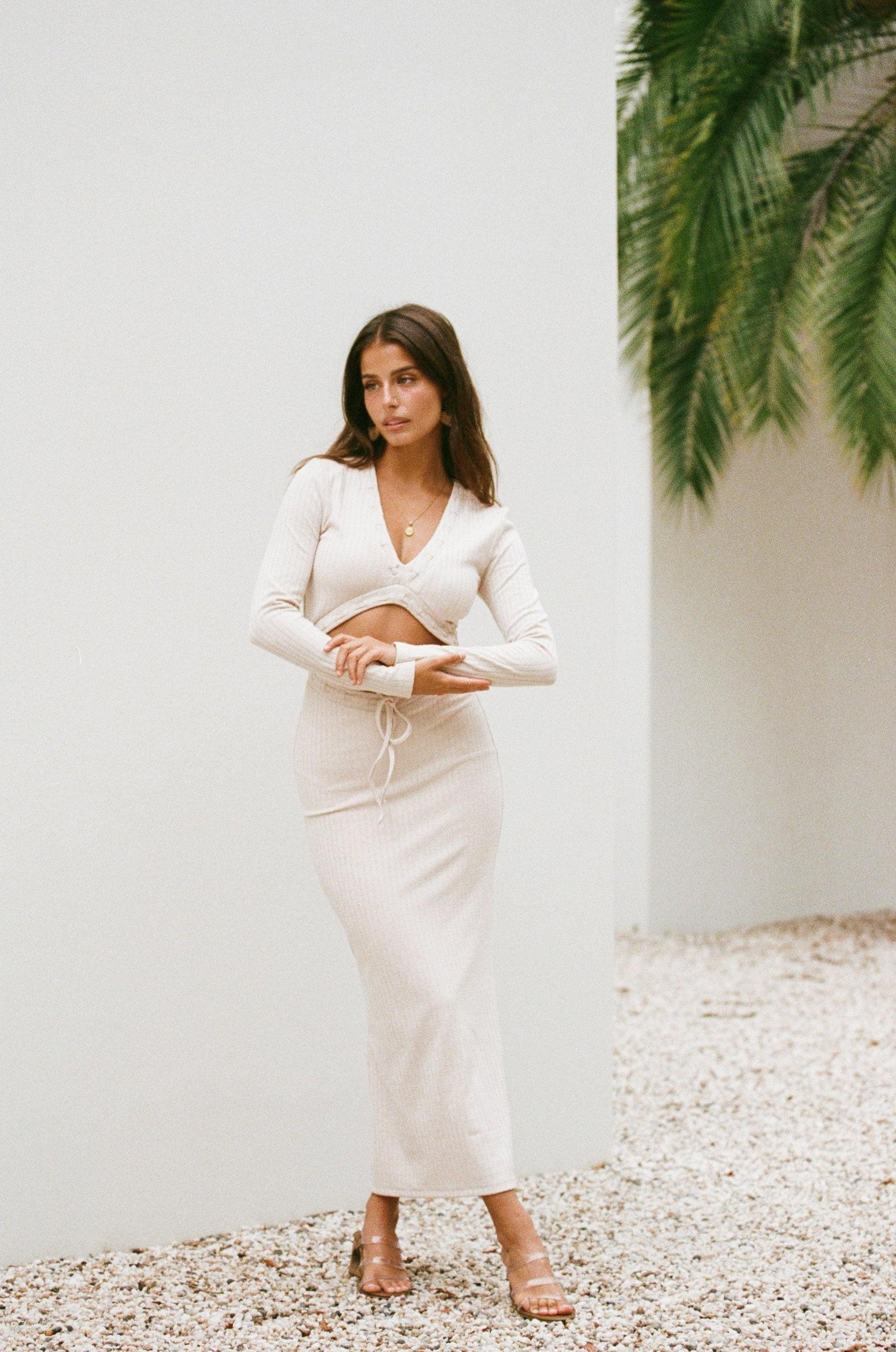 *THIS IS A FINAL SALE ITEM and cannot be returned. See our Returns Policy here For our lovers of neutrals! The Juni Midi Dress is made from a high quality ribbed fabric in a beige hue. It features full length fitted sleeves, V neckline, cutout at waist with draw detail and threaded strap details at neckline and waist. Style your look with the Strappy Rafaela Heels! Designed exclusively by Sabo.