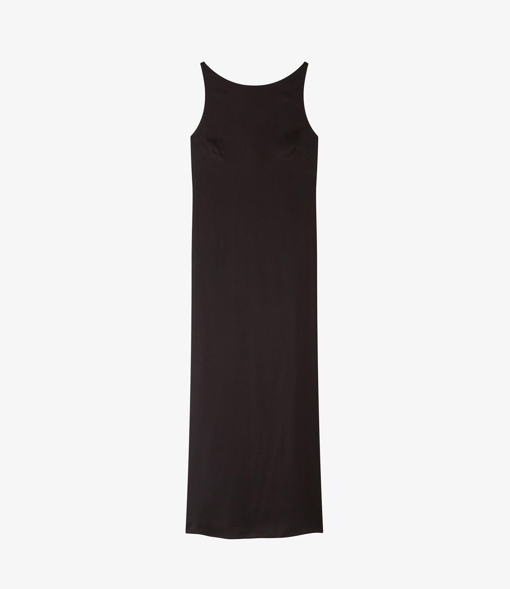 A.P.C. Women's dress.- Flowing satiny material. - Straight cut. - Ankle length. - Wide neckline. - Spaghetti straps in back. - Bust darts. - Backless. - Tone-on-tone viscose lining. - 100% viscose from FSC (Forest Stewardship Council) forests.