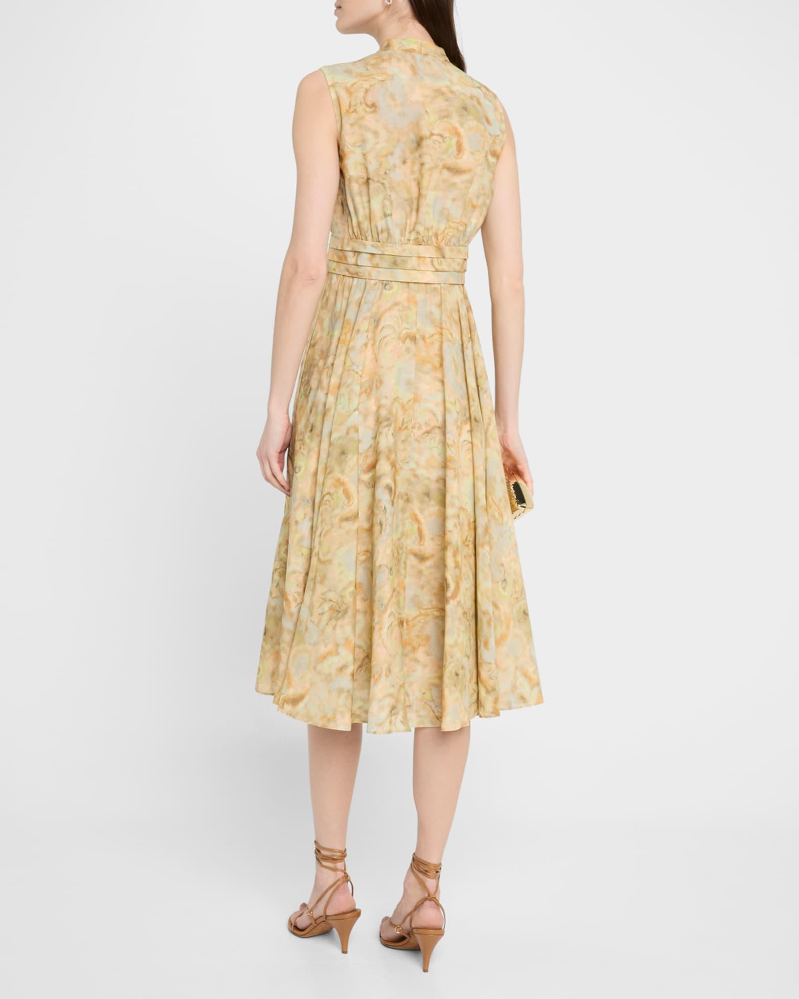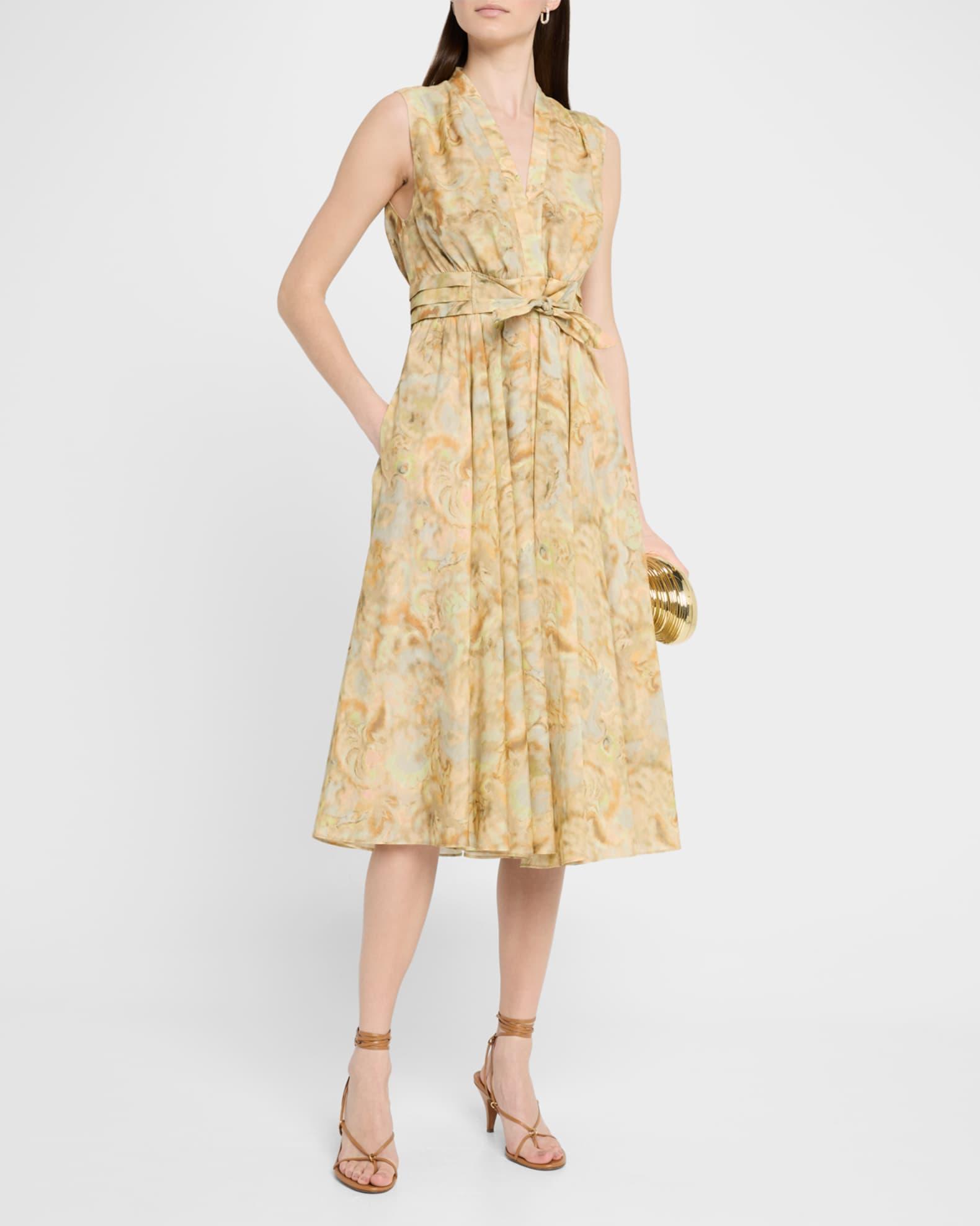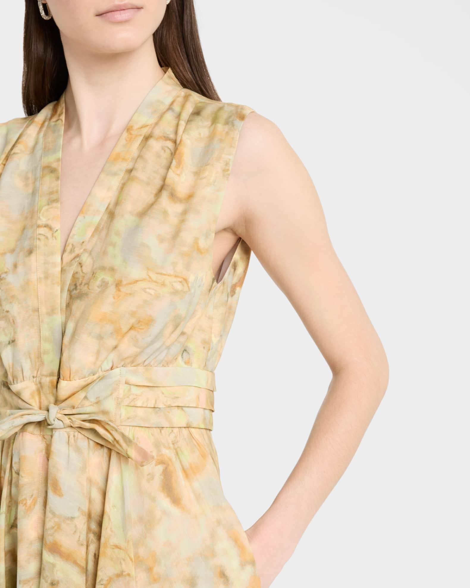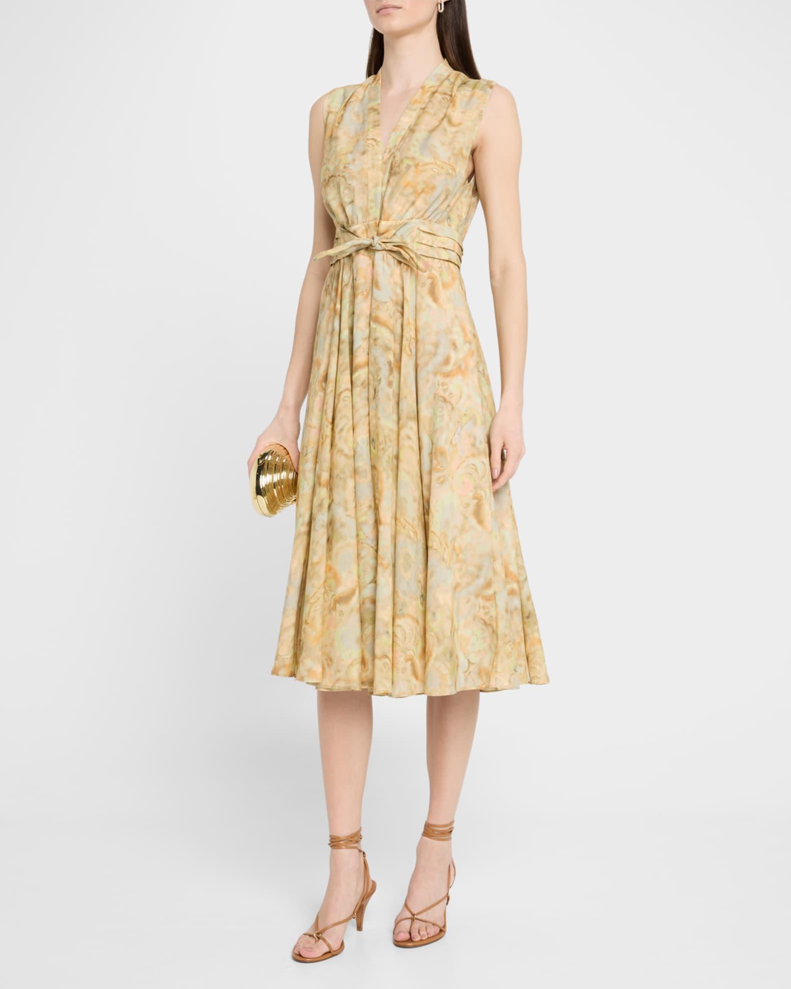 Kobi Halperin "Junia" pleated midi dress in an abstract watercolor print Approx. 46.5"L from shoulders to hem V neckline Sleeveless Pleated waistband Front self-tie On-seam pockets Hem falls below the knee A-line silhouette Viscose Lining: Polyester Dry clean Imported