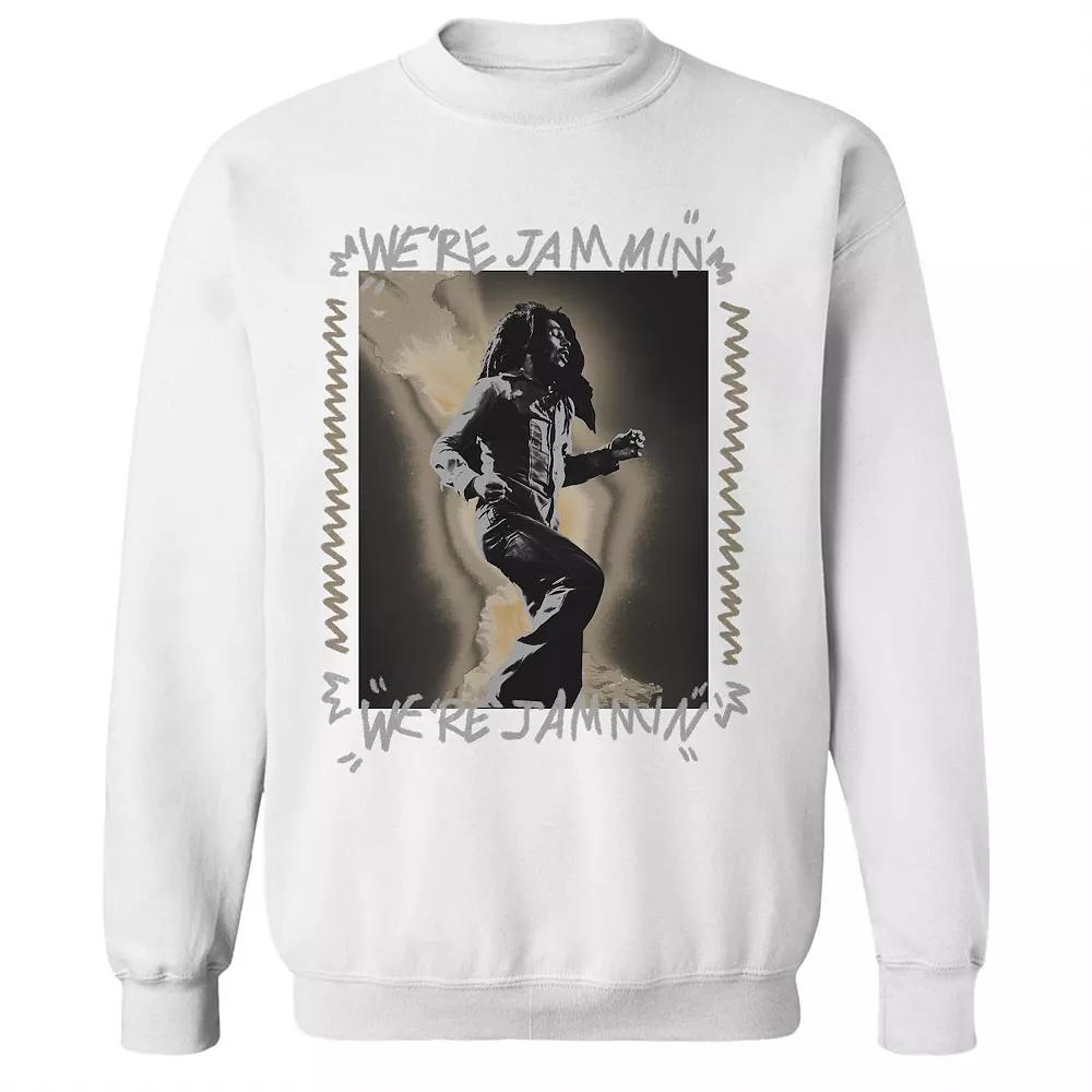 Reggae gives relaxed vibes and so will this Junior's Bob Marley Were Jammin' Graphic Fleece Sweatshirt.FEATURES Official Bob Marley Merchandise. Licensed by Bravado. Long sleeves CrewneckFABRIC & CARE Fleece, Cotton Machine wash Imported Size: Small. Color: White. Gender: female. Age Group: adult. Material: Fleece|Cotton.