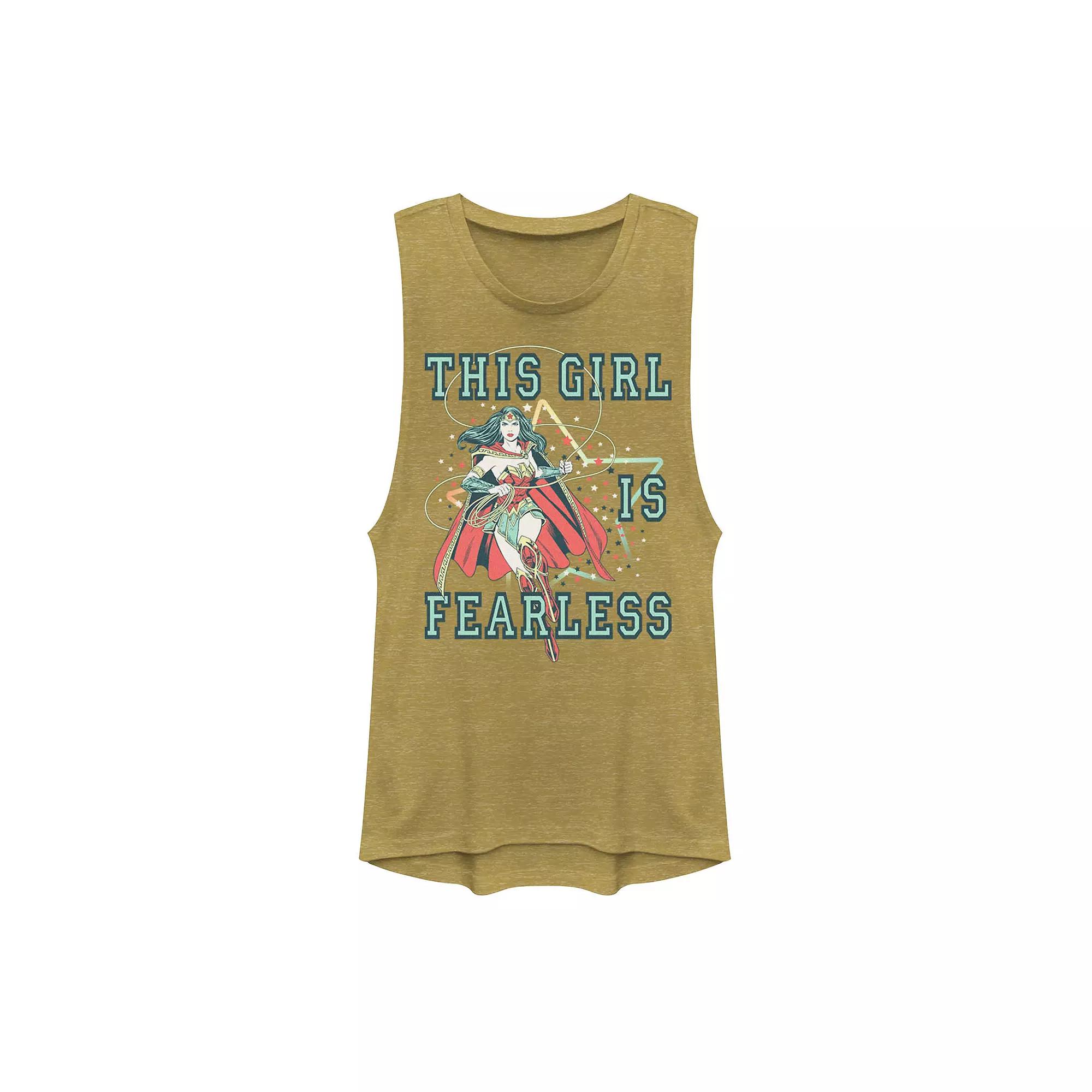 This awesome Juniors DC Comics Wonder Woman This Girl Is Fearless Muscle Tee is a must have for your fearless little Wonder Woman fan. In gold heather. This awesome Juniors DC Comics Wonder Woman This Girl Is Fearless Muscle Tee is a must have for your fearless little Wonder Woman fan. In gold heather. Crewneck SleevelessFABRIC & CARE Cotton, polyester Imported Machine wash Size: Small. Gender: female. Age Group: kids. Pattern: Graphic.