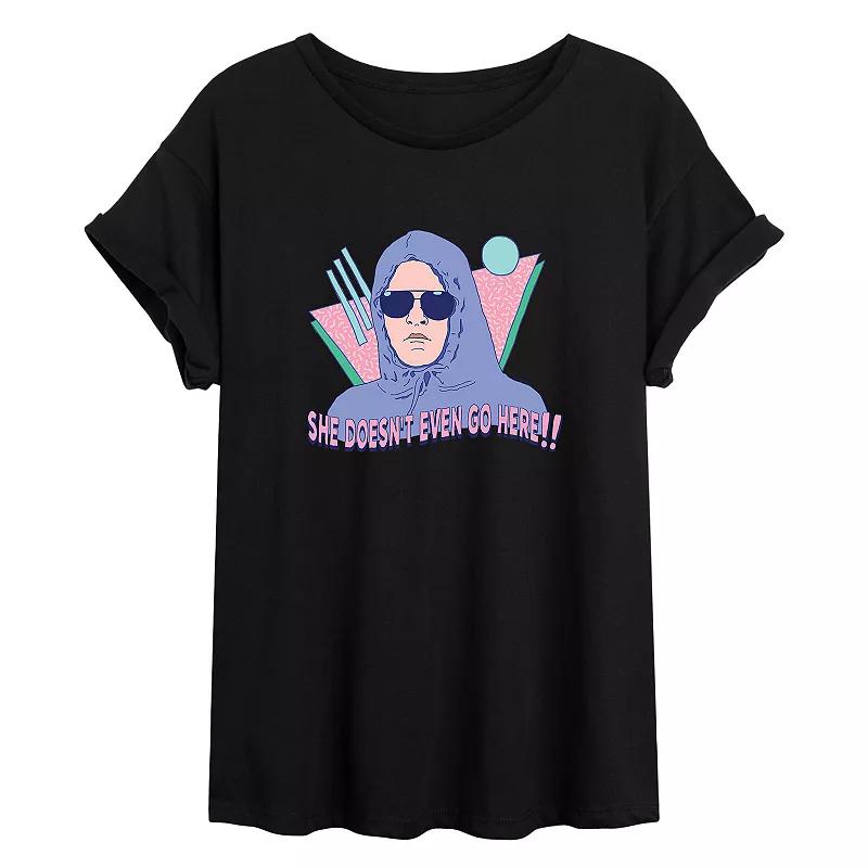 Fans of the comedy Mean Girls will love the look of this juniors She doesnt even go here graphic tee. Crewneck Rolled short sleevesFABRIC & CARE Cotton, polyester Machine wash Imported Size: X Large. Color: Black. Gender: female. Age Group: adult.