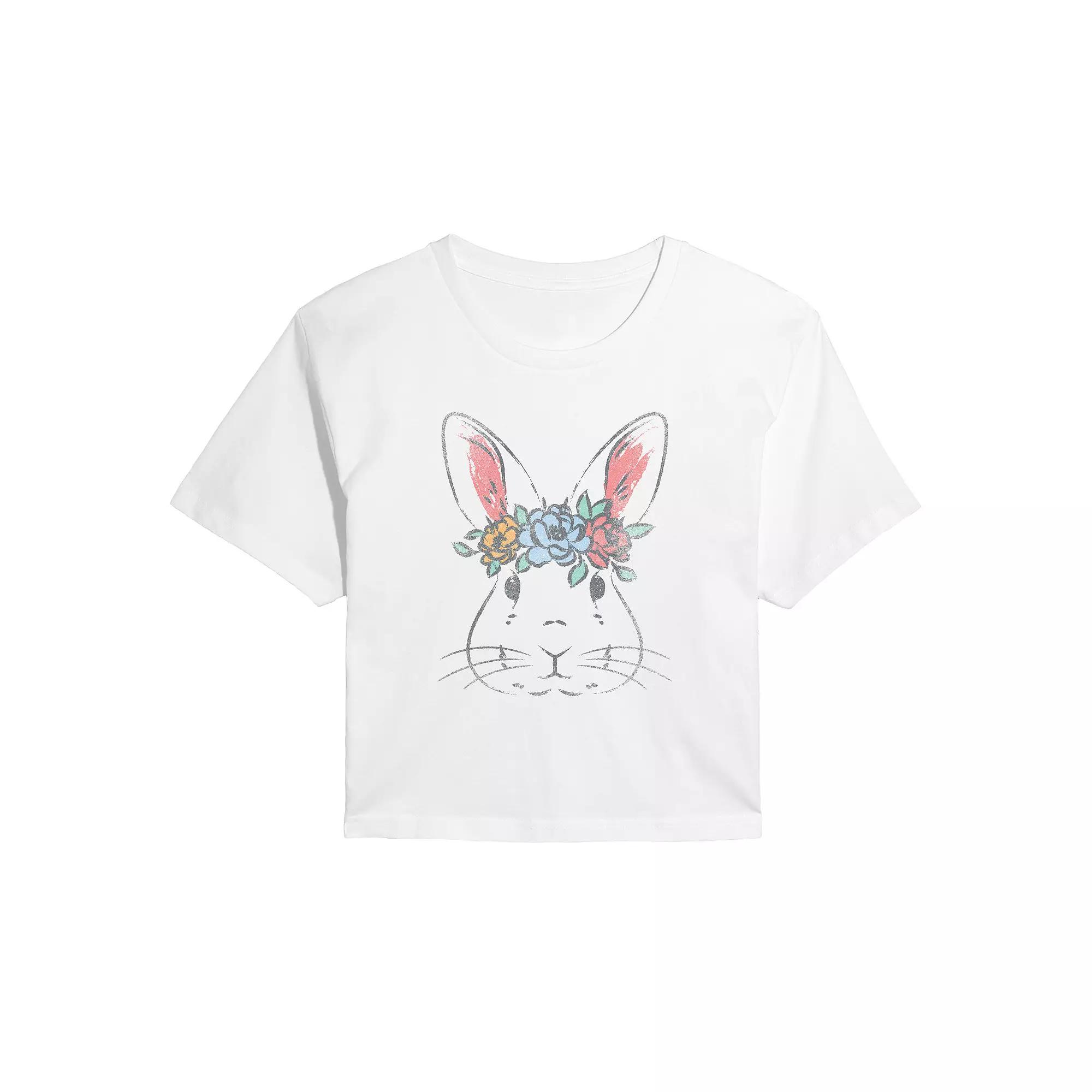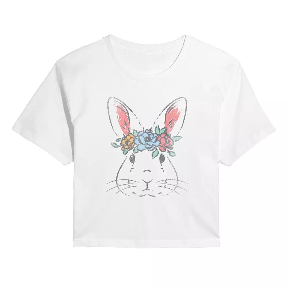 Get ready for some seriously adorable vibes with this floral crown bunny graphic cropped tee. Perfect for adding a touch of whimsy to any outfit, this shirt will have you hopping into fun adventures while keeping your style effortlessly cute. Click on this WOMEN'S GUIDE to find the perfect fit and more! - https://www.kohls.com/feature/womens-fit-guide.jsp. FEATURES: Playful bunny graphic design, Relaxed fit for comfort. FIT & SIZE: Classic fit. MATERIAL & CARE: Body: cotton, polyester, Body: machine wash. DETAILS: Crewneck neckline, Short sleeves, Imported. Size: Large. Color: White. Gender: female. Age Group: adult.