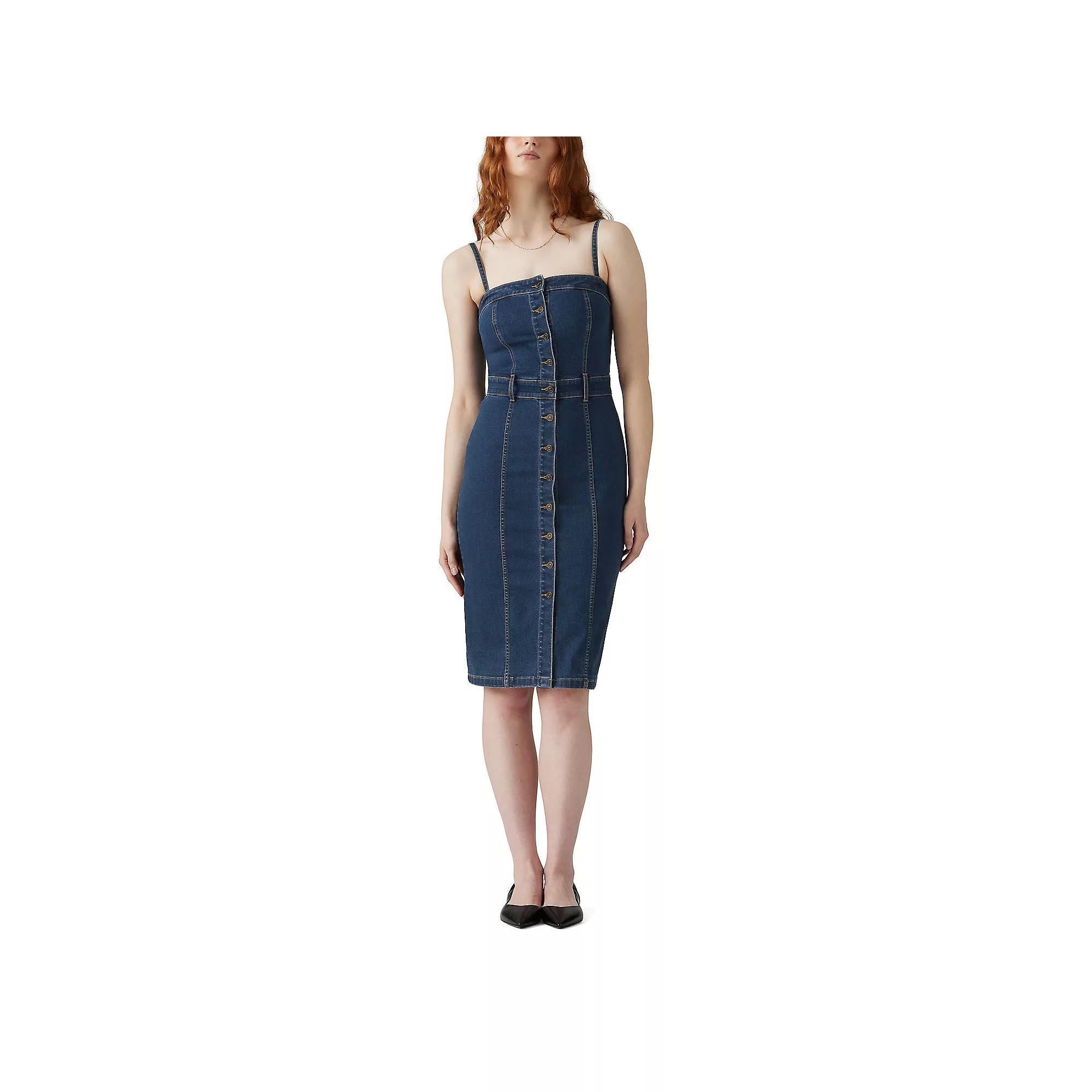 Step into effortless elegance with this stunning denim dress by Levi's. Featuring a flattering bustier silhouette and charming button front detail, it's perfect for everything from casual outings to more polished events, allowing for versatile styling that enhances any wardrobe. Click on this WOMEN'S GUIDE to find the perfect fit and more! - https://www.kohls.com/feature/womens-fit-guide.jsp. FEATURES: A-line silhouette, Straight hem, Button closure, Sleeveless, Squareneck, Fully lined. FIT & SIZING: 40-in. length from shoulder to hem, Midi length hits below the knee. FABRIC & CARE: Cotton, viscose, polyester, Lycra®, Machine wash, Imported. Size: Large. Color: Upper East Side. Gender: female. Age Group: adult.