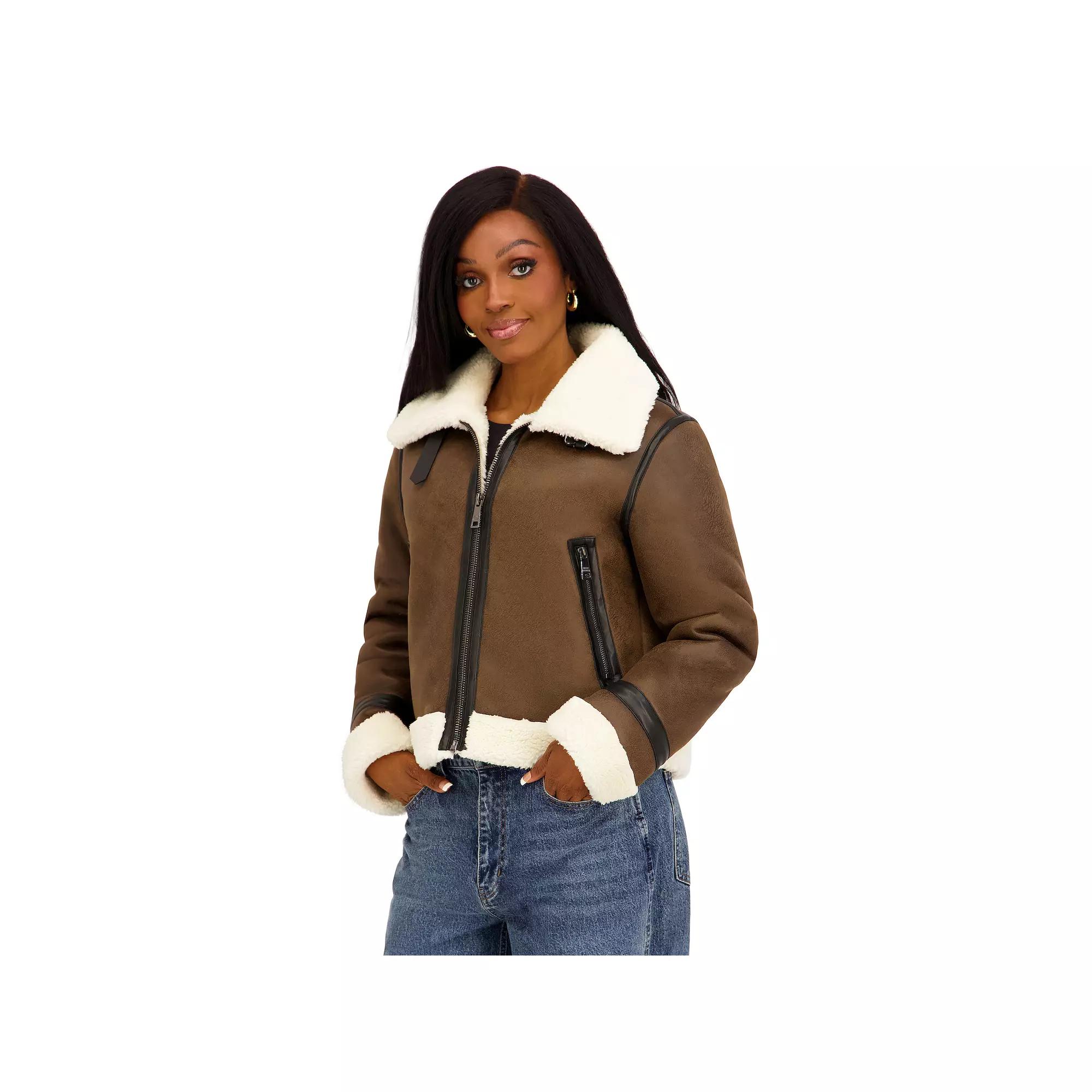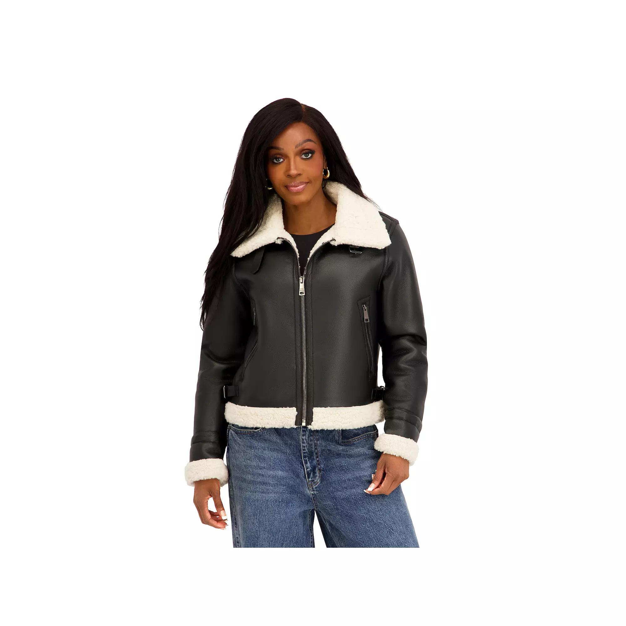 Get ready to step out in effortless style with this chic faux shearling jacket that brings a perfect touch of warmth and flair to any outfit. With fashionable straps and a buckle at the neck and waist, you'll be strutting your stuff and turning heads all season long, all while feeling cozy and fabulous. Click on this WOMEN'S GUIDE to find the perfect fit and more! - https://www.kohls.com/feature/womens-fit-guide.jsp. FEATURES: Straps and buckle at neck and waist for adjustable fit, Heavyweight design for enhanced warmth. FIT & SIZE: Regular fit, 23-in. length from shoulder to hem, Designed to hit at the waist. MATERIAL & CARE: Body: Black-100% polyurethane, DK Chocolate-100% polyester, bonded with faux sherpa, Product contains faux fur, Hand wash. DETAILS: Zipper front closure, Long sleeves, 2 zipper pockets, Imported. Size: Small. Gender: female. Age Group: adult. Material: POLY BLEND.