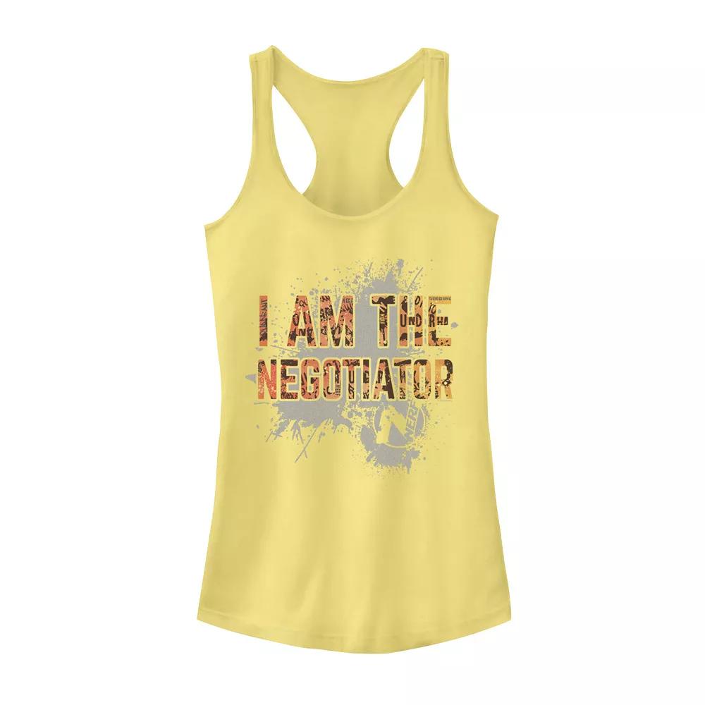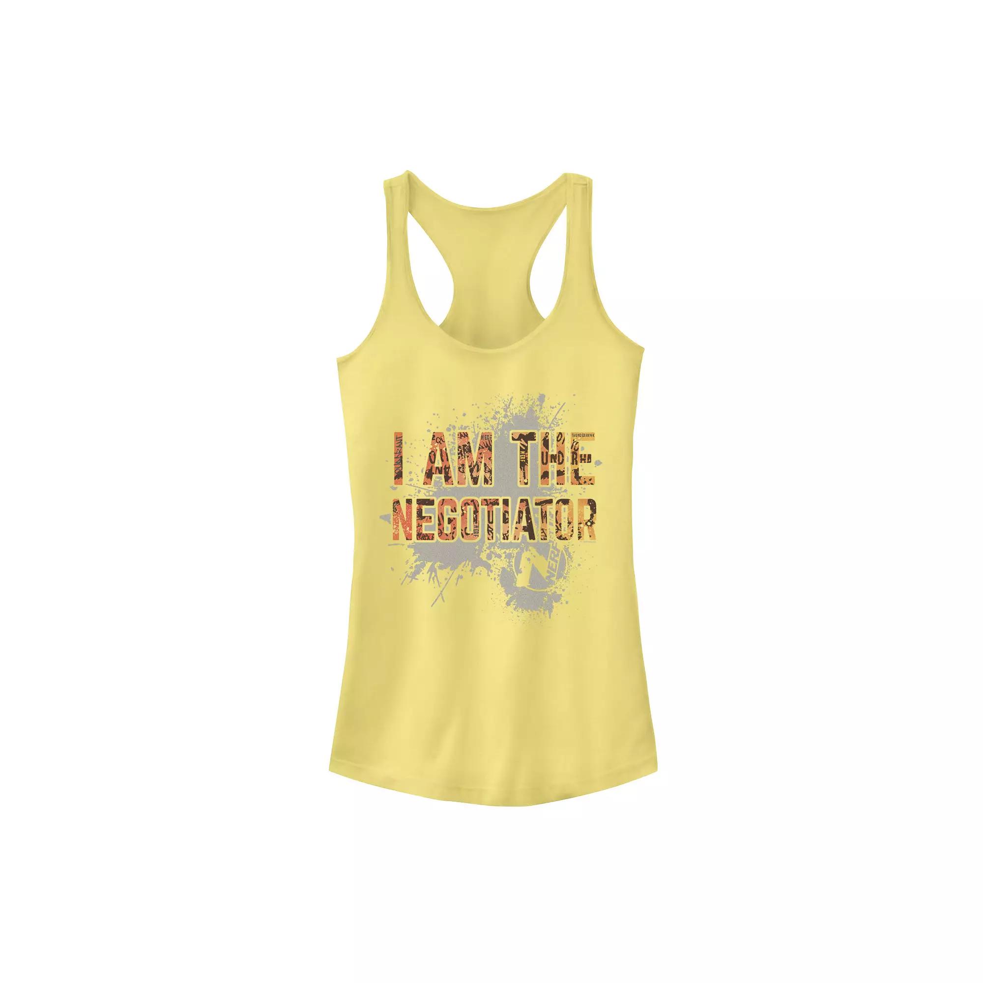 Look tough in this I Am The Negotiator Nerf juniors tank top. Look tough in this I Am The Negotiator Nerf juniors tank top. Scoopneck SleevelessFABRIC & CARE Cotton, polyester Machine wash Imported Size: Medium. Color: Yellow. Gender: female. Age Group: adult. Pattern: Graphic.