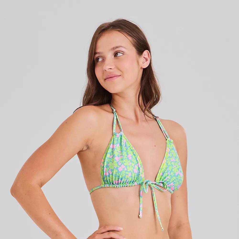 This juniors' reversible triangle bikini top by Ninety-Nine° is perfect for a day in the sun. Click on this WOMEN'S GUIDE to find the perfect fit and more! - https://www.kohls.com/feature/womens-fit-guide.jsp. FEATURES: Removable cups, Moderate coverage, Soft, Tie closure, Sleeveless, Partially lined, Wireless, Wash before wearing, Halter neckline. FIT & SIZING: Adjustable Straps. FABRIC & CARE: Body: 84% recycled polyester, 16% spandex, Lining: 100% polyester, Hand wash and line dry, Imported. RESPONSIBLE Contains recycled polyester. Size: Large. Color: Flower Trip. Gender: female. Age Group: adult. Material: POLY BLEND.