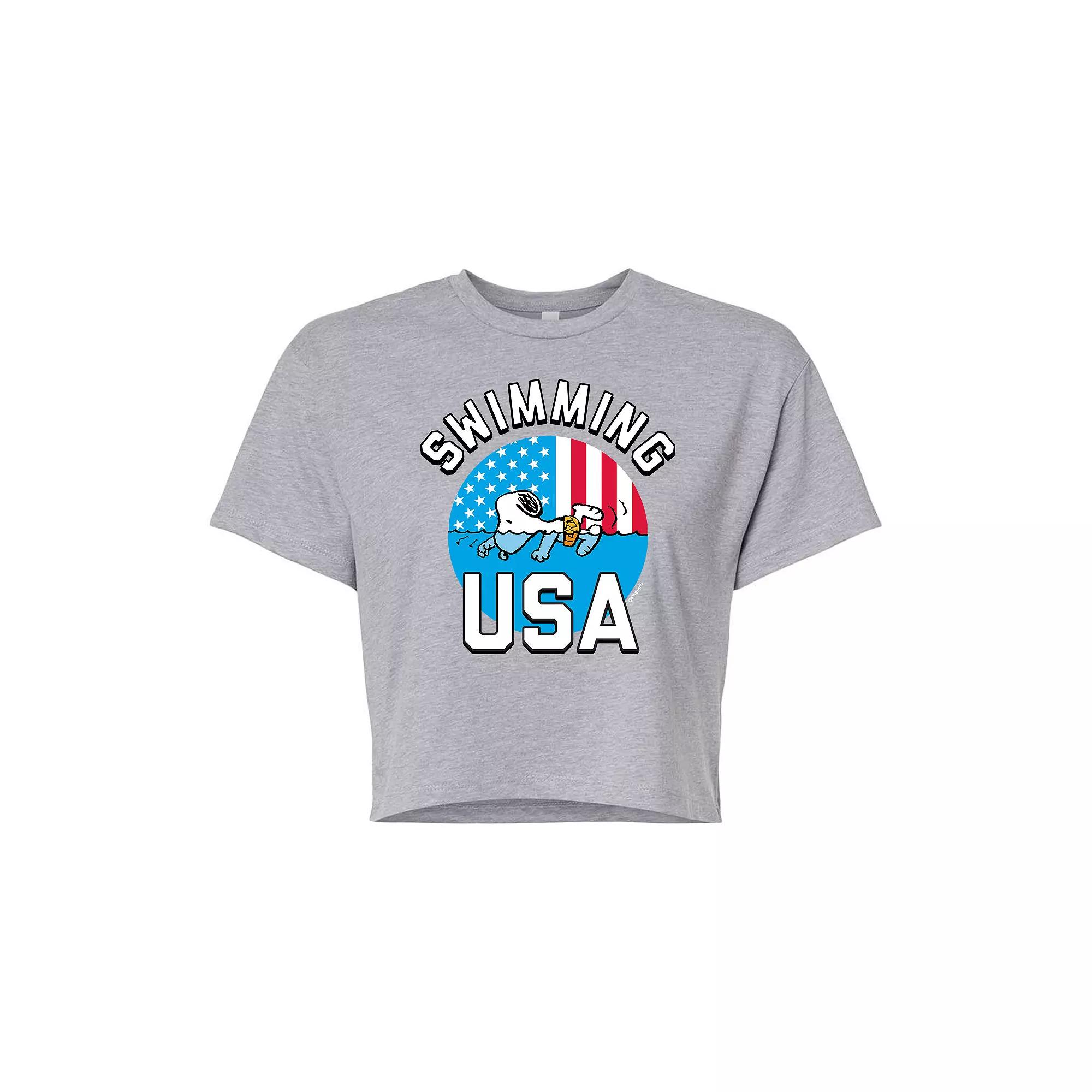 Make waves with this patriotic juniors Snoopy USA swimming graphic tee. Make waves with this patriotic juniors Snoopy USA swimming graphic tee. Crewneck Rolled short sleeves Cropped lengthFABRIC & CARE Cotton, polyester Machine wash Imported Size: Small. Color: White. Gender: female. Age Group: adult.