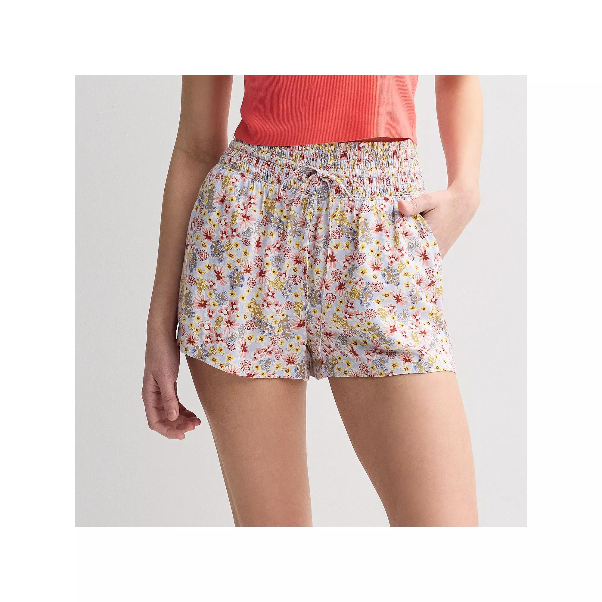 These stylish juniors' high rise smocked waist shorts from SO are sure to quickly become a staple in your warm-weather wardrobe.Click on this WOMEN'S GUIDE to find the perfect fit and more!These stylish juniors' high rise smocked waist shorts from SO are sure to quickly become a staple in your warm-weather wardrobe.Click on this WOMEN'S GUIDE to find the perfect fit and more!FEATURES Elastic waistband with tie closure 2 side pockets Straight hem UnlinedFIT & SIZING Relaxed fit 2 1/2-in. inseam Wide leg opening 13 1/2-in. leg opening High rise sits below the natural waistline Relaxed fit through the hip and thigh Drawstring elastic waistbandFABRIC & CARE Cotton, rayon Machine wash Imported Size: Small. Color: Lilac Floral. Gender: female. Age Group: adult.