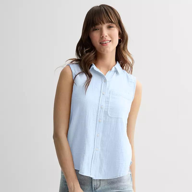 Get your spring wardrobe ready with this juniors' SO modern fit sleeveless top. Click on this WOMEN'S GUIDE to find the perfect fit and more!Get your spring wardrobe ready with this juniors' SO modern fit sleeveless top. Click on this WOMEN'S GUIDE to find the perfect fit and more!FEATURES Collared neckline Sleeveless One front pocket Button closure Rounded hemFIT & SIZING Modern fit 25 3/4-in. length from shoulder to hemFABRIC & CARE Cotton Machine wash Imported Size: Medium. Color: Peri Cream. Gender: female. Age Group: adult. Material: Cotton Blend.