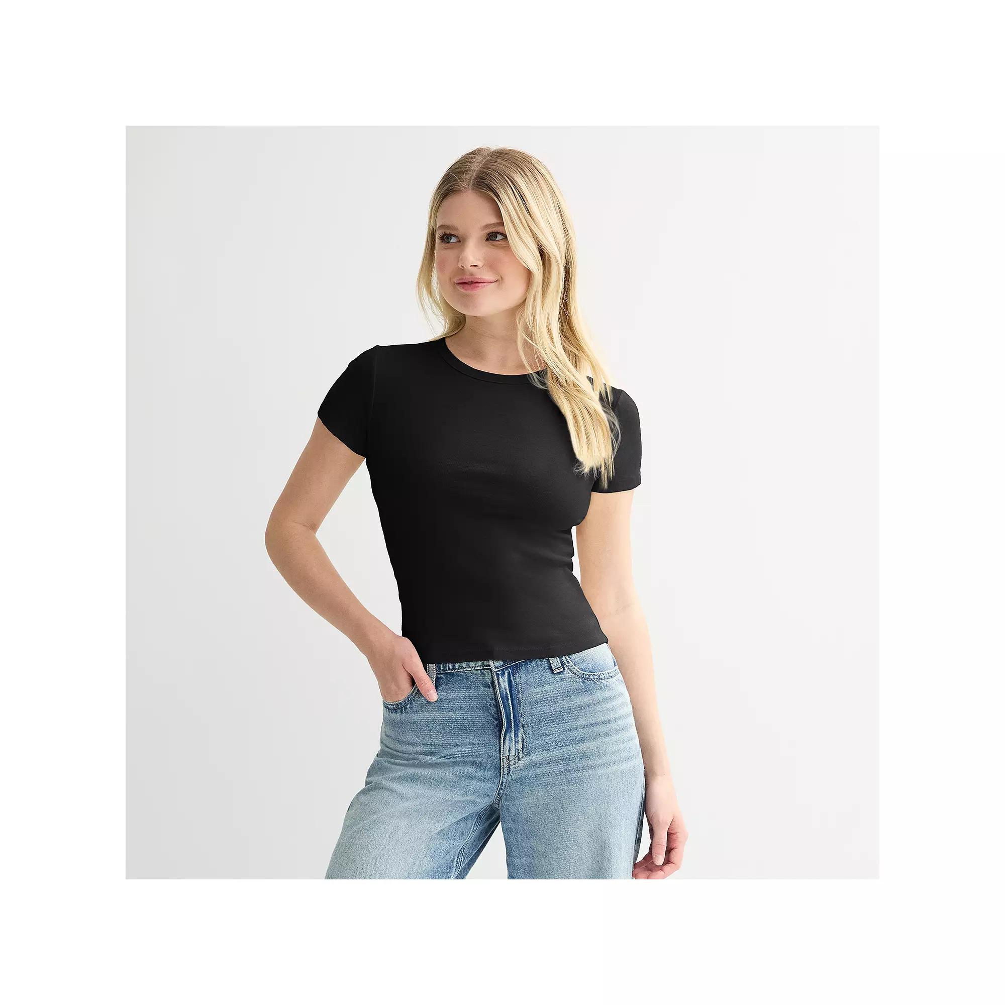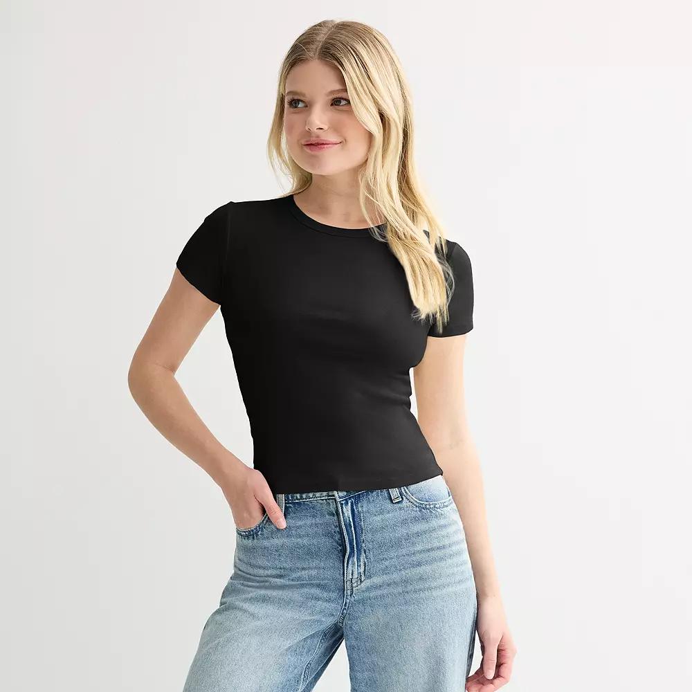 Give your wardrobe a refresh with this juniors' baby tee from SO. Click on this WOMEN'S GUIDE to find the perfect fit and more!Give your wardrobe a refresh with this juniors' baby tee from SO. Click on this WOMEN'S GUIDE to find the perfect fit and more!FEATURES Crewneck Short sleeves Straight hem Ribbed constructionFIT & SIZING Slim fit 21-in. length from shoulder to hemFABRIC & CARE Cotton Machine wash ImportedRESPONSIBLE Supports more sustainable cotton farming Size: Large. Color: Black Luxe. Gender: female. Age Group: adult. Material: Cotton Blend.