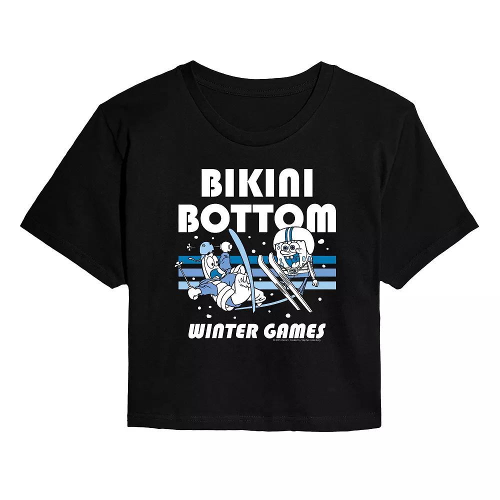 Get ready for some winter fun with this cheerful graphic tee that captures the quirky charm of Bikini Bottom's winter games. Featuring your favorite underwater pals in action, this Juniors' SpongeBob SquarePants shirt is perfect for spreading smiles and warmth during chilly days, making it a great gift for any young fan looking to rock their style with a splash of laughter. Click on this WOMEN'S GUIDE to find the perfect fit and more! - https://www.kohls.com/feature/womens-fit-guide.jsp. FEATURES: Bold graphic print featuring iconic characters, Short sleeve design for a relaxed fit. FIT & SIZE: Classic fit. MATERIAL & CARE: Body: cotton, polyester, Machine wash. DETAILS: Crewneck neckline, Short sleeves, Imported. Size: Medium. Color: Black. Gender: female. Age Group: adult.