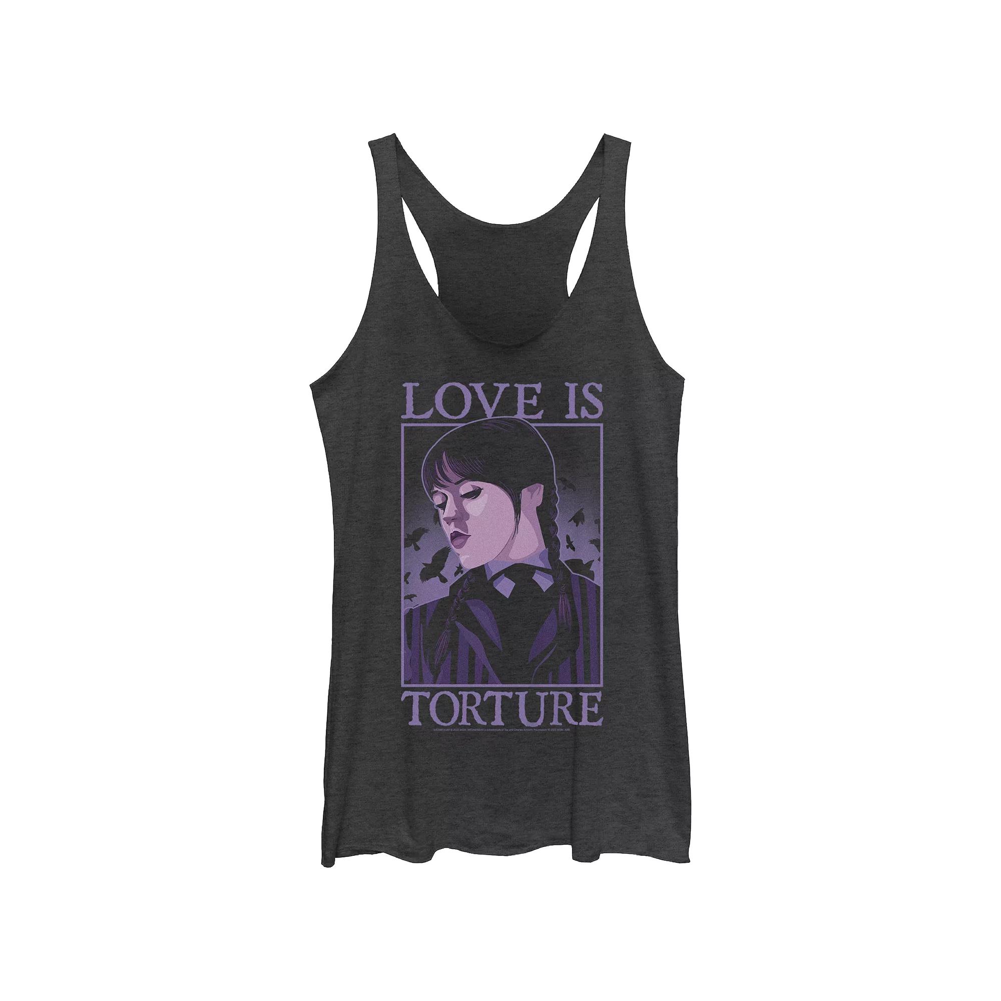 Wednesday Black Heather Love is Torture Racerback Tank - Juniors. Expand your warm-weather attire with this racerback tank crafted from a cotton tri-blend fabric. Full graphic text: Love is torture.Printed with phthalate-free water-based inks50% polyester / 25% cotton / 25% rayonMachine wash; tumble dryImported, screen printed in the USAShipping note: This item is made to order. Allow extra time for your special find to ship.