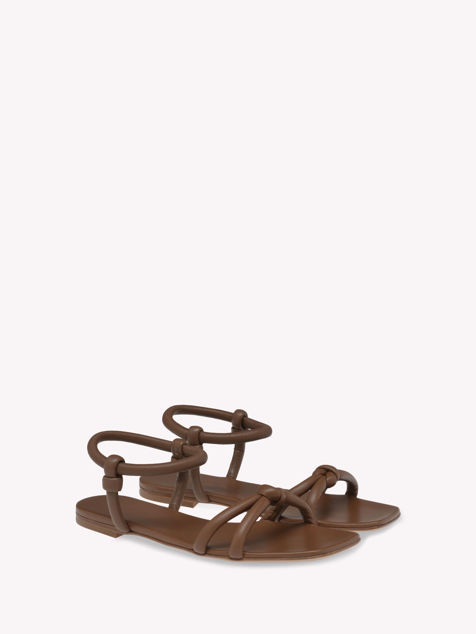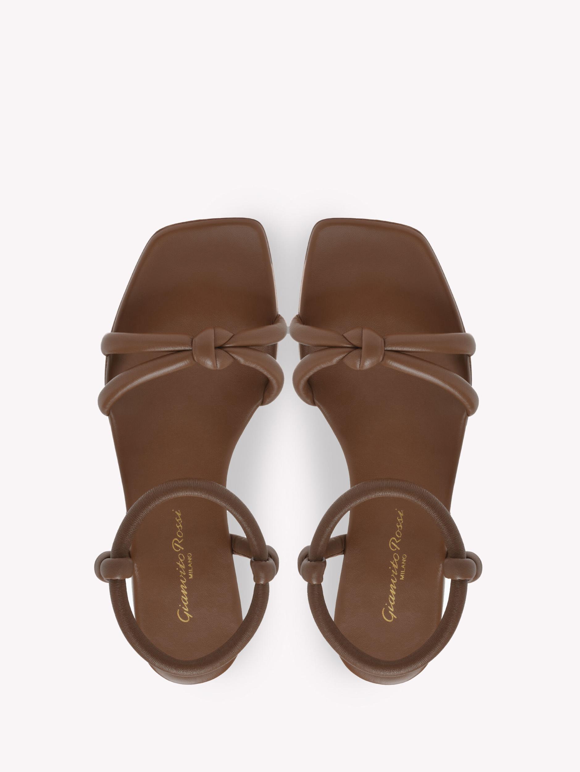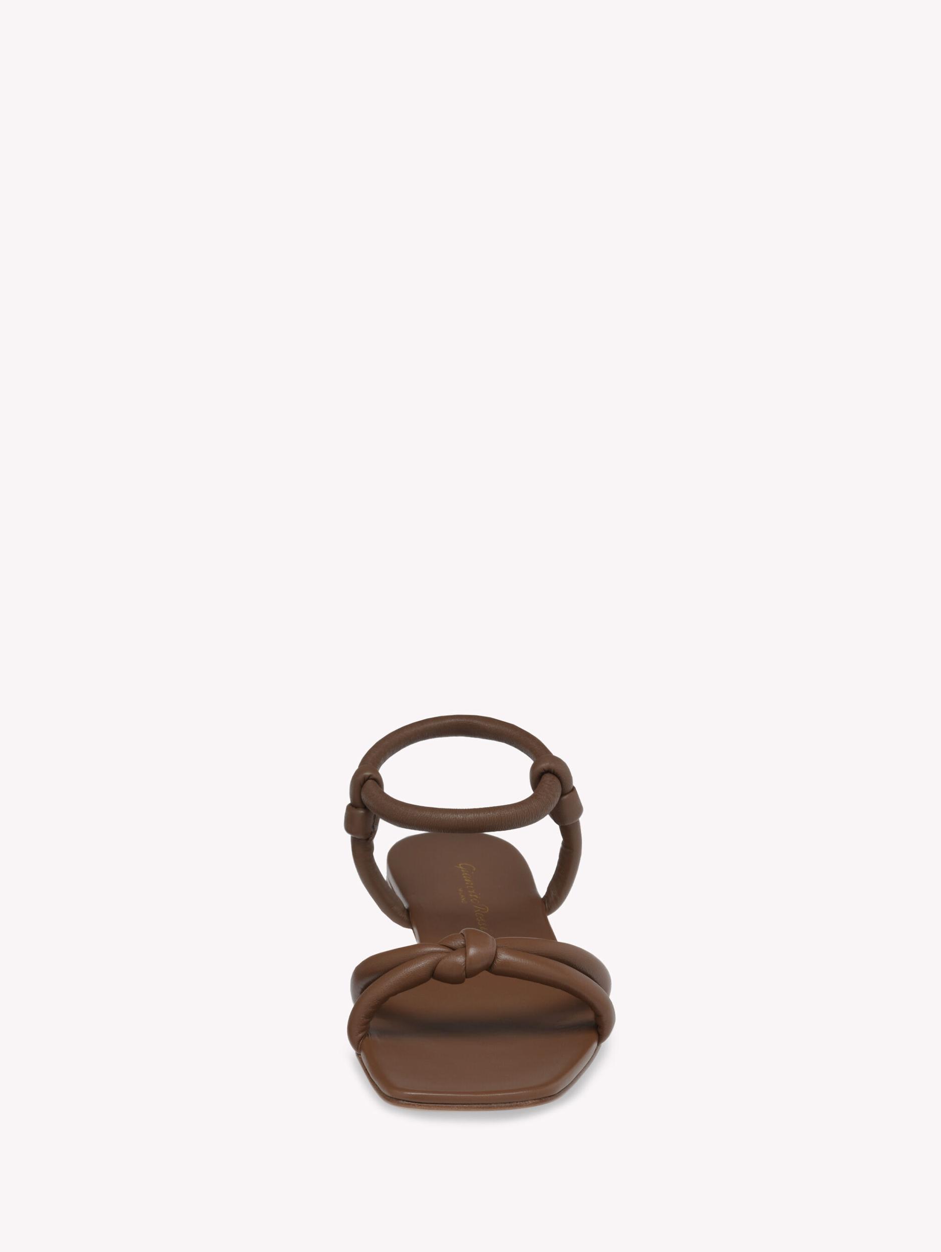 Juno 05 is a square toe sandal with a 5mm leather stack heel. Crafted from leather, this style features soft tubular upper straps with knotted details. The round tubular elastic ankle strap covered in leather ensures easy wearability. Handmade in Italy.