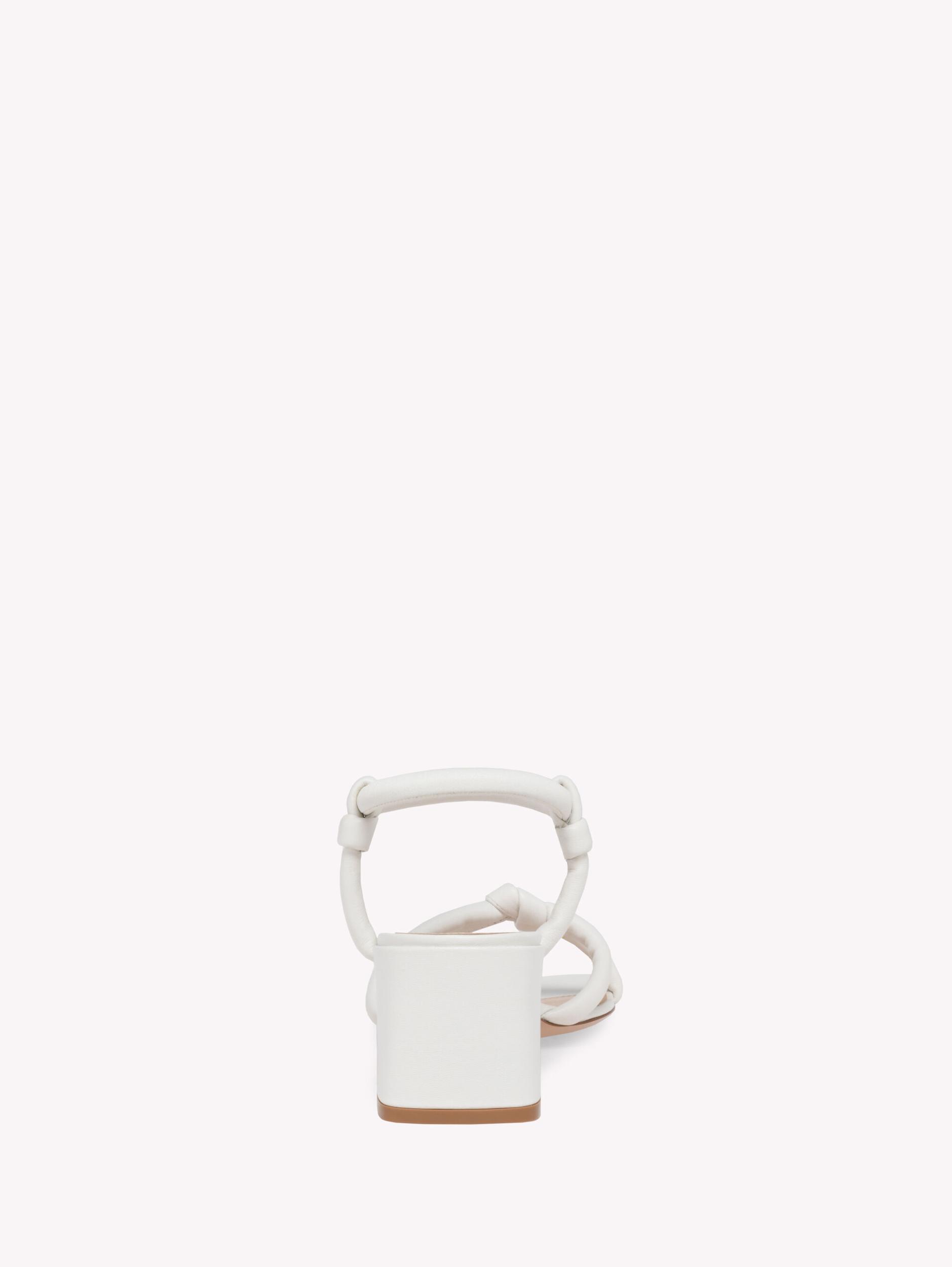 Juno 55 is a squared-toe sandal with a 55mm block heel. Crafted from leather, this style features soft tubular upper straps with knotted details. The round tubular elastic ankle strap covered in leather ensures easy wearability. Handmade in Italy.