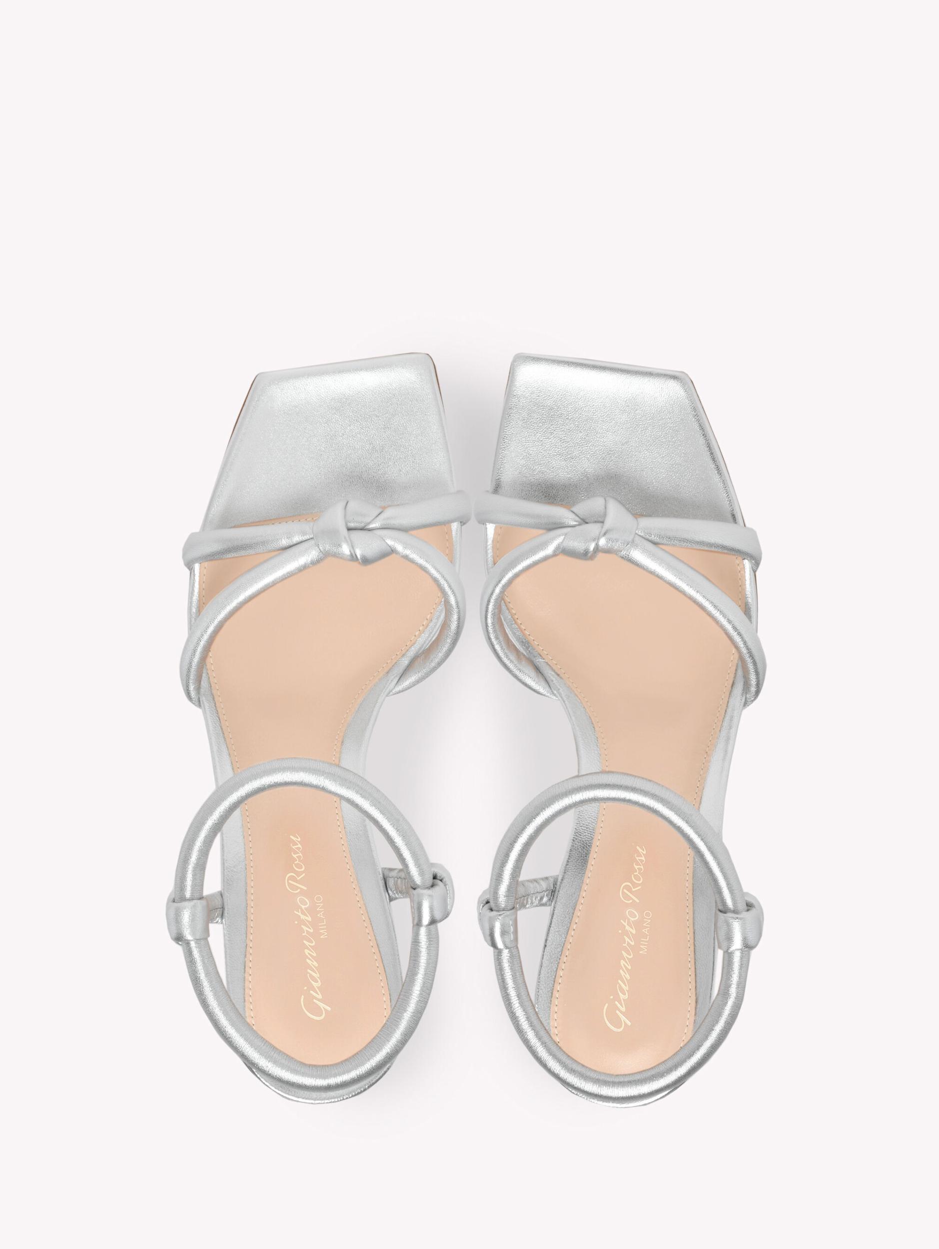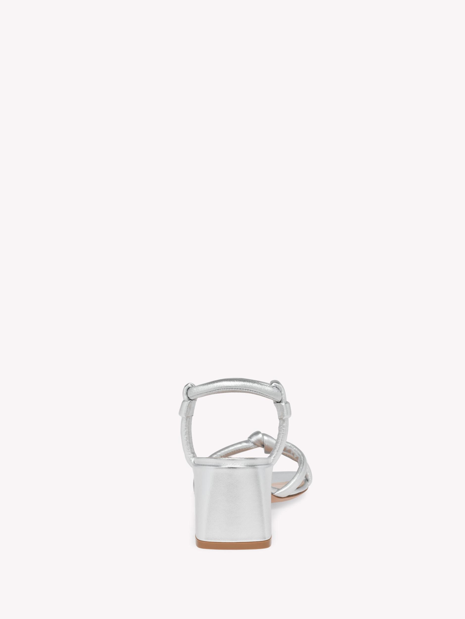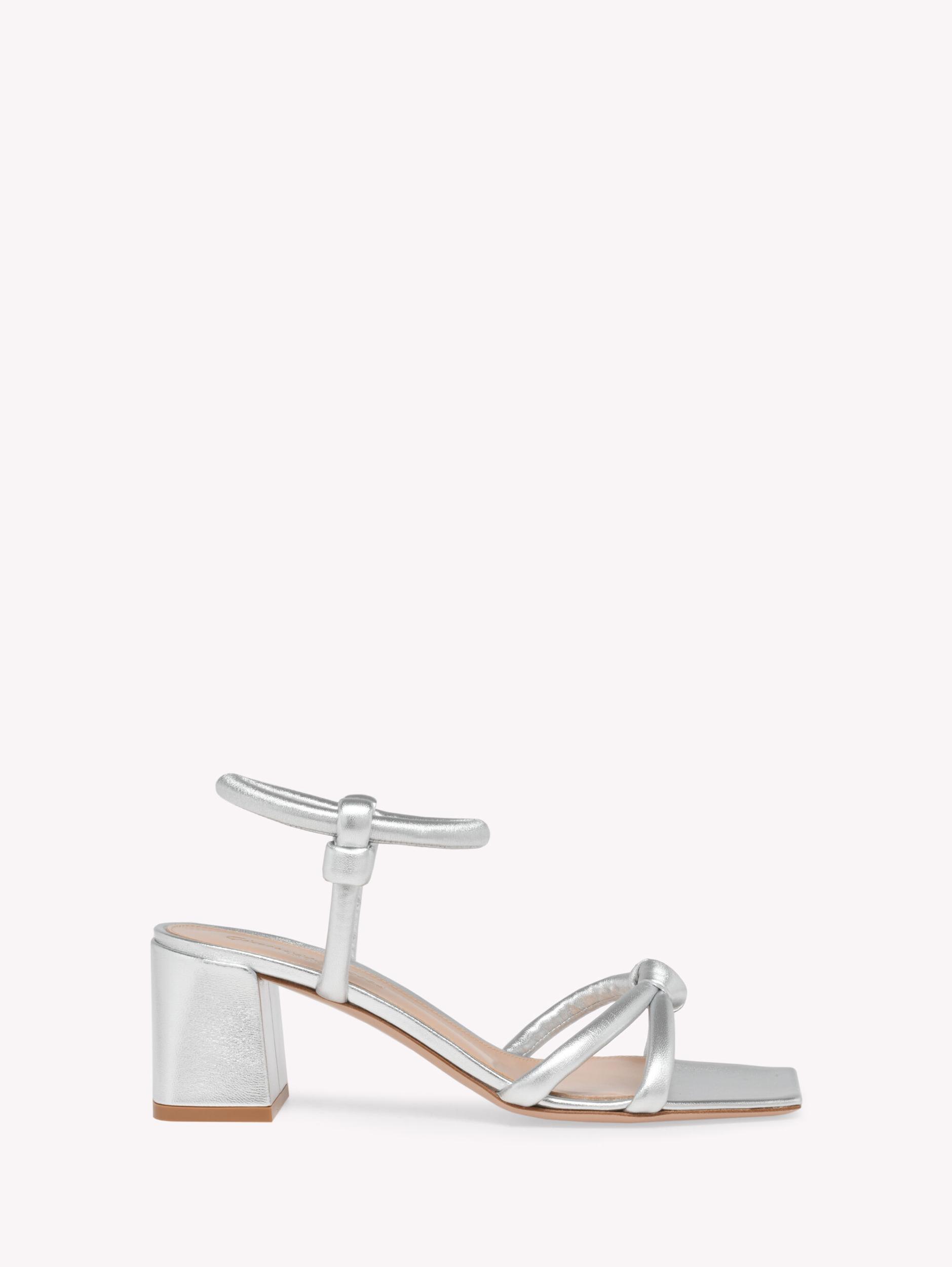 Juno 55 is a squared-toe sandal with a 55mm block heel. Crafted from metallic-effect leather, this style features soft tubular upper straps with knotted details. The round tubular elastic ankle strap covered in leather ensures easy wearability. Handmade in Italy.