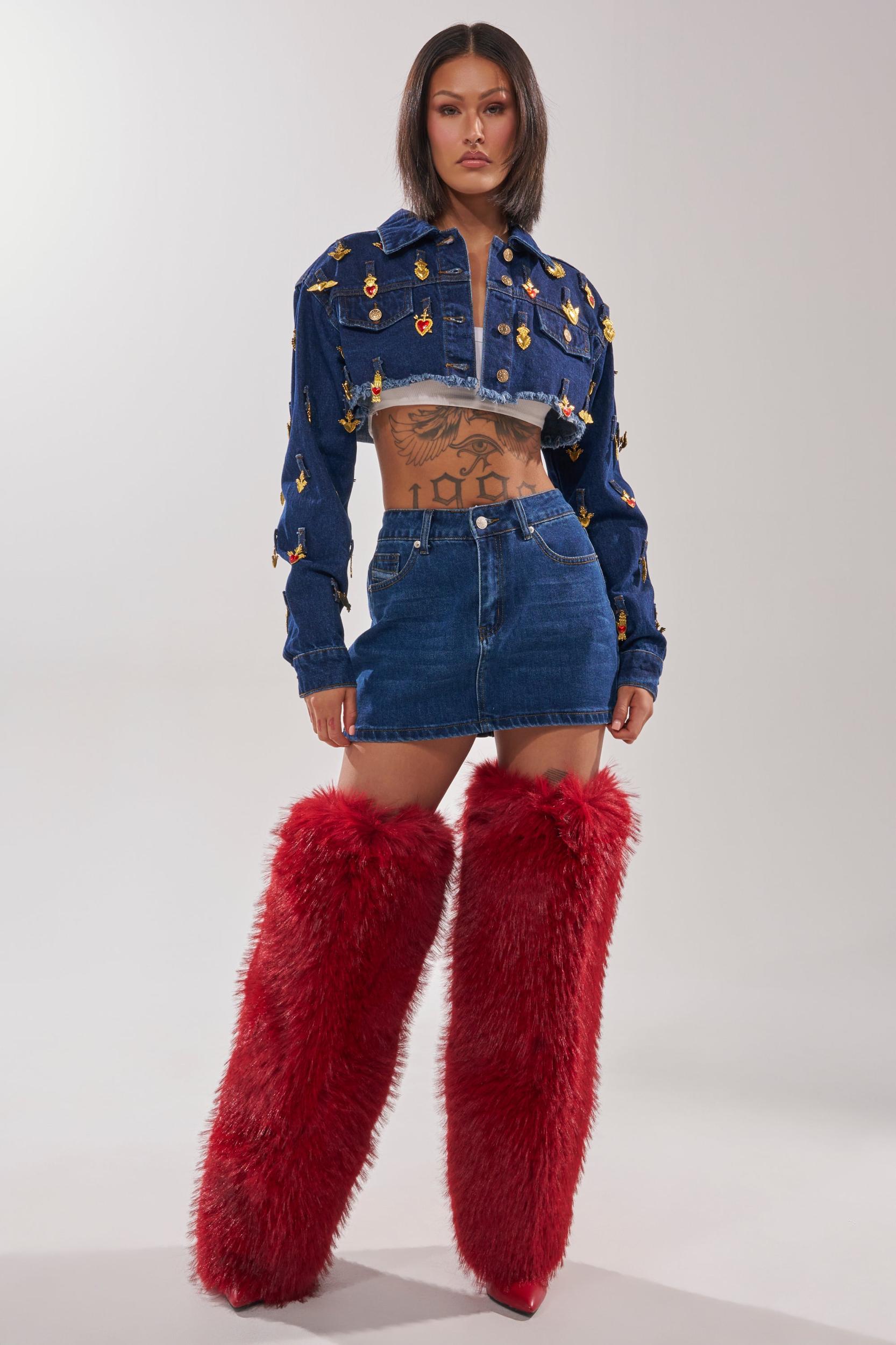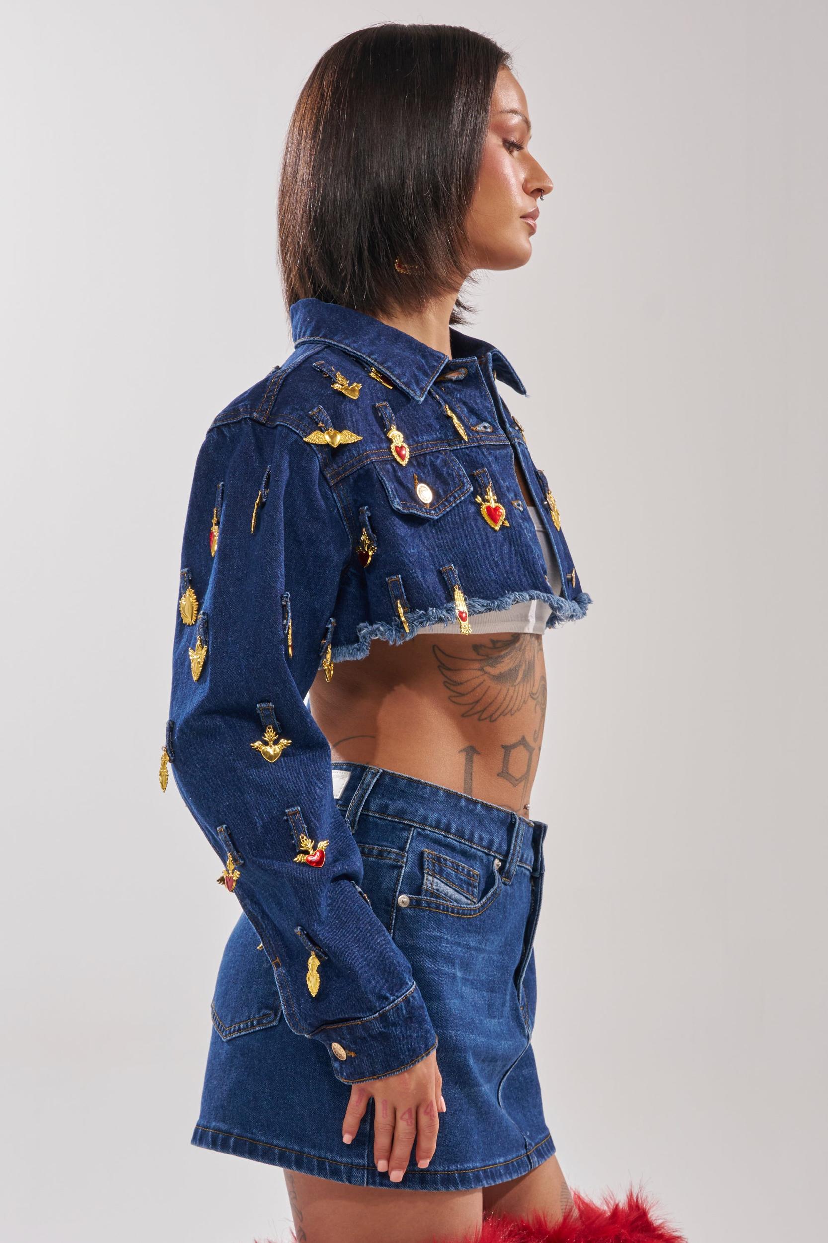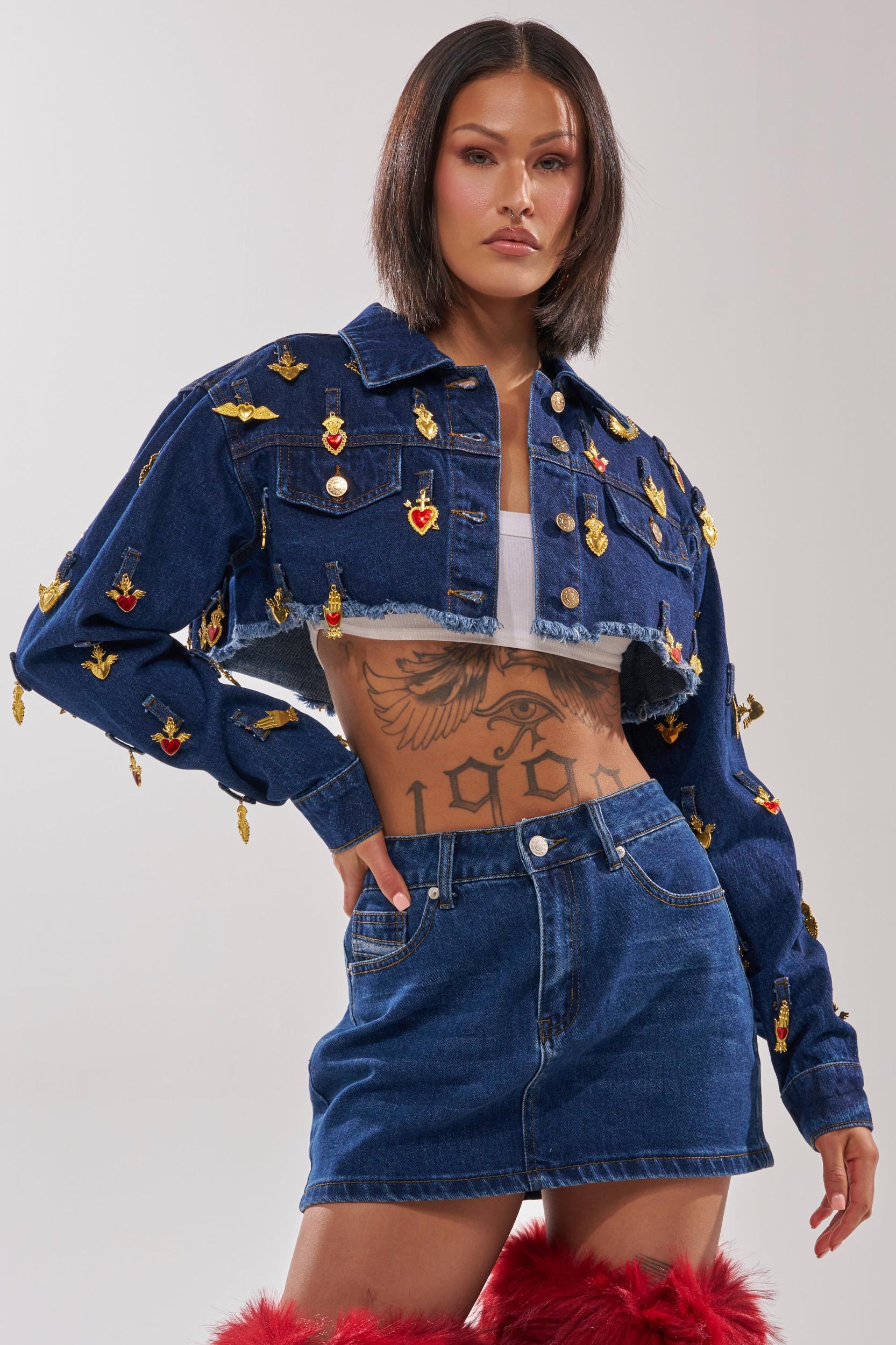The AKIRA Label Just a Crush Cropped Denim Jacket is guaranteed to steal hearts! This eye-catching cropped denim jacket delivers bold, fashion-forward flair with its deep indigo wash and intricate gold and red embroidered embellishments scattered across the front, sleeves, and back. The silhouette features front pockets, button enclosures in the front, functional belt loops along the hem, and an unfinished distressed hem. Pair with a matching dark denim jean for a put together look. - 100% Cotton- Spot Clean Only- No Stretch- Imported (all measurements are approximate from size small)- 10” Shoulder to Hem- 17” Shoulder to Shoulder- 23” Sleeves - Model is 5’7” and wearing size smallProduct ID: 1074926 (all measurements are approximate from size 1X)- 13” Shoulder to Hem- 20” Shoulder to Shoulder- 25” Sleeves Product ID: 1074930