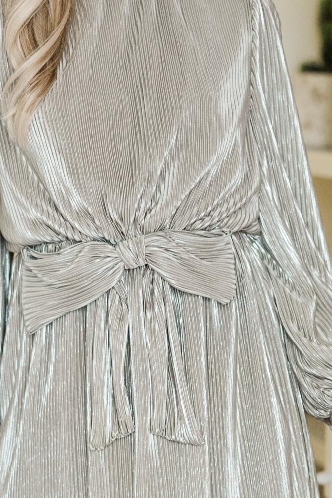 If you have been wishing for a draw dropping yet classic holiday party dress, then you are in luck! This shimmery beauty is going to be perfect for any holiday gathering! The bow detail around the waist is to cute and the pleated fabric gives this dress a wonderful flowy fit! Round neckline Zip back closure Long bubble sleeves Defined waist with bow detail Pleated fabric No stretch Baileigh is wearing the small.