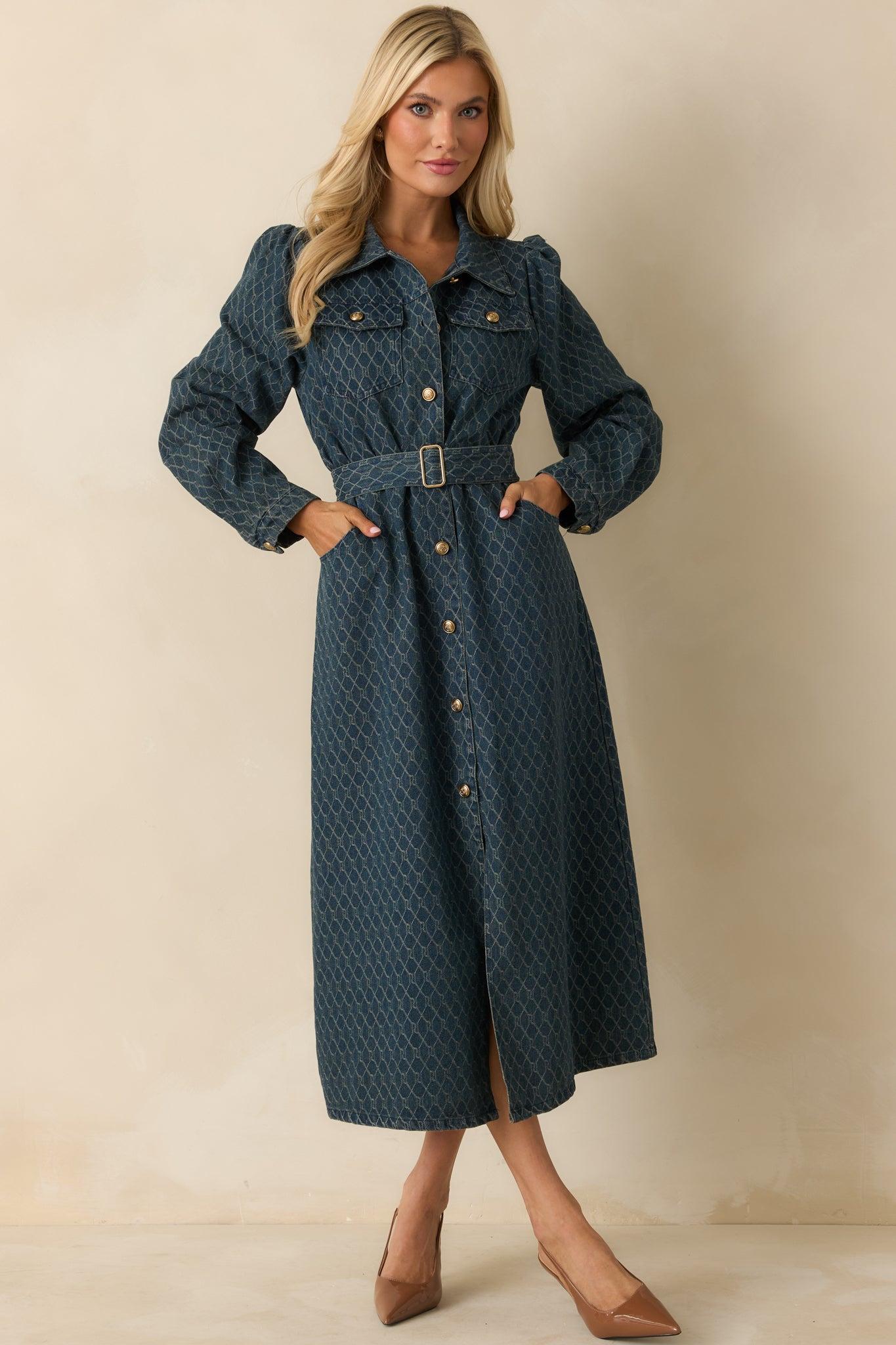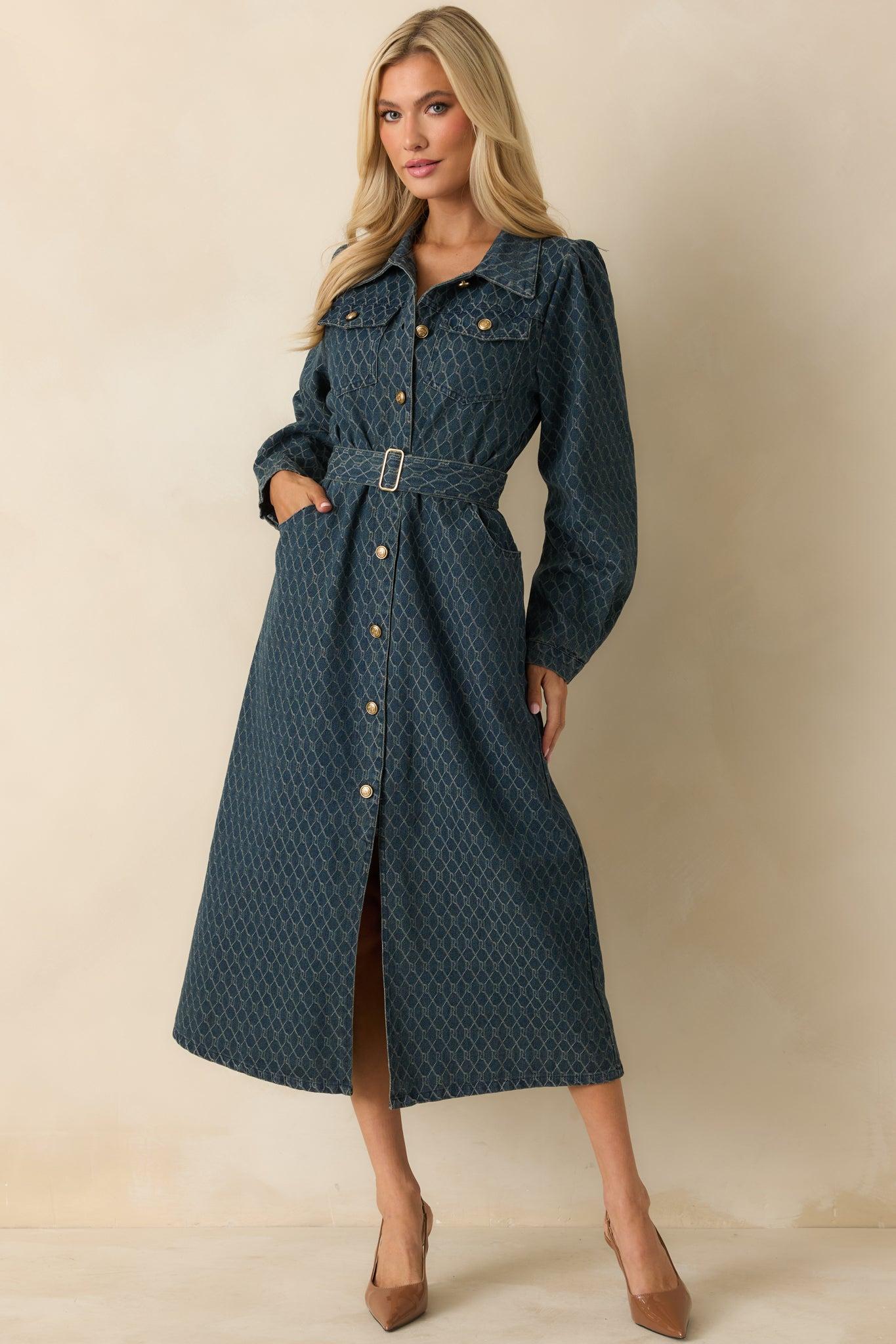The Just As I Said Blue Cotton Patterned Denim Belted Midi Dress delivers exactly the kind of understated confidence you want in a one-and-done look. Its structured denim, subtle pattern, and gold-tone buttons come together with ease, giving you a polished silhouette that speaks for itself. It’s the dress you reach for when you want to show up assured, effortless, and completely put-together — just as you said. This blue cotton denim midi dress features a collared neckline, long sleeves with buttoned cuffs, a full button-front placket, and gold-tone embossed buttons throughout. Front chest pockets, side pockets, and a removable self-tie belt add function and shape. Finished with a straight hem and a structured, midweight denim feel. Self: 90% Cotton & 10% Polyester Contrast: 100% Cotton Unlined Manufactured in China Designed in the USA Model is 5'8" and wearing size small, clipped, model is a true x-small
