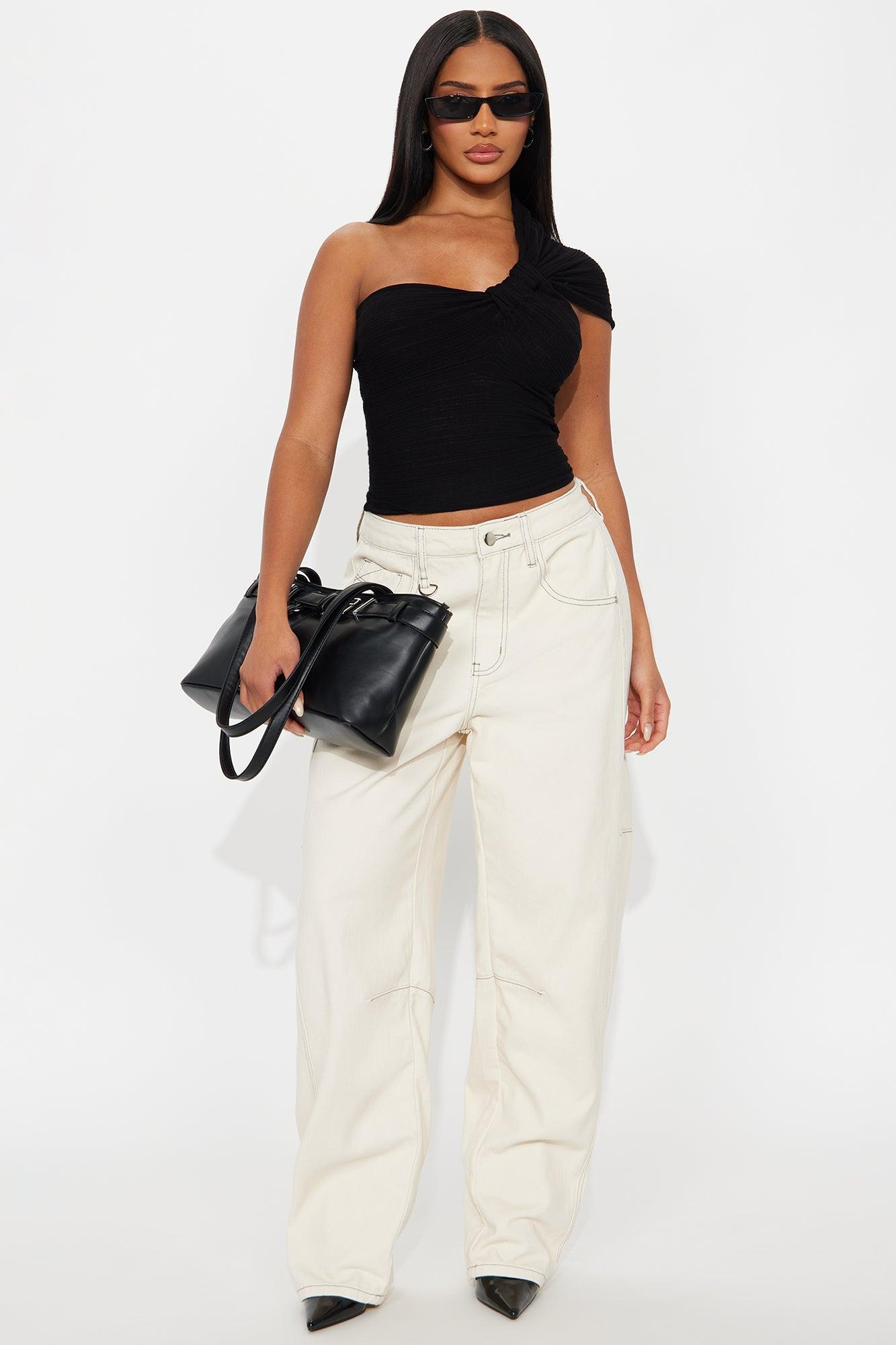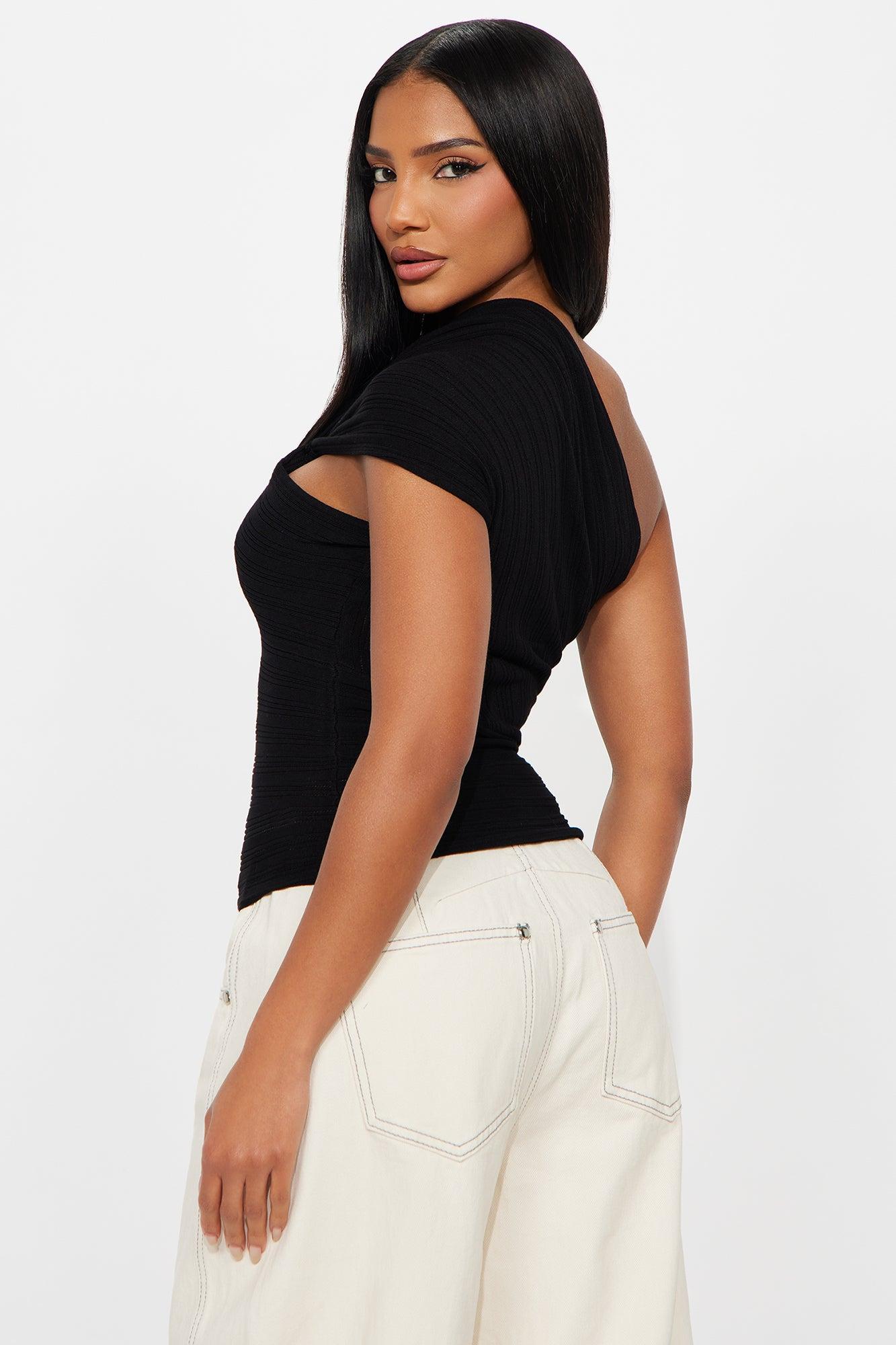 Available In Beige And Black. Pullover Sweater One Shoulder Knot Detail 80% Rayon 20% Nylon Imported