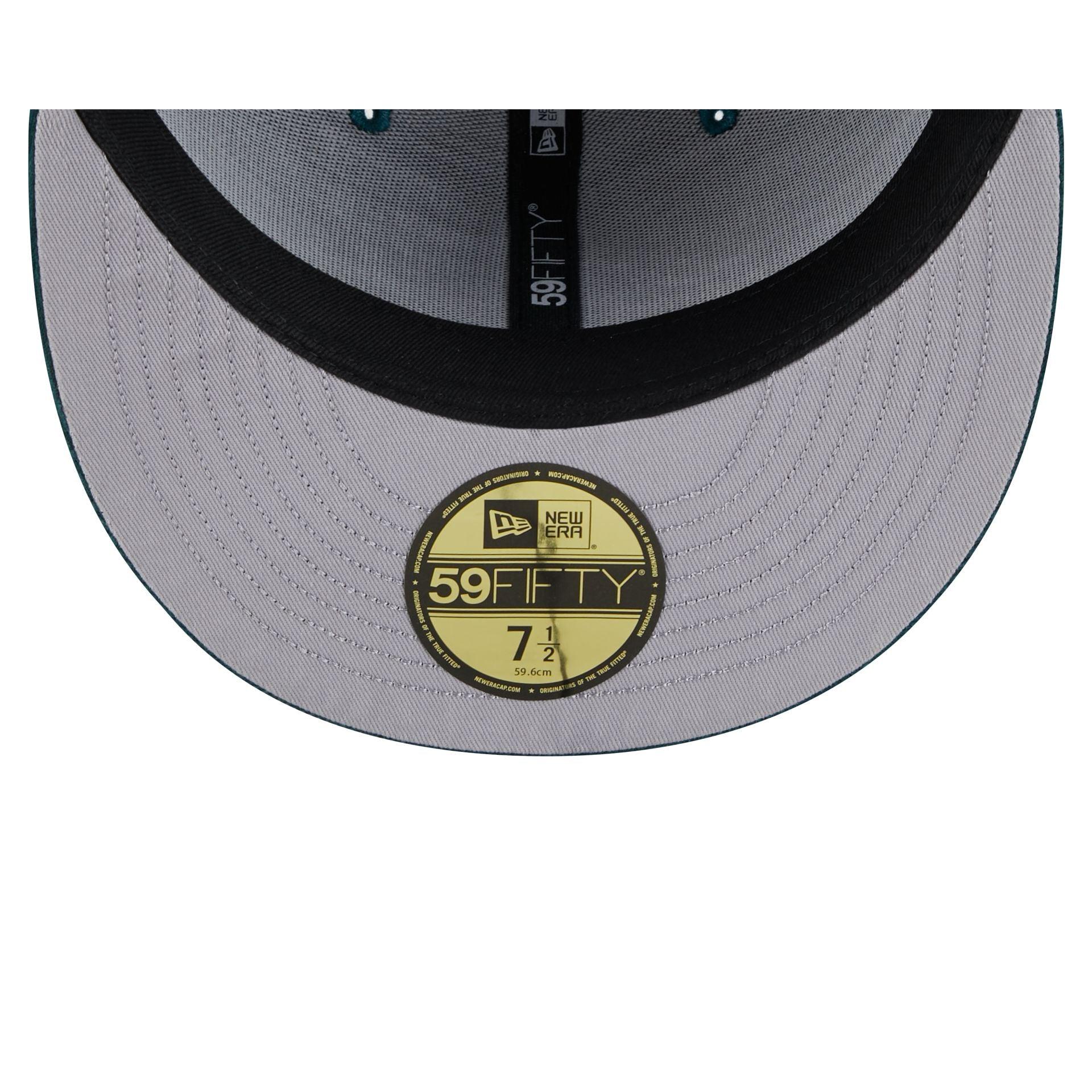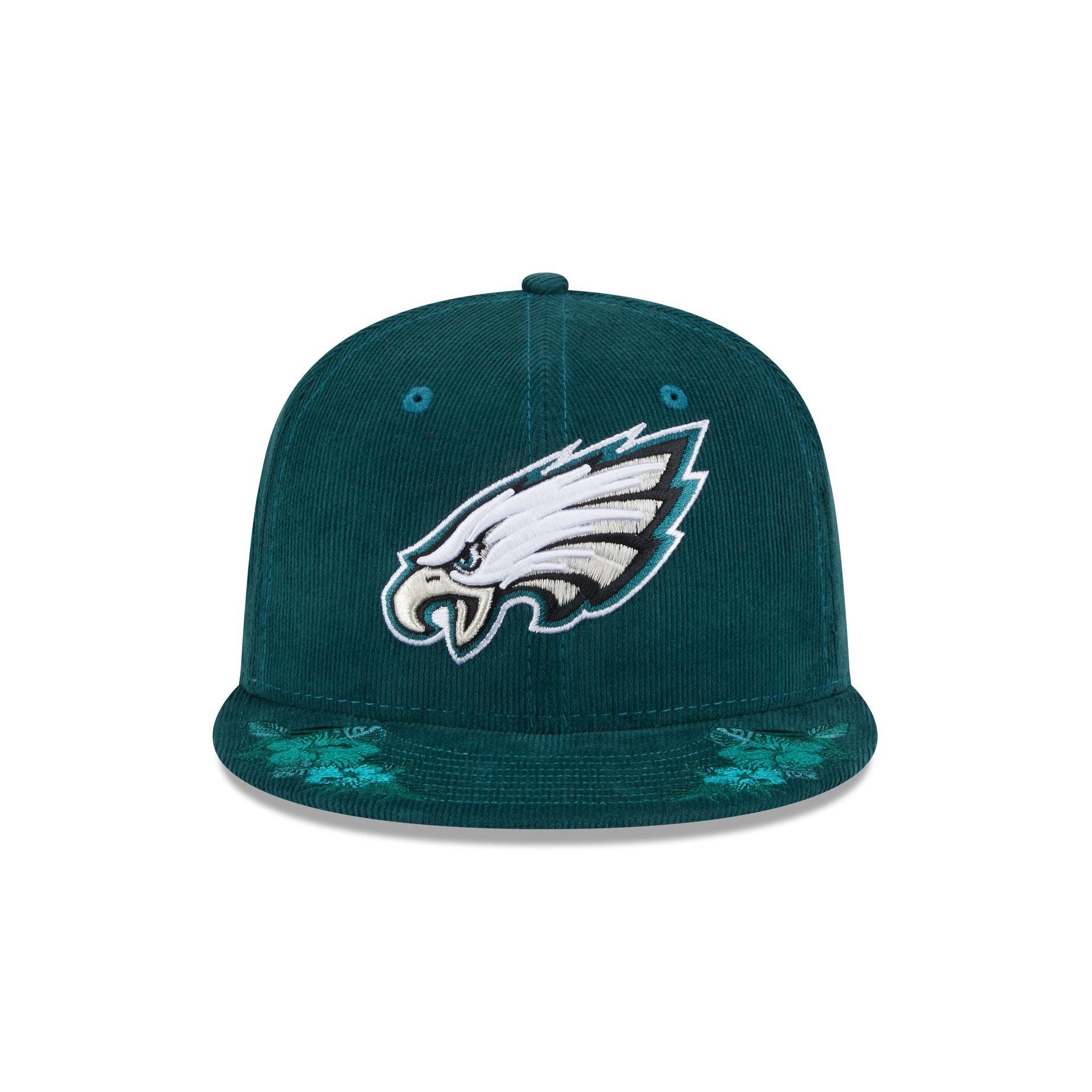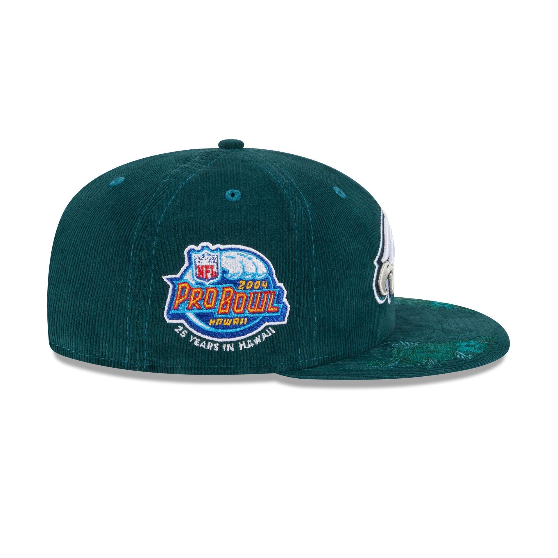 The Just Caps Floral Corduroy Philadelphia Eagles 59FIFTY Fitted Cap features an embroidered Eagles logo at the front panels against a corduroy fabrication with a matching NFL Shield at the rear. Additional details include embroidered flowers at the visor, a 2004 Pro Bowl patch at the right-wear side, and a gray undervisor.