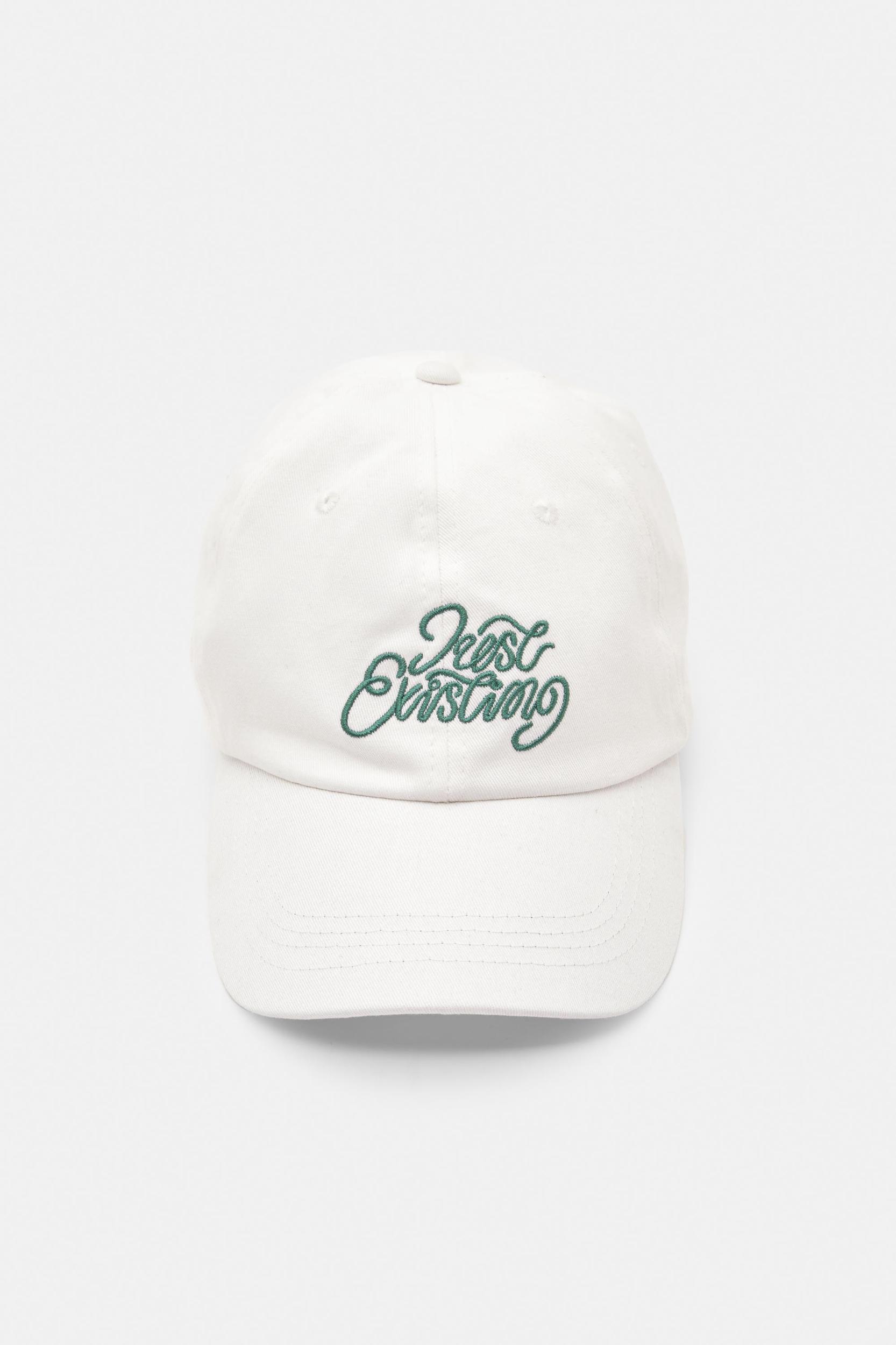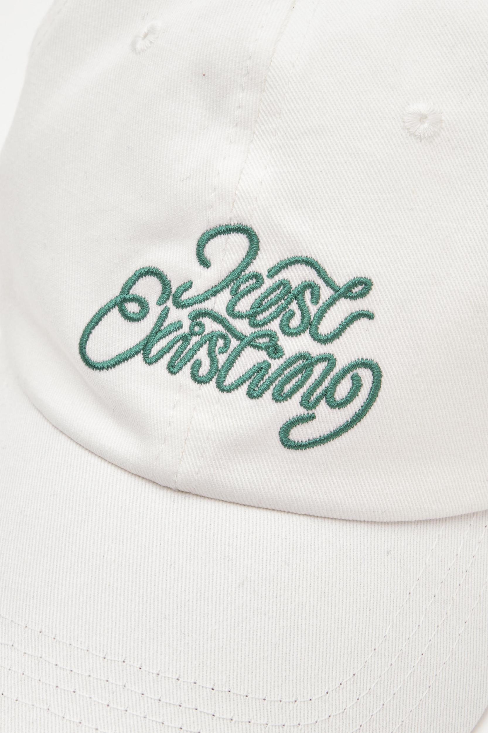 Cap with a curved peak and a ‘Just existing’ graphic on the front panel.