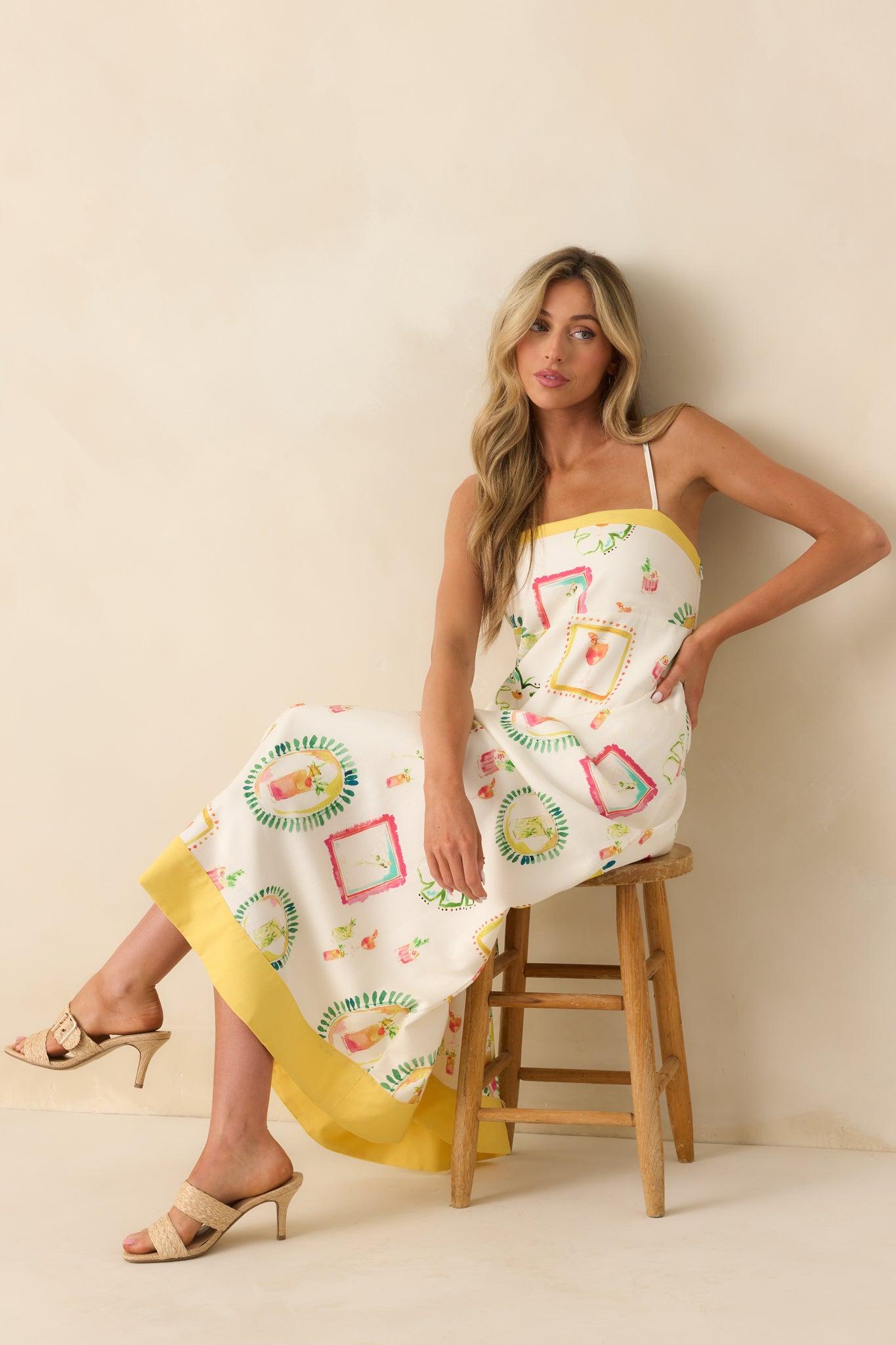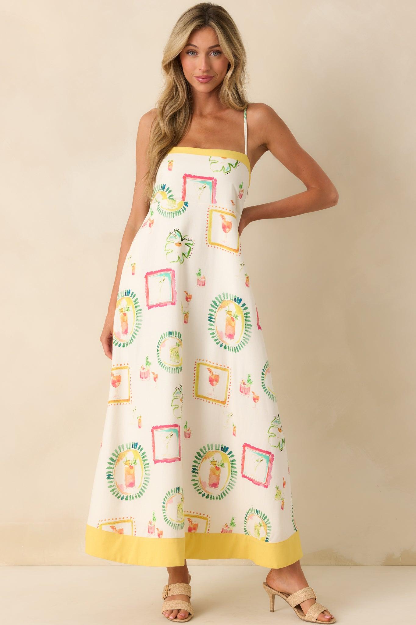The Just For Fun Ivory Watercolor Cocktail Print Linen Blend Maxi Dress is made for lighthearted plans and easy laughs. Playful and carefree, it’s the kind of piece you throw on when the only goal is to enjoy yourself. This ivory maxi dress features a lightweight linen blend fabric, a multicolor watercolor cocktail patchwork print, a square neckline, adjustable spaghetti straps, smocked back, yellow trim along the top and bottom hemlines, and functional pockets.