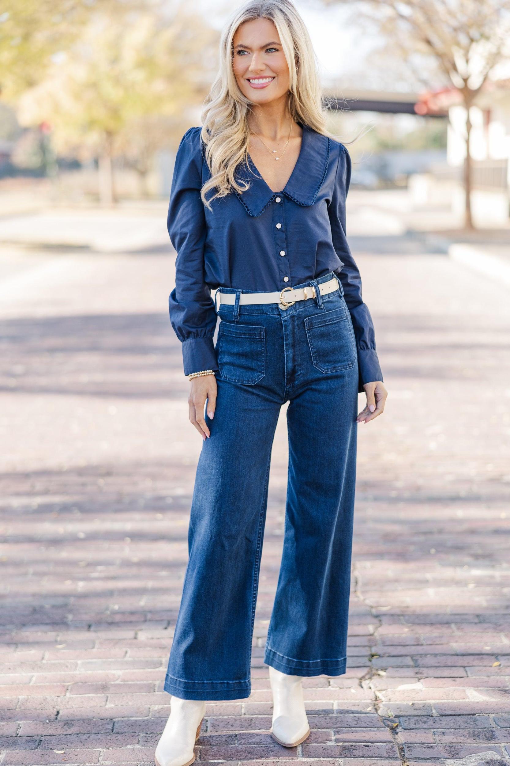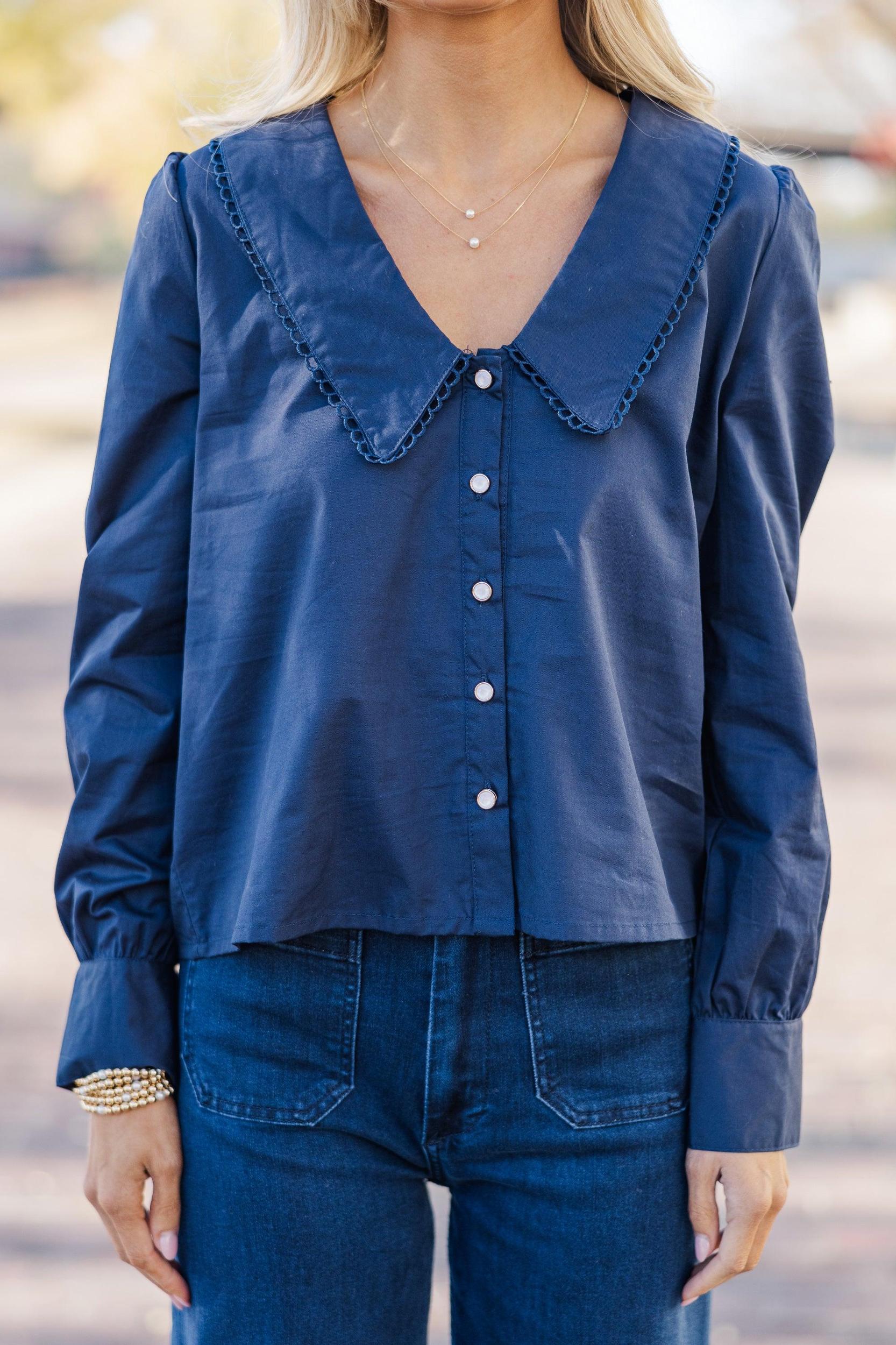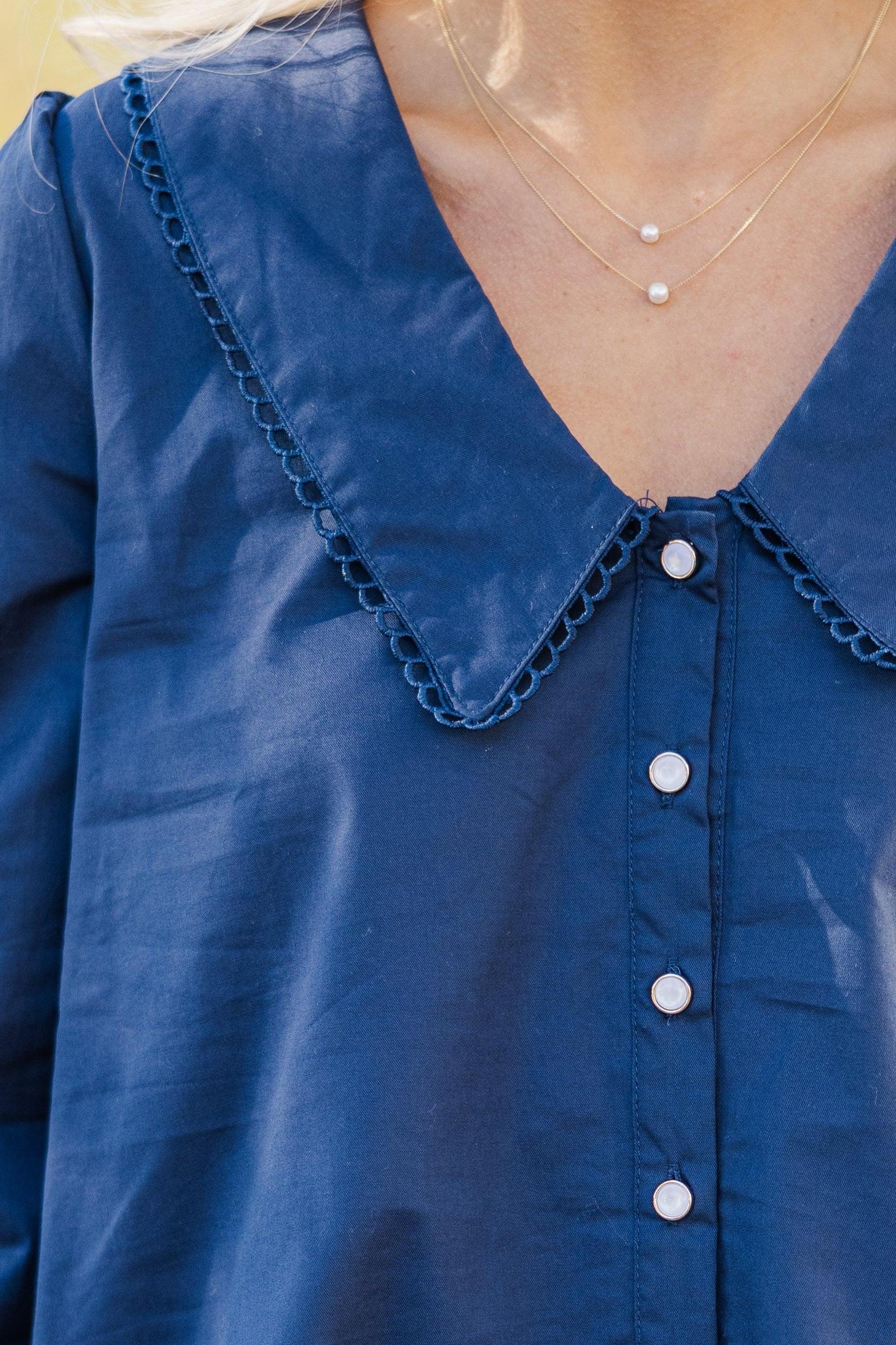 This blouse is perfect for you! It's effortlessly chic and classy. From the classic button down design to the feminine long collar with scalloped trim. This blouse is perfect for creating preppy looks that are timeless and trendy. V-neckline Long sleeves Button down front closure Long collar with scalloped trim No stretch Baileigh is wearing the small.