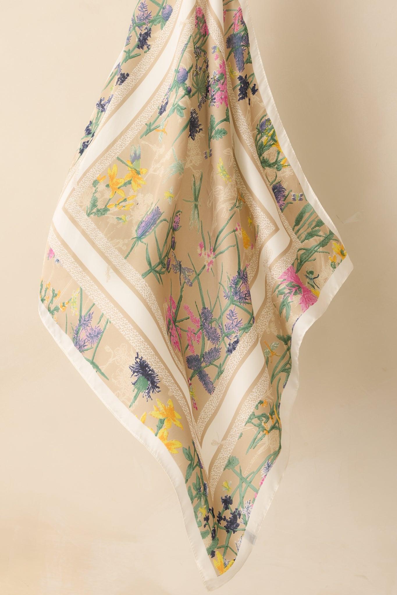 The Just Like We Planned Beige Multi Floral Print Satin Scarf brings your whole look together with ease, adding a polished and effortless touch every time you wear it. This beige scarf features a multicolor floral design, animal print border design, a square shape, and shiny satin finish.Scarf Measures: 26" x 26"100% Polyester Manufactured in China