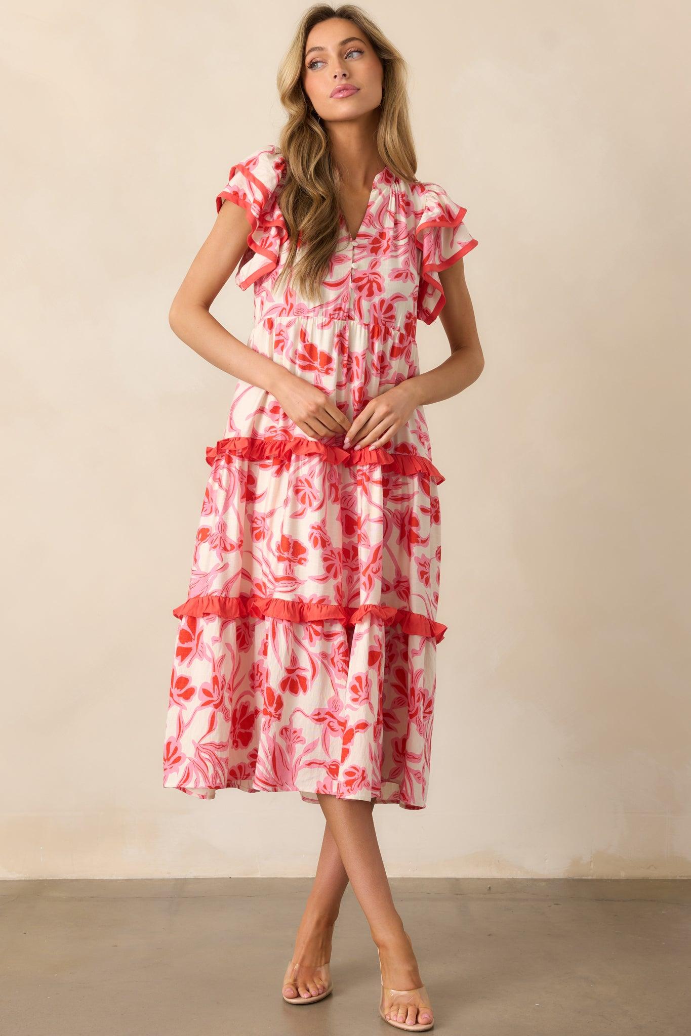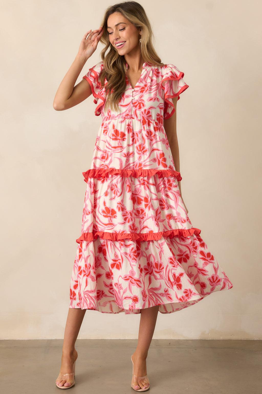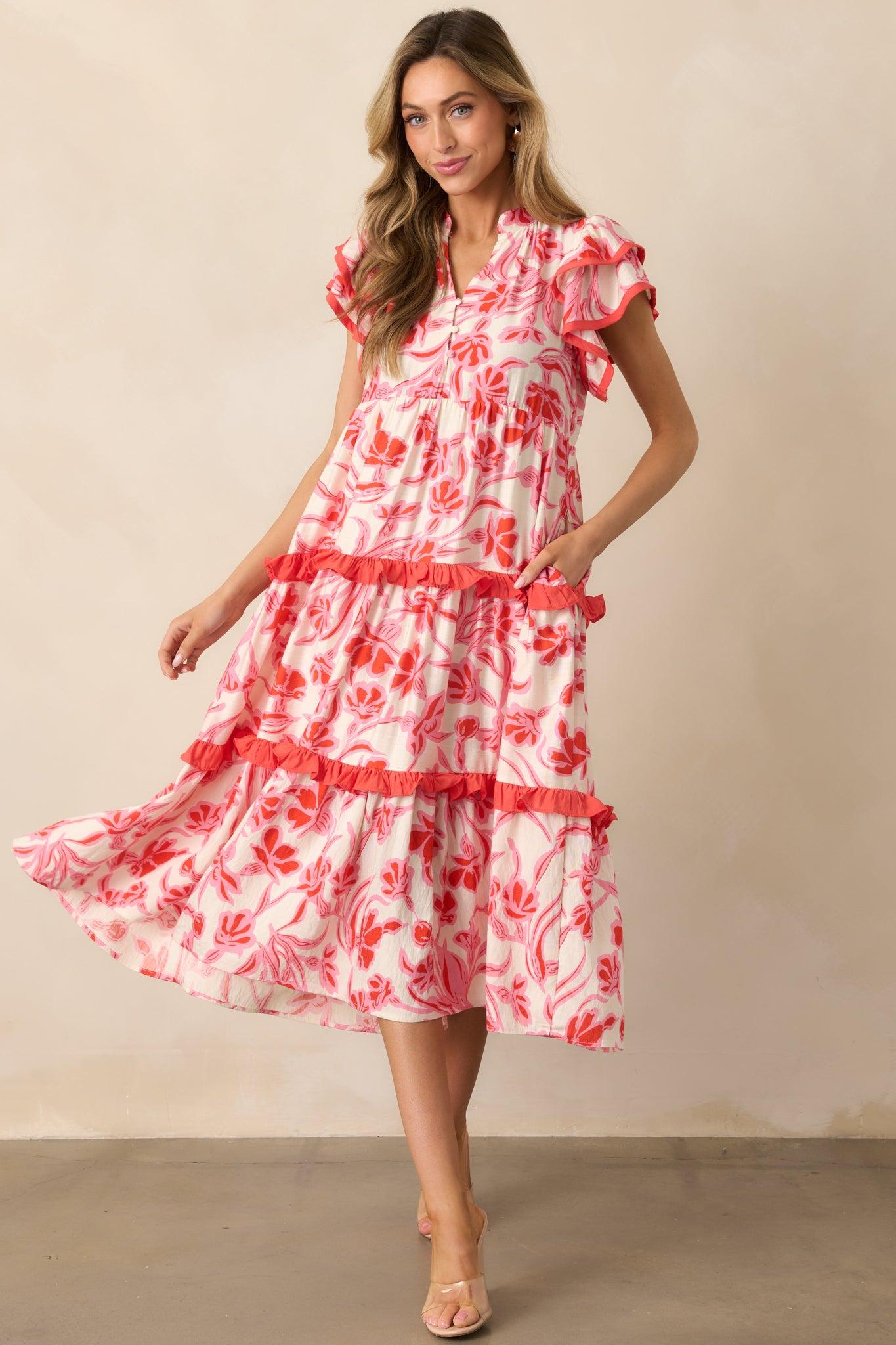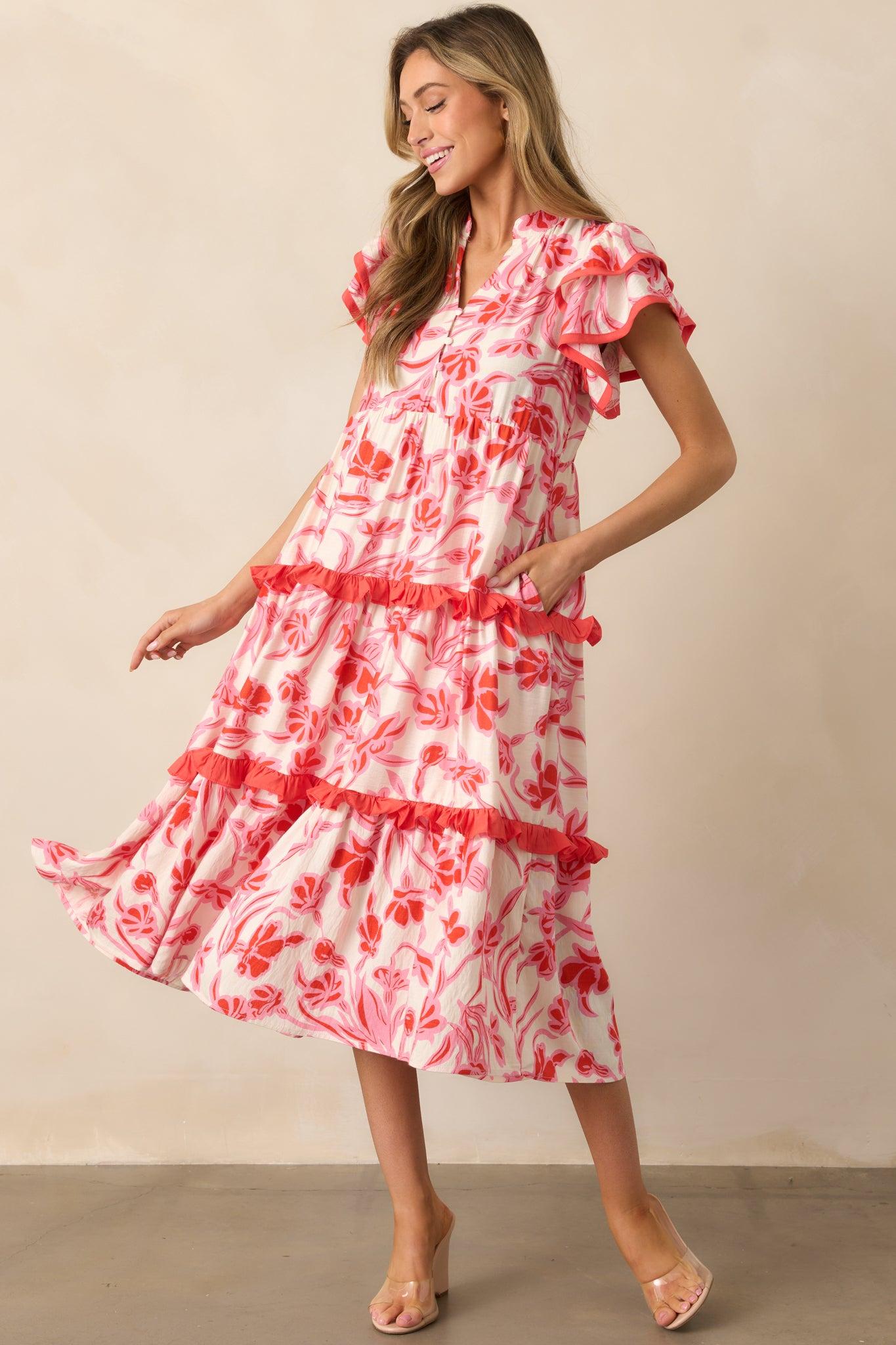 Bring charm to your wardrobe with the Just Right Pink Floral Flutter Sleeve Midi Dress. Perfect for casual celebrations or social gatherings, this dress offers a vibrant and elegant look that's sure to make you feel confident and radiant. This pink midi dress features a notch v-neckline with 3 functional buttons, short flutter sleeves, functional pockets, a tiered skirt, and red ruffle detailing.