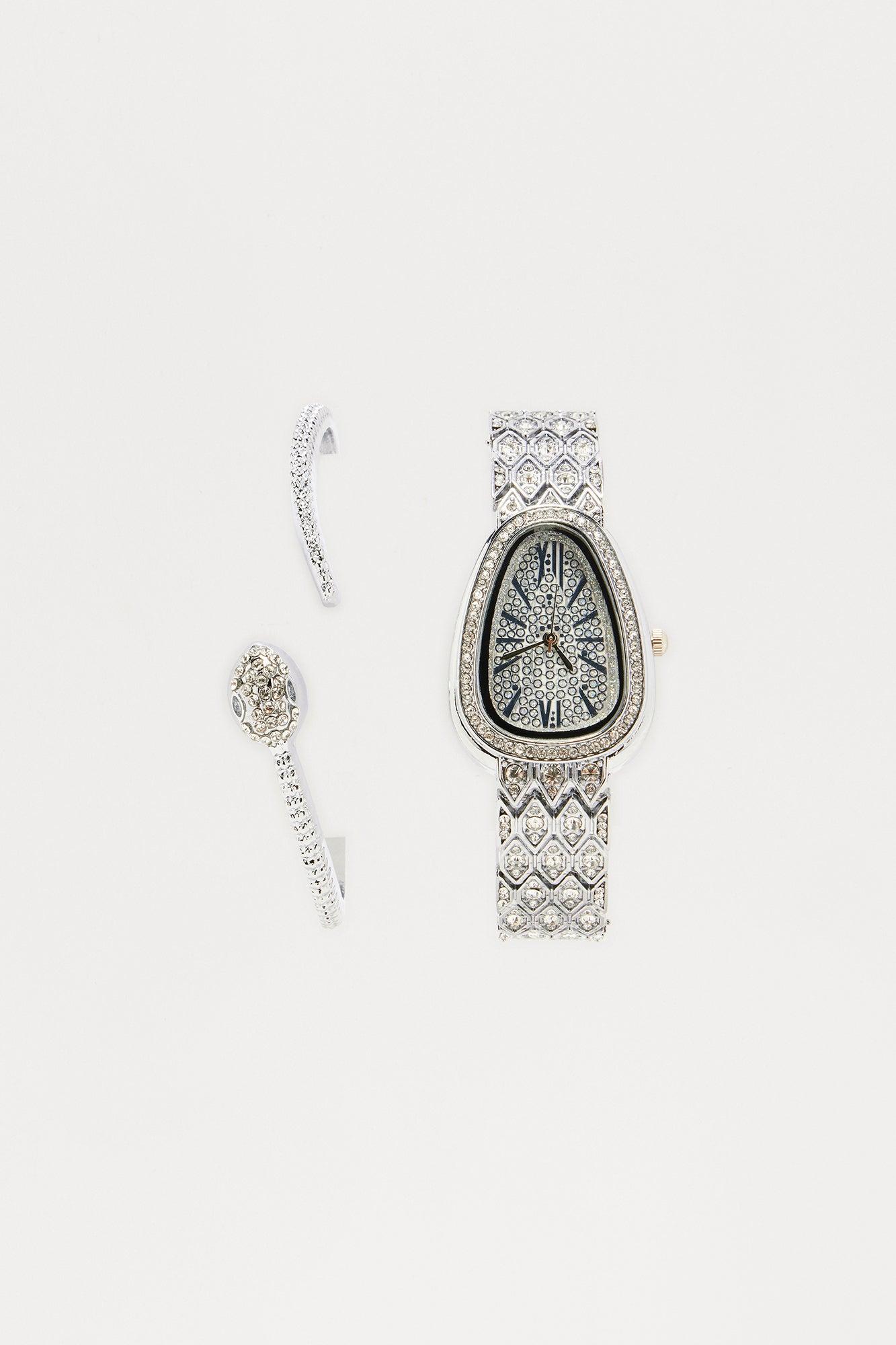 Available In Silver. 2 Piece Set Watch Snake Bangle Bracelet Rhinestone Detail Metal Imported California Proposition 65WARNING: Cancer and Reproductive Harm - www.P65Warnings.ca.gov.