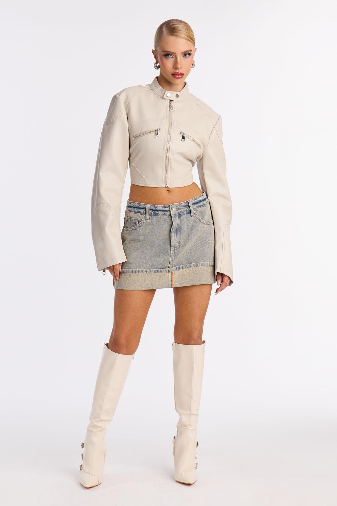 Available In Vintage Wash. Mini Skirt Button and Zipper Closure Mid Rise 5 Pocket Denim Rigid Non Stretch Disclaimer: Due To The Specialized Wash Process, Each Garment Is Unique. 100% Cotton Imported California Proposition 65WARNING: Cancer and Reproductive Harm - www.P65Warnings.ca.gov.
