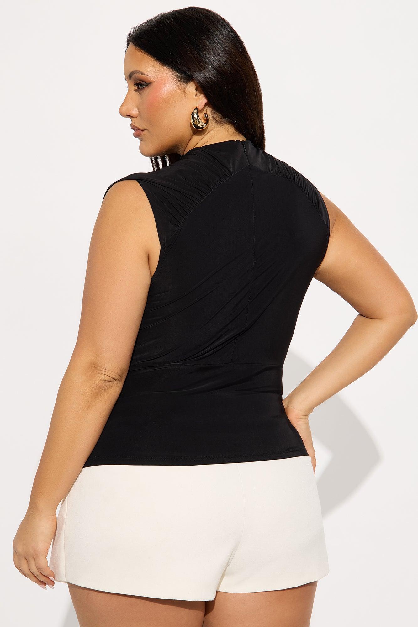 Available In Black And Stone. Top High Neck Short Sleeve Ruched Double Lined Front Invisible Back Zipper Stretch Self: 95% Polyester 5% Spandex Imported California Proposition 65WARNING: Cancer and Reproductive Harm - www.P65Warnings.ca.gov.