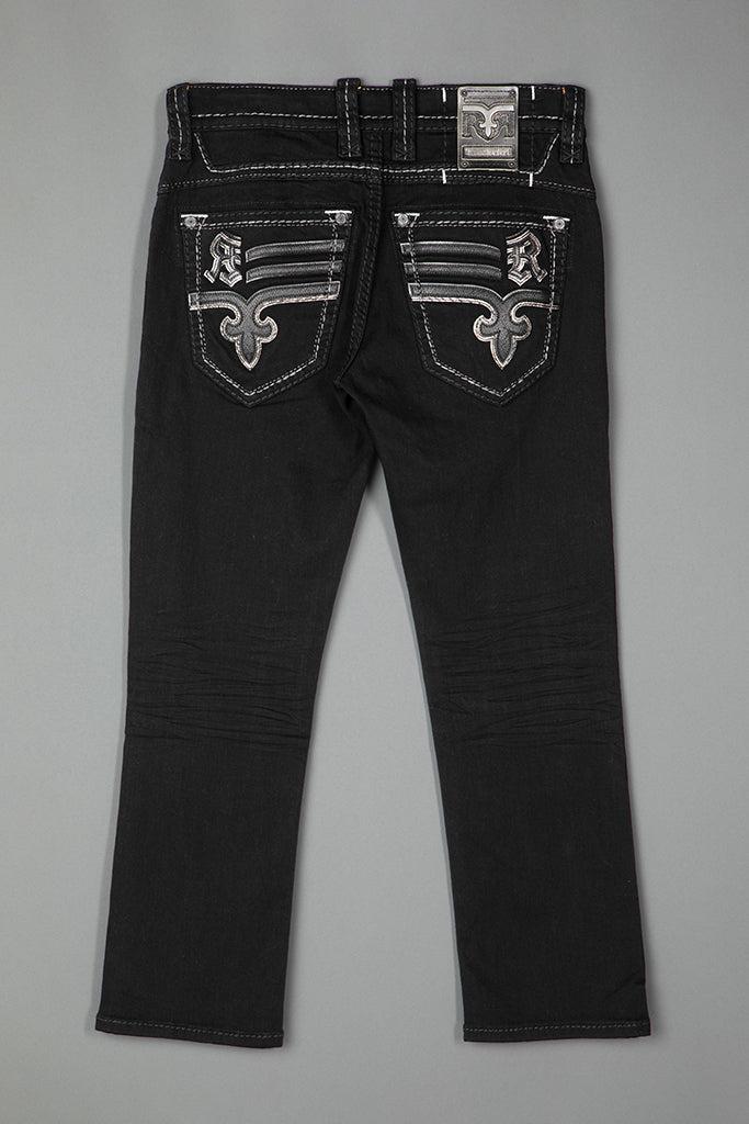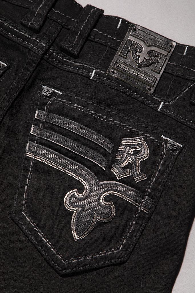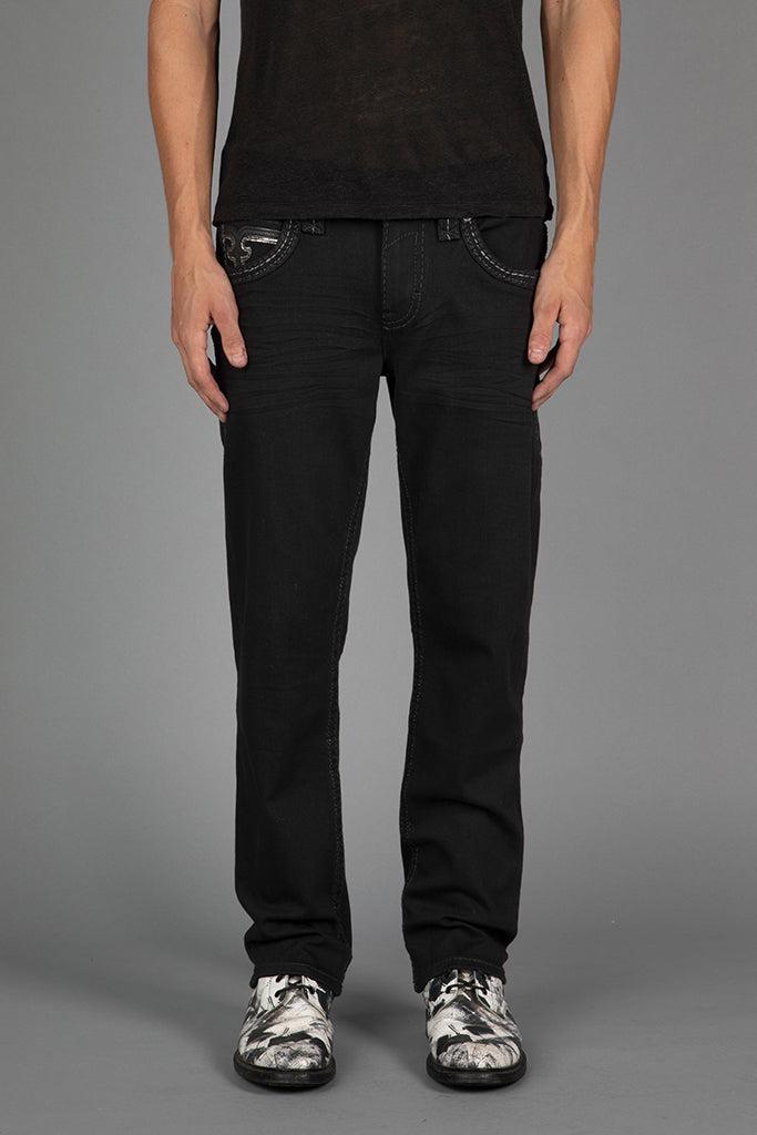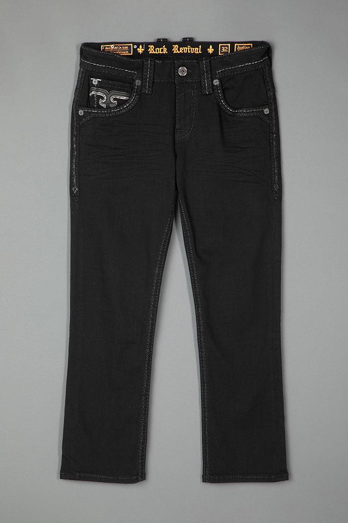 Justinn Straight Jeans by Rock Revival with a straight silhouette crafted in a black wash, designed in Los Angeles.