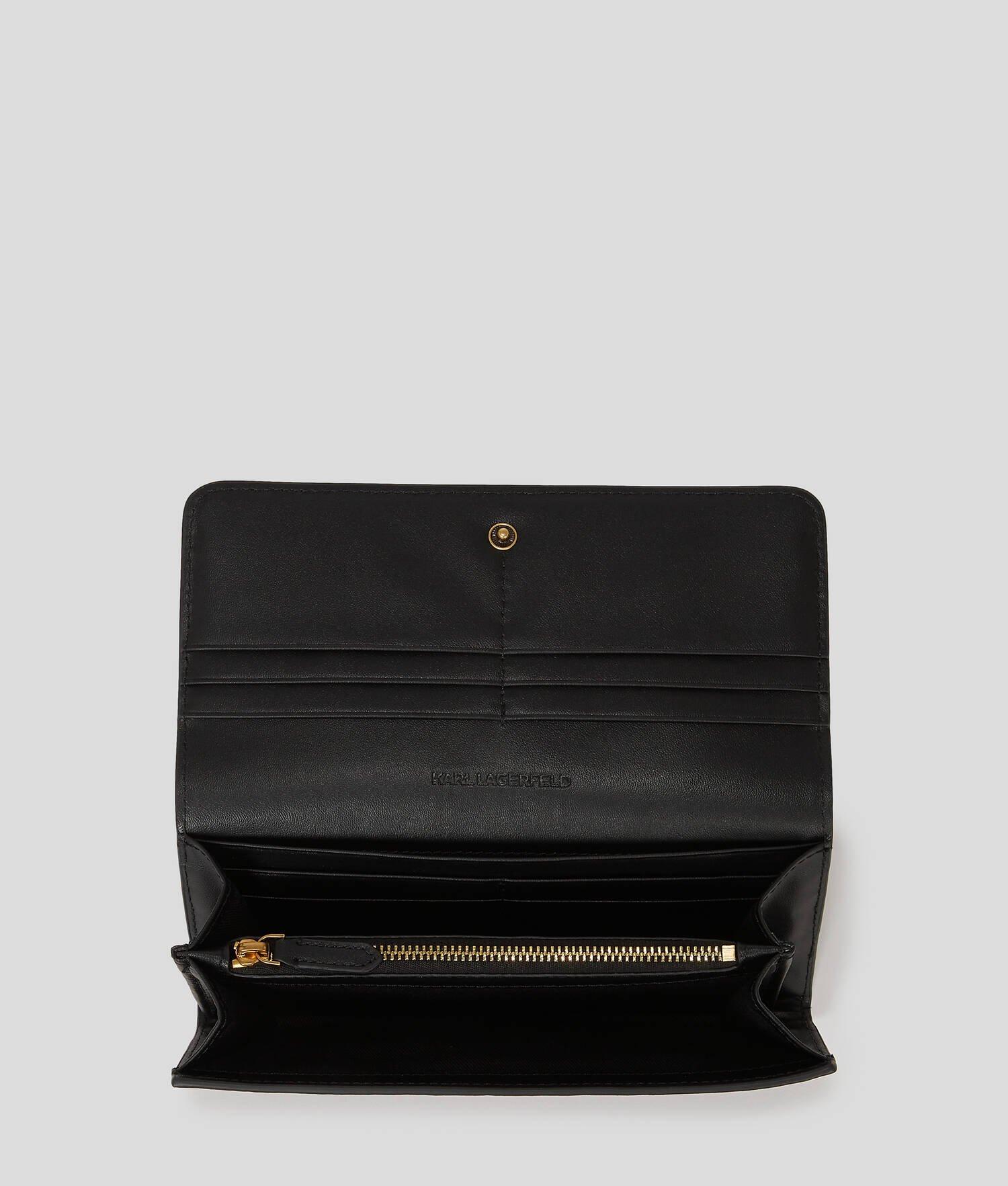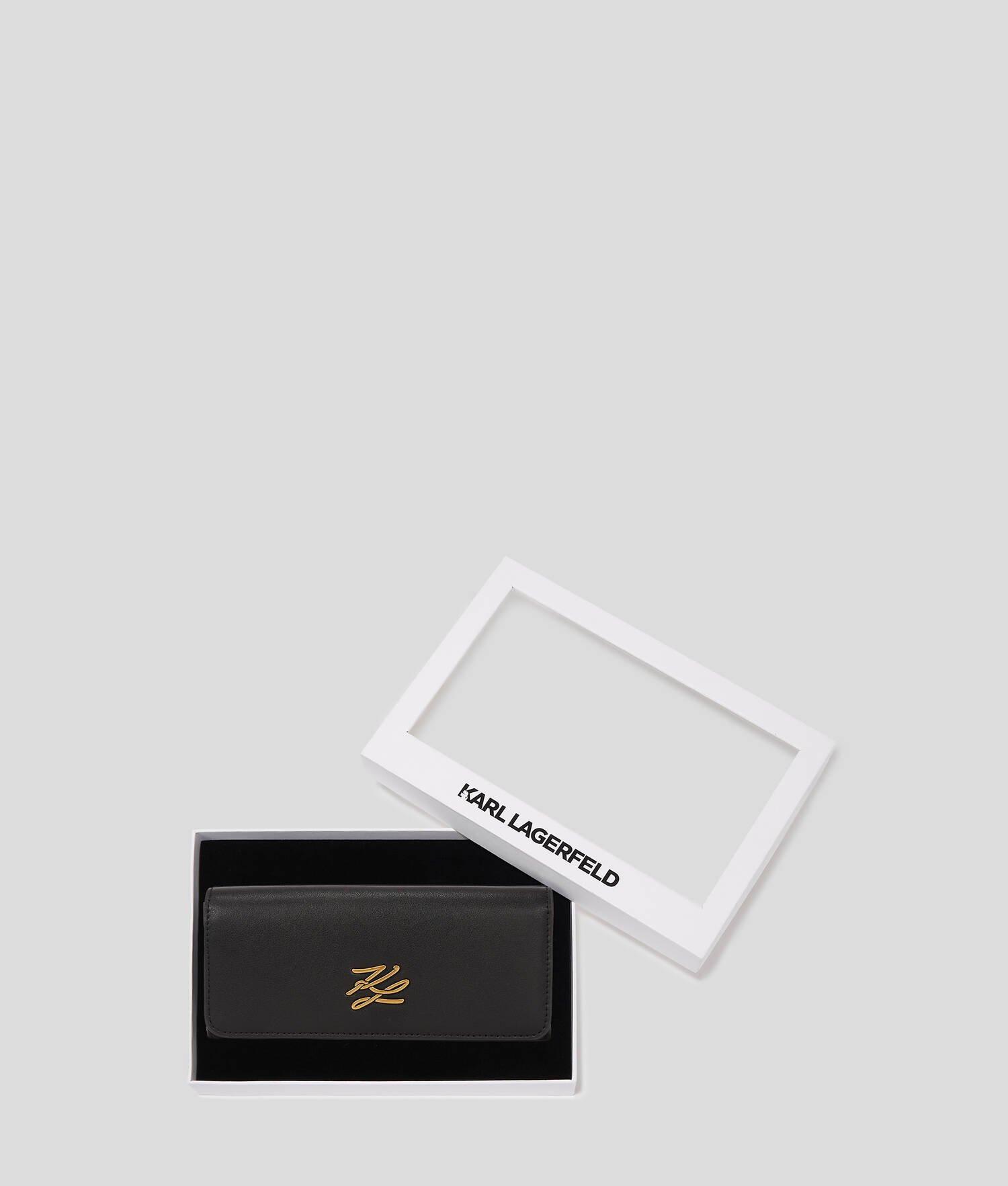 This wallet combines a large silhouette with a magnetic flap closure and multiple compartments and card slots, ensuring all your essentials are securely stored. A sophisticated KARL Autograph embellishment completes the elegant look.