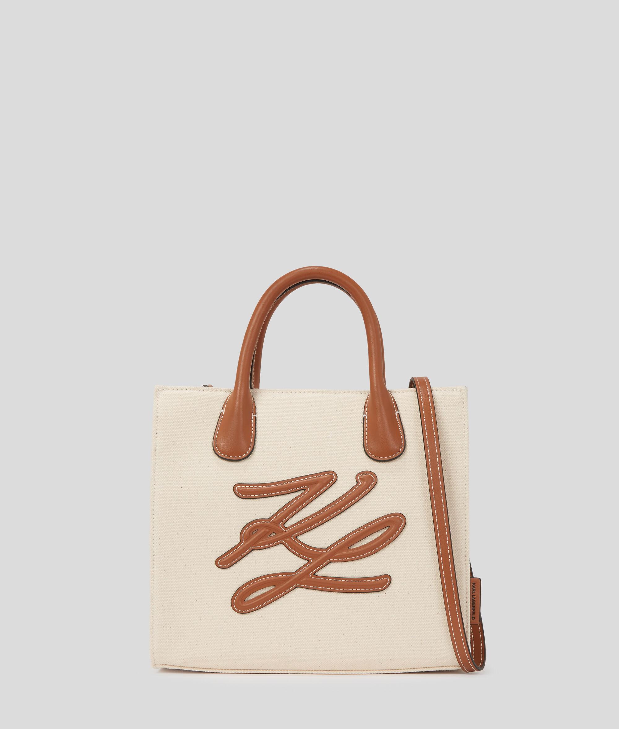 Introducing a striking square-shaped shopper that effortlessly combines functionality with style. Featuring sleek technical leather twin handles and a detachable crossbody strap, this piece showcases KARL Autograph artwork at the front, making it a standout accessory.
