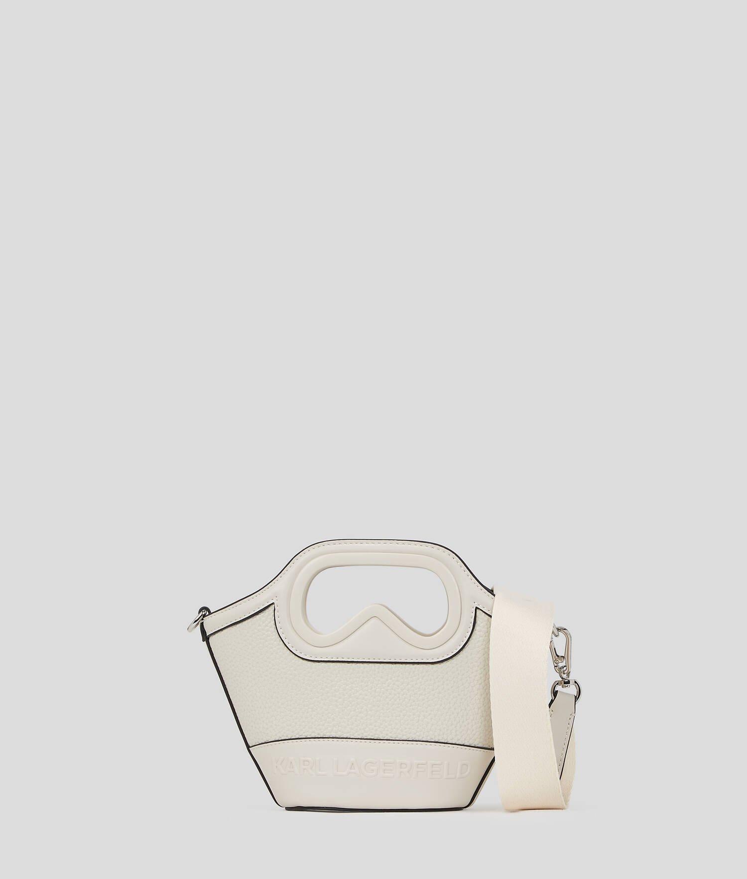 A bold tulip silhouette defines this mini tote bag, featuring striking sunglasses-inspired twin grab handles in honor of the legendary Karl Lagerfeld. An internal pouch with a drawstring closure enhances functionality, while a detachable webbing strap allows for versatile carrying. The tonal embossed logo adds a signature touch.