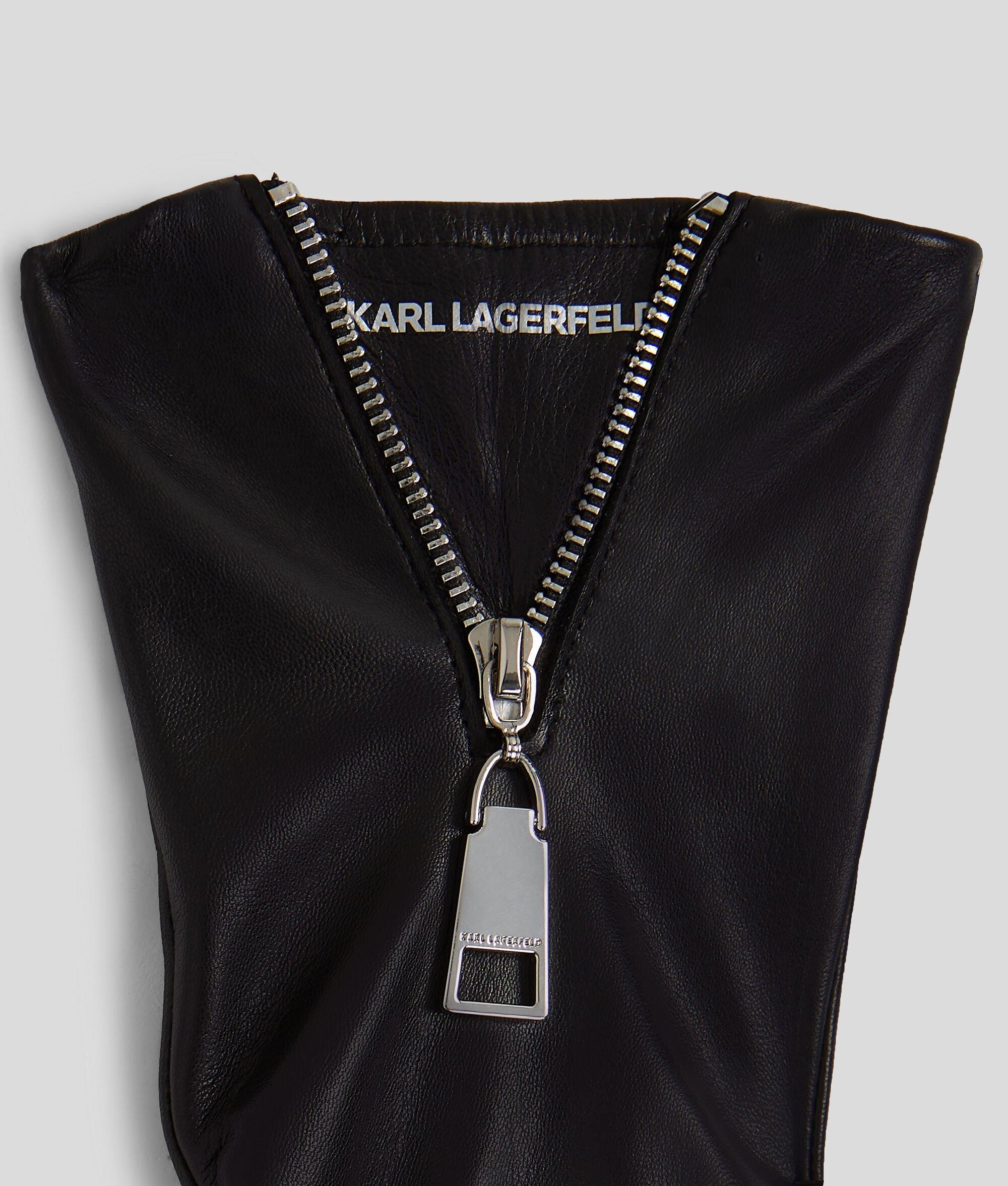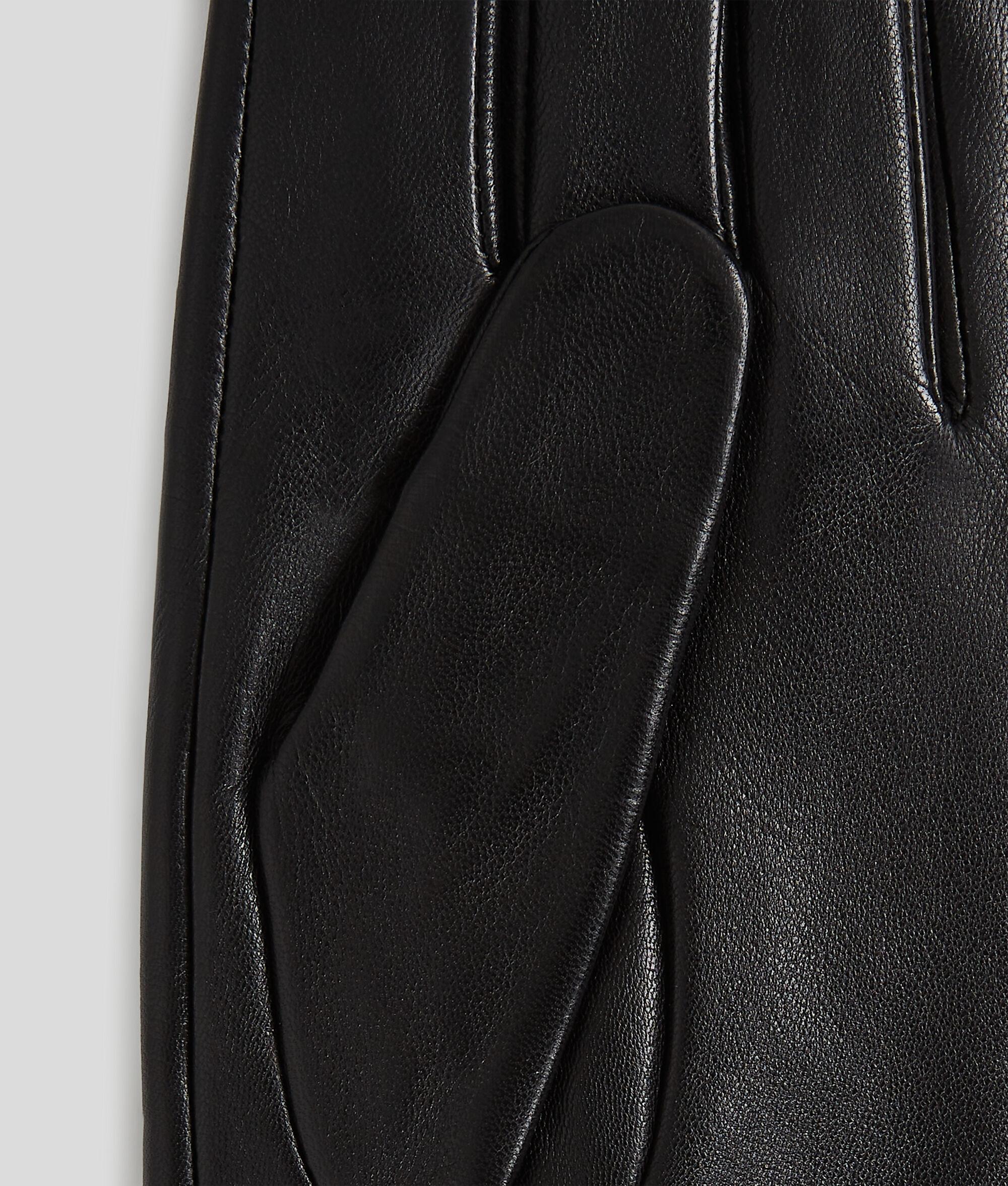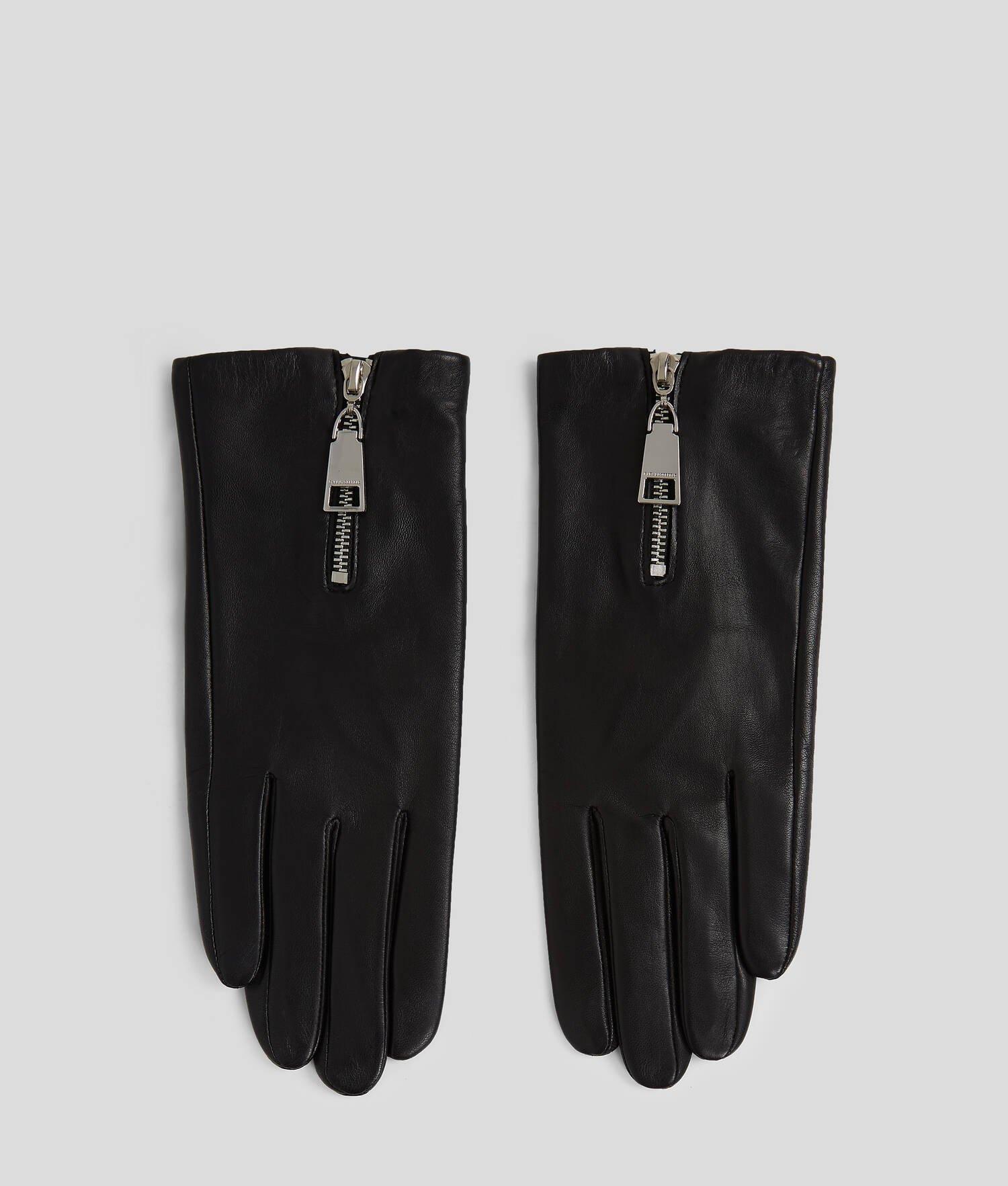Sleek and sophisticated, these gloves showcase a full-finger design, expertly fashioned from soft leather. An edgy zip-up closure adds a modern twist, while the discreet KARL LAGERFELD logo nestled inside the wrist cuffs adds a signature touch.