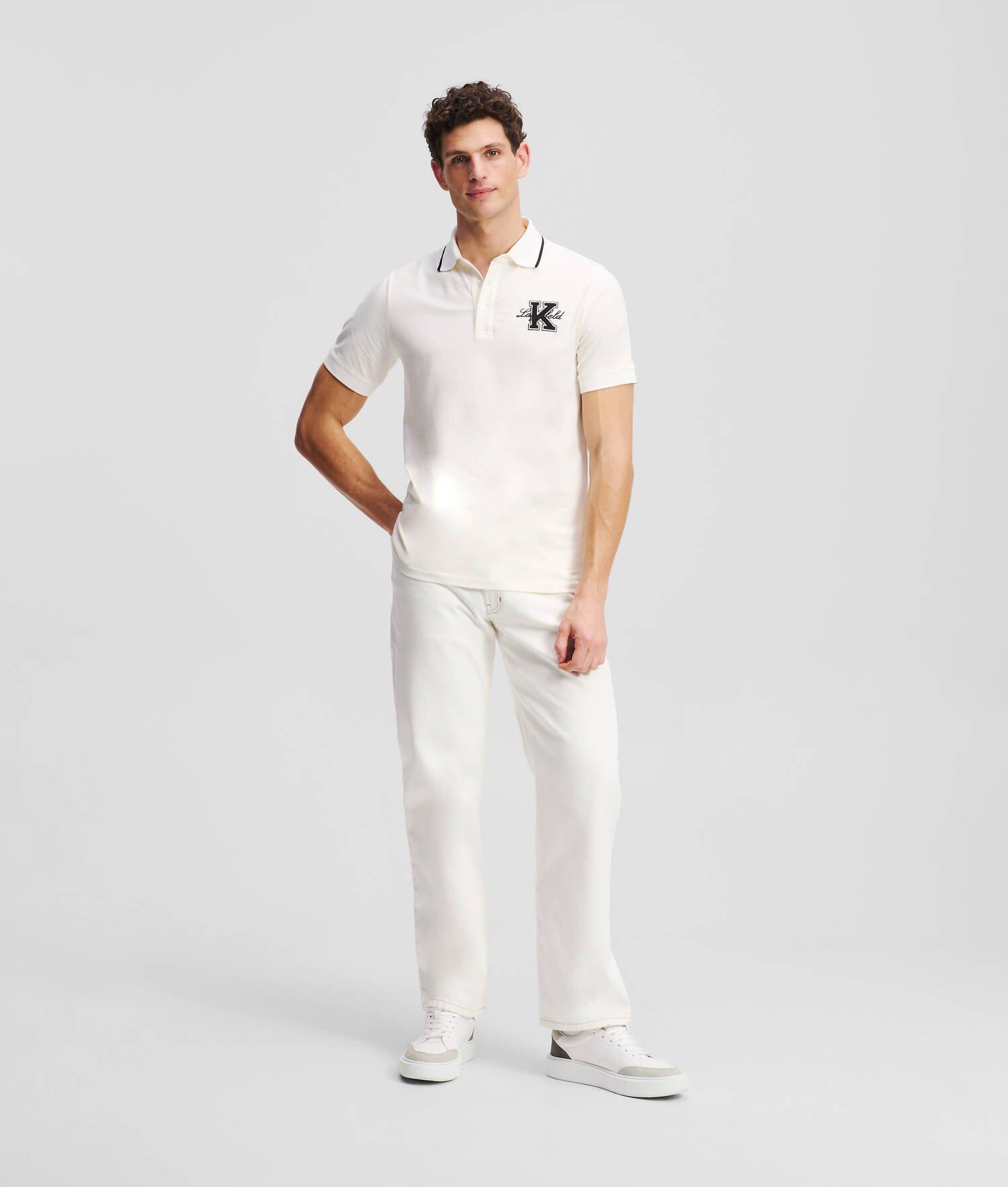 Elevate casual days with this polo shirt, featuring a pointed collar and a stylish button placket. Light ribbing at the cuffs and hem adds a refined touch, while the bold K-initial artwork at the chest makes a statement. Contrast detailing at the collar enhances its contemporary appeal.