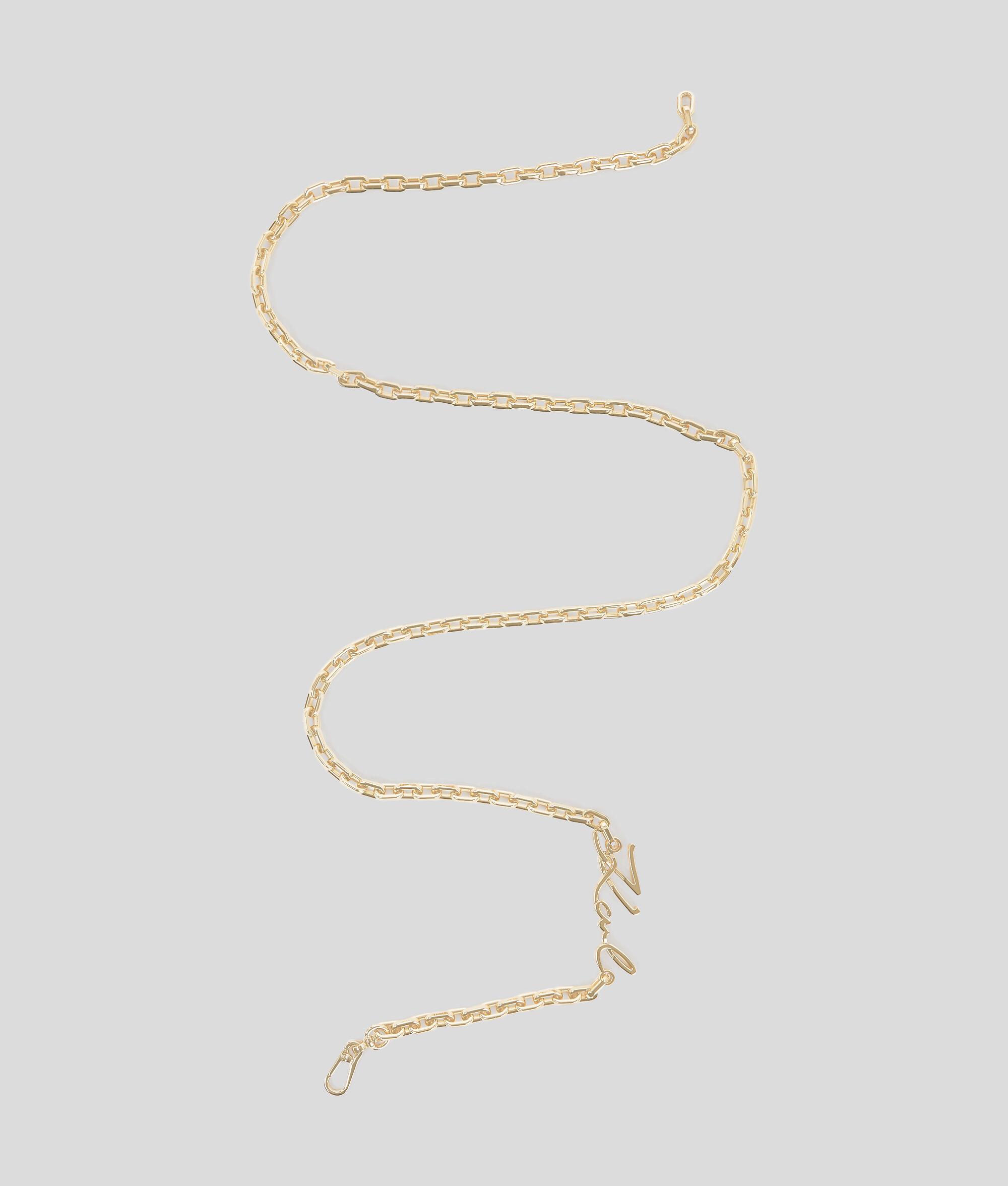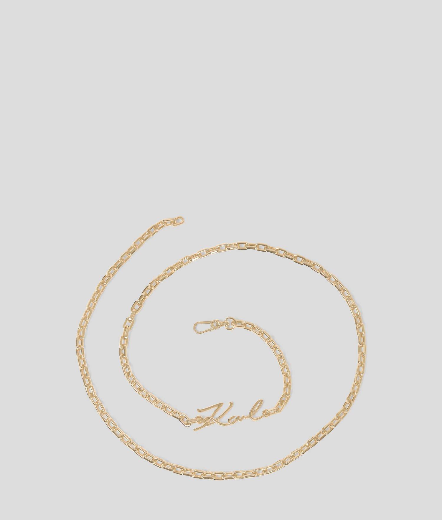 Elevate any outfit with this gold-toned chain belt embellished with an elegant KARL Signature charm. Style yours to cinch the waist of casual shirts to add edgy polish to eveningwear.