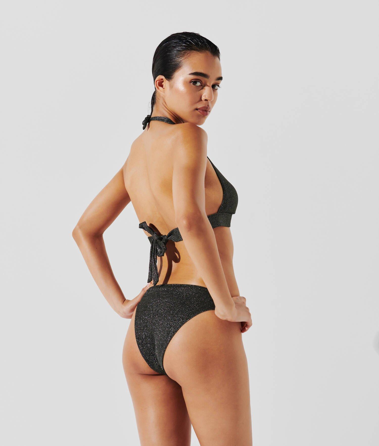 Glisten against the sun in this glamorous bikini top crafted from shimmering fabric with a KARL Signature ring at the center. Self-tie halter neck straps offer a customizable fit, while the wide chestband ensures support and comfort. Pair with the matching bikini bottoms for a sleek poolside look that commands attention.