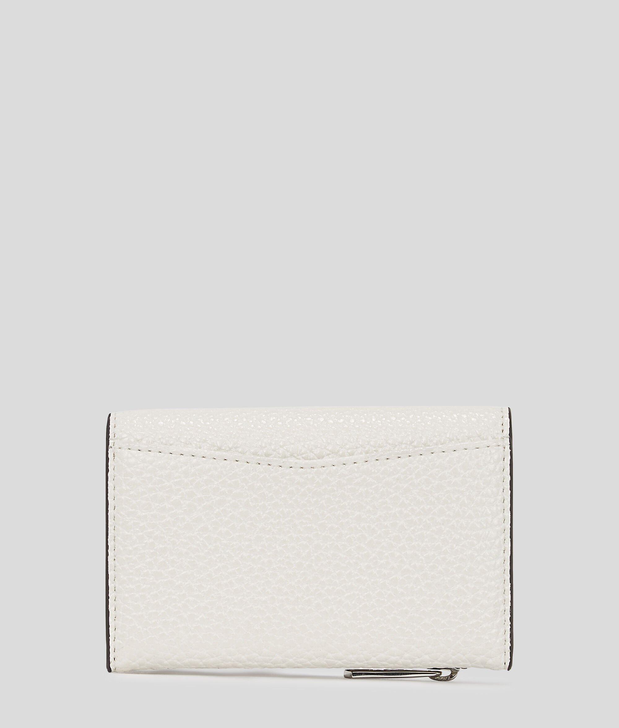 Introducing a petite bifold wallet that effortlessly combines style and functionality. It features a secure button closure, a zipped compartment and multiple card slots. Adorned with 3D Karl Signature artwork, it’s a statement accessory for any occasion.