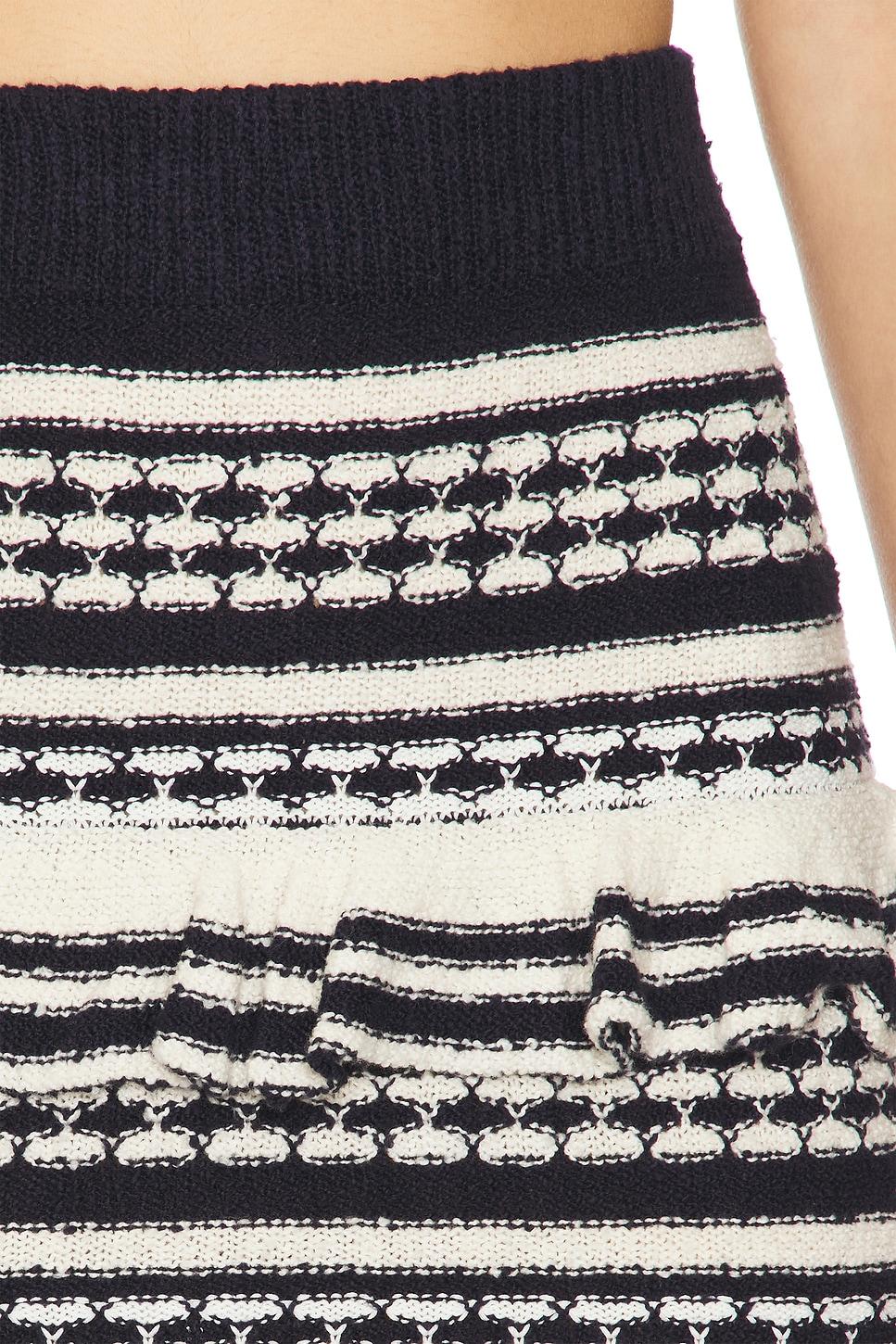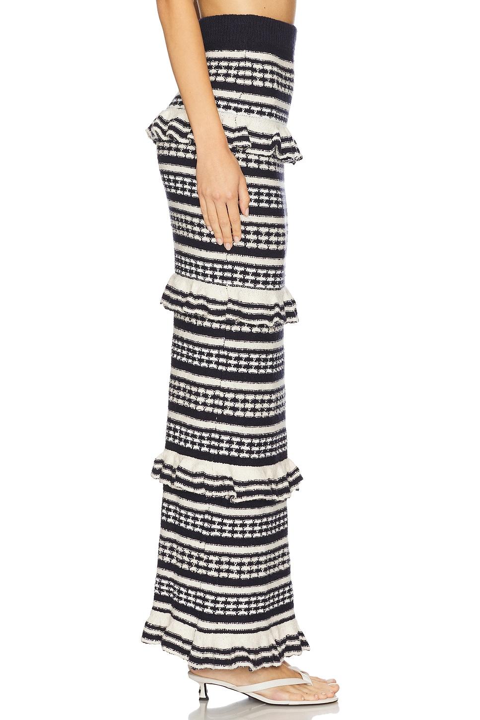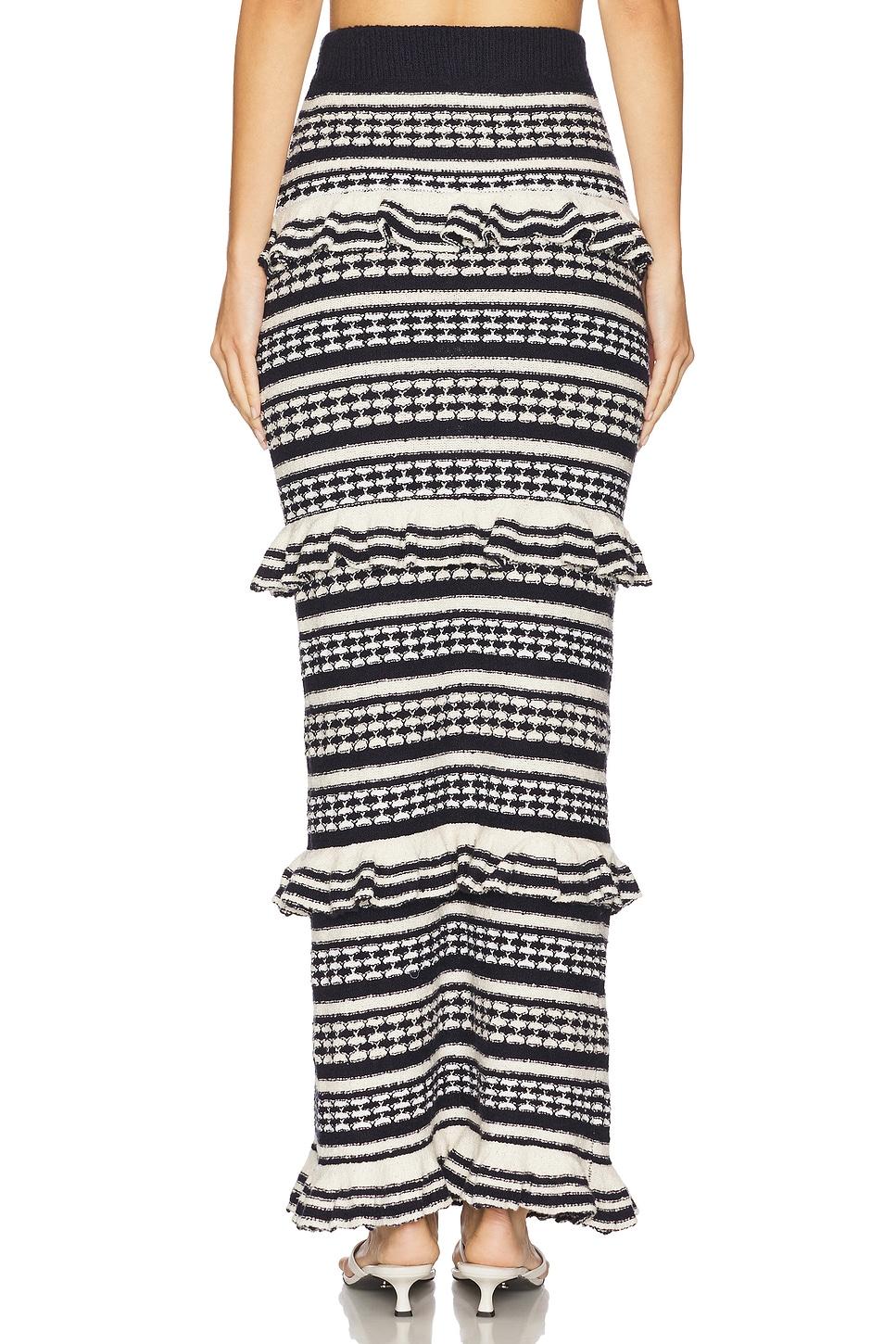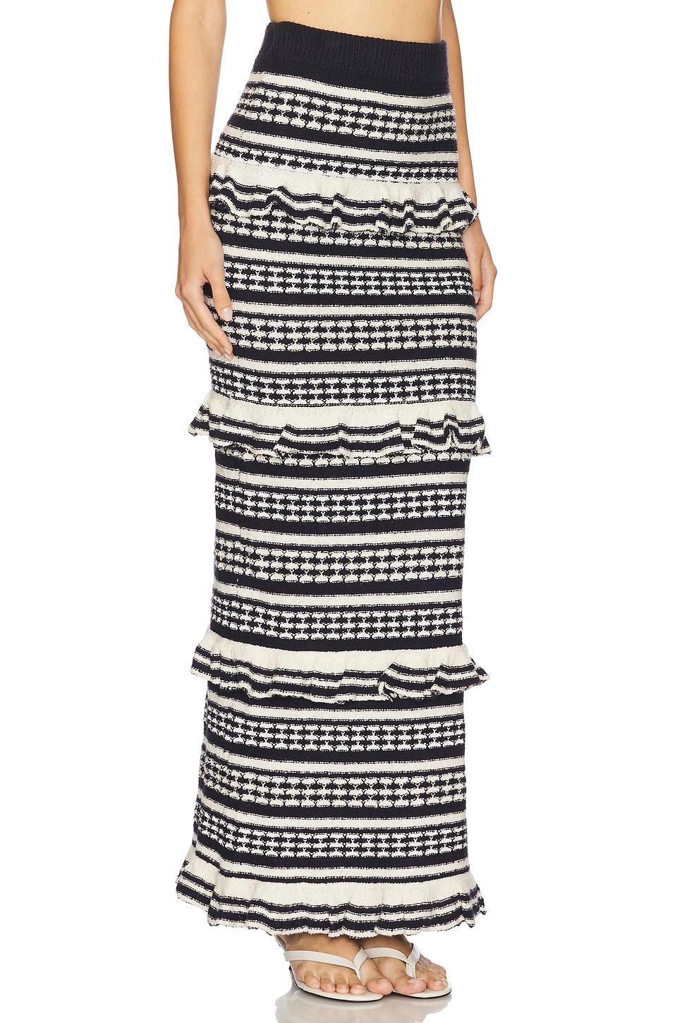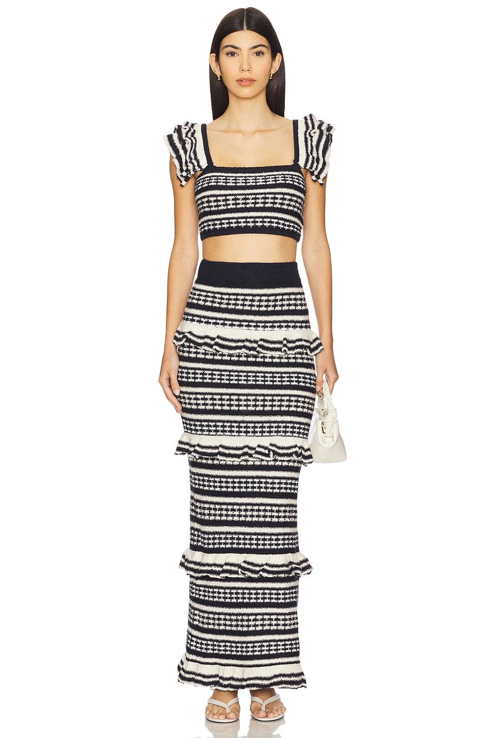 81% cotton, 19% nylon. Dry clean only. Unlined. Pull-on styling with elastic waistband. Midweight knit fabric with ruffled trim. Item not sold as set. Skirt measures approx 44.5" in length. Made in China. Revolve Style No. TULA-WQ302. Manufacturer Style No. TRQ227 S24.