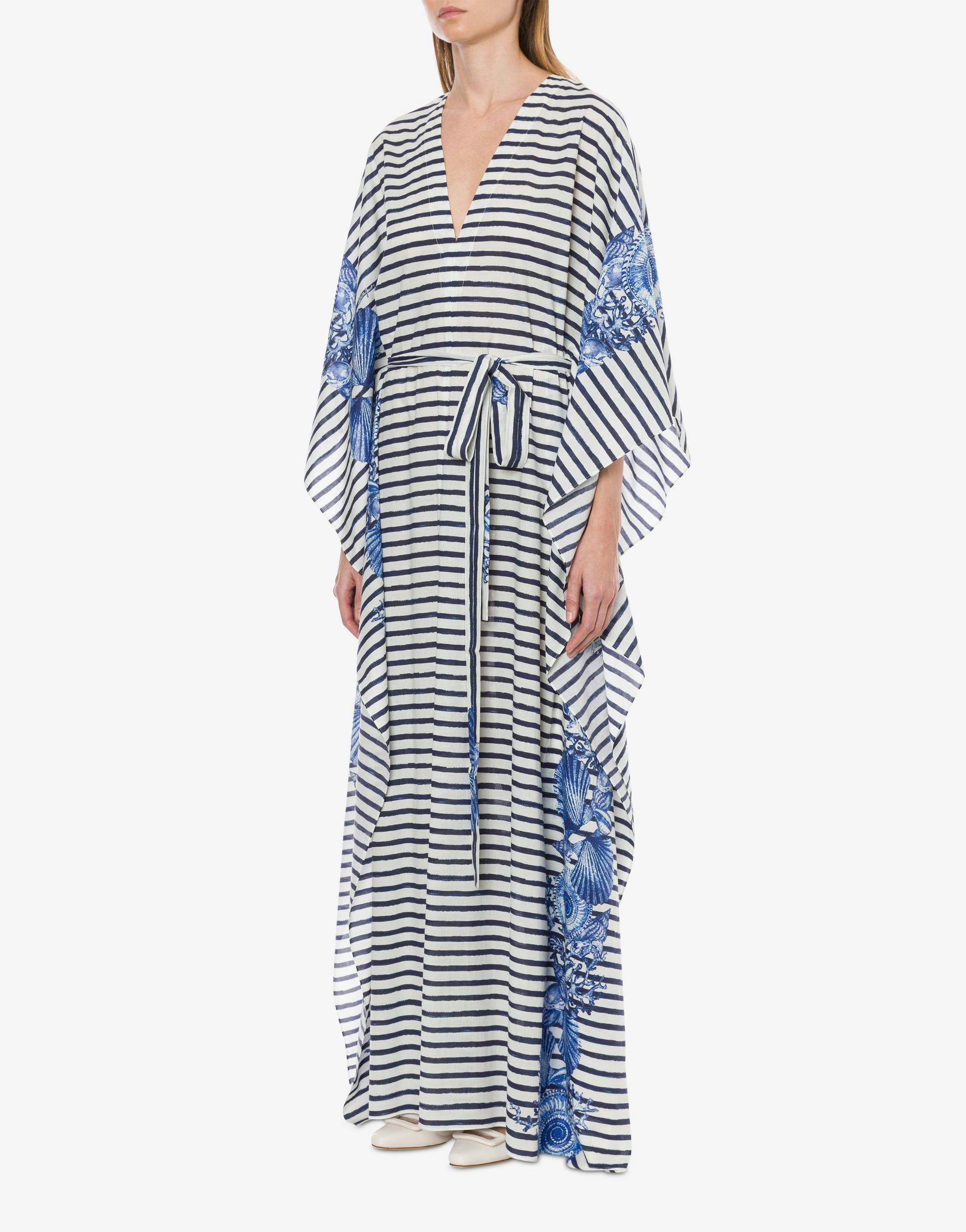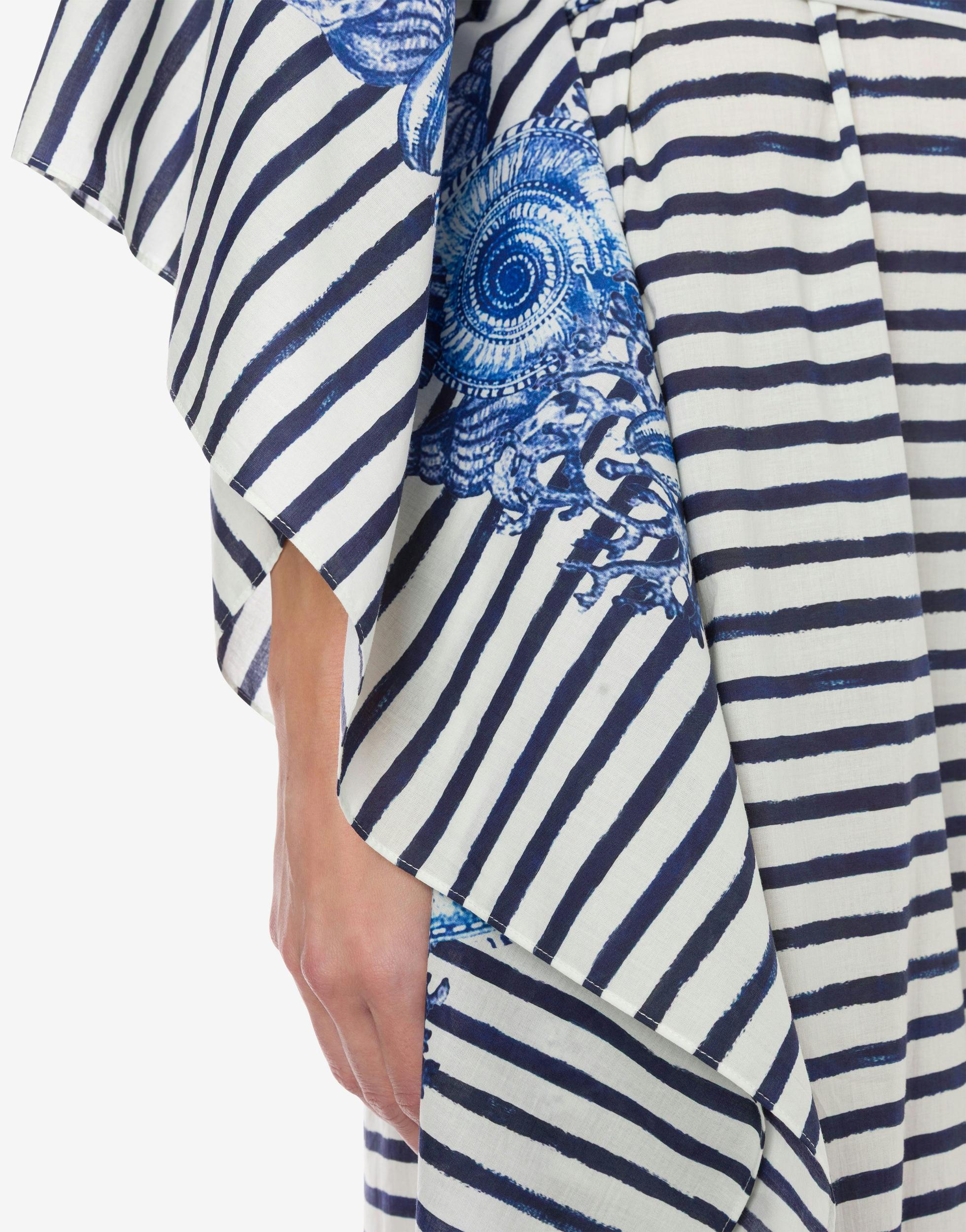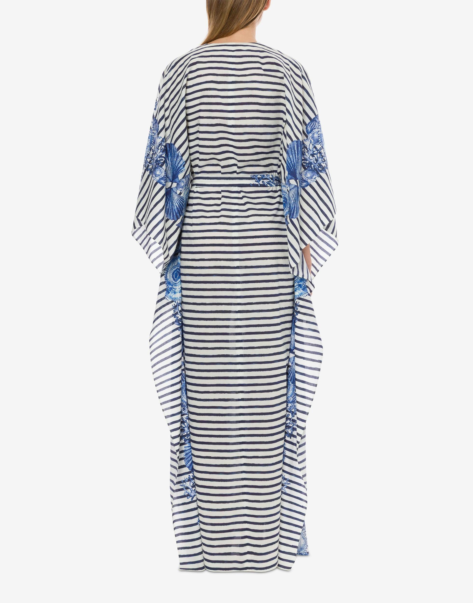 Alberta Ferretti presents the exclusive beachwear capsule collection, featuring a print in shades of blue that plays with a symmetrical composition of shells and corals, set against a background of nautical stripes. The kaftan, made from organic cotton muslin, has a relaxed fit. The design of the sleeves and the belt marking the waist add a feminine touch to the piece.