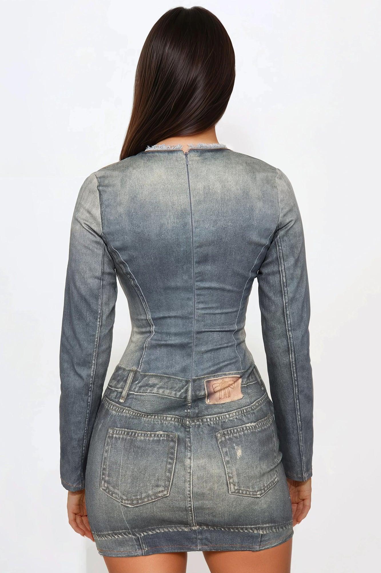 Available In Denim. Printed Denim Micro Mini Dress Distressed mock neckline Long sleeves Lace up detail Back zipper Length measured flat = 31" Disclaimer: Due To The Specialized Wash Process, Each Garment Is Unique. Self: 97% Cotton 3% Spandex Imported