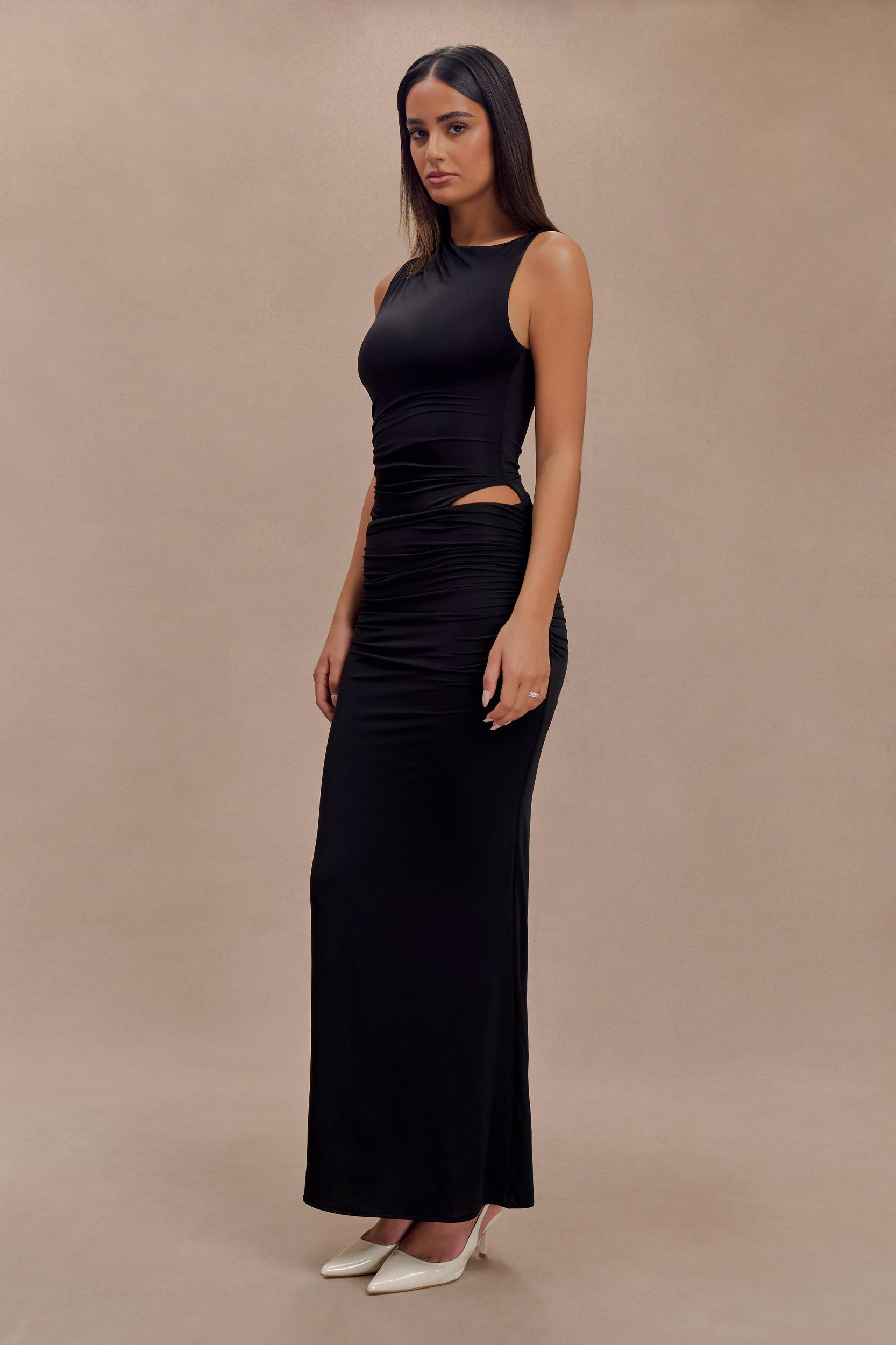 Redefine elegance. The KAIA Slinky Cut Out Maxi Dress combines sleek design with statement details. Featuring an asymmetrical neckline with elegant ruching, this bodycon dress sculpts the silhouette while the cutout details at the hips add a daring touch. The ruching at the waist enhances the shape, and the maxi length exudes timeless allure. Fully lined for comfort and a flawless fit, the Kaia Dress is the ultimate blend of modern glamour and refined elegance.