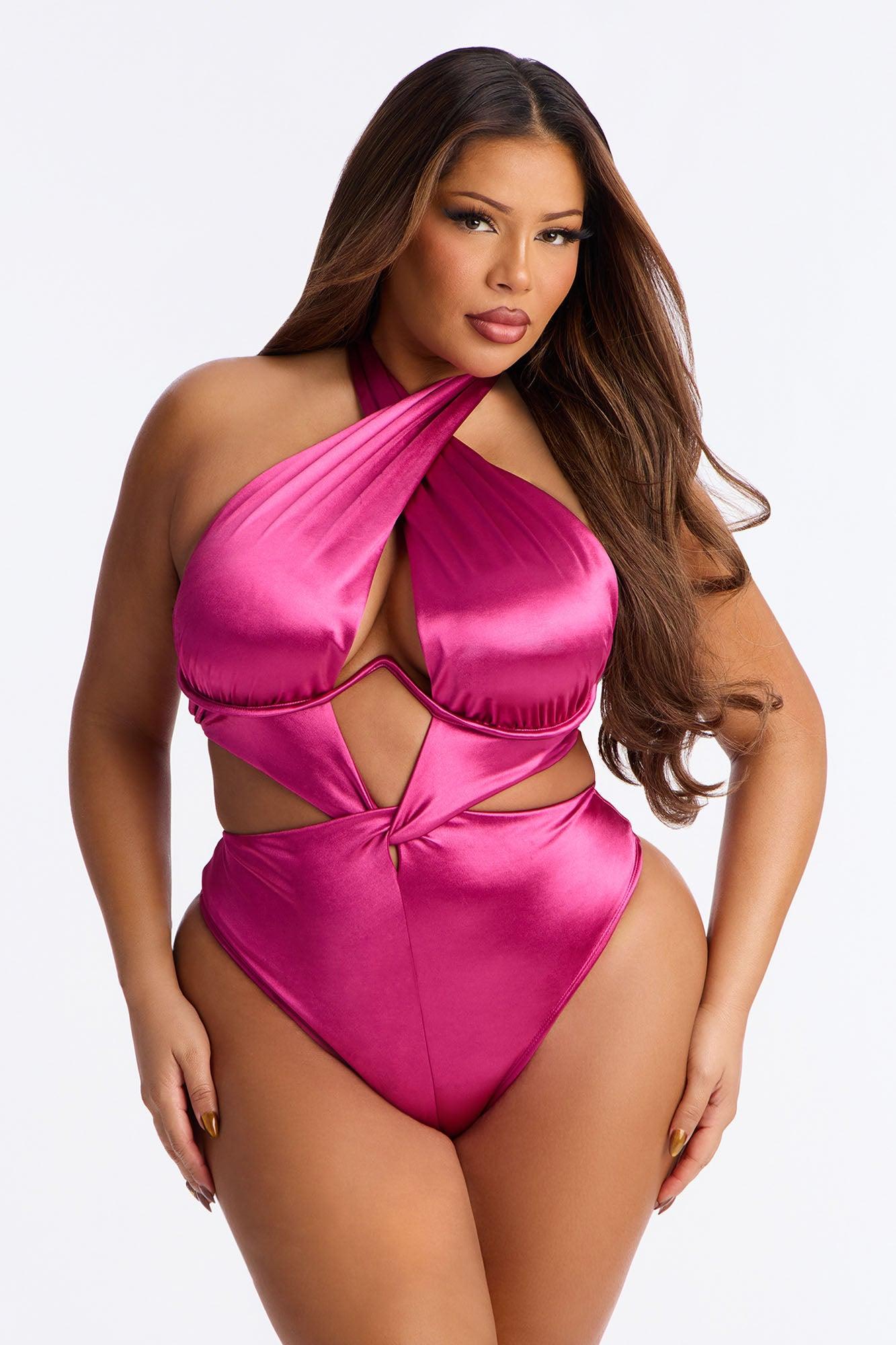 Available In Emerald And Plum. 1 Piece Swimsuit Satin-Like Fabric Halter Neck Criss Cross Underwire Twisted Knot Detail Cutouts High Leg Cut Cheeky Full Stretch Final Sale Shell : 92% Polyester 8% Spandex Lining : 92% Polyester 8% Spandex Imported California Proposition 65WARNING: Cancer and Reproductive Harm - www.P65Warnings.ca.gov.