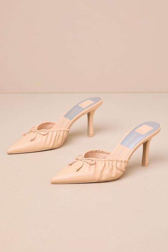 Great style begins with perfect pumps like the Dolce Vita Kairi French Vanilla Leather Bow Pointed-Toe High Heel Mules! Smooth genuine leather creates a pointed-toe upper, complete with a ruched collar and a ballet flat-inspired bow detail. Stiletto heel elevates the slide-on design.