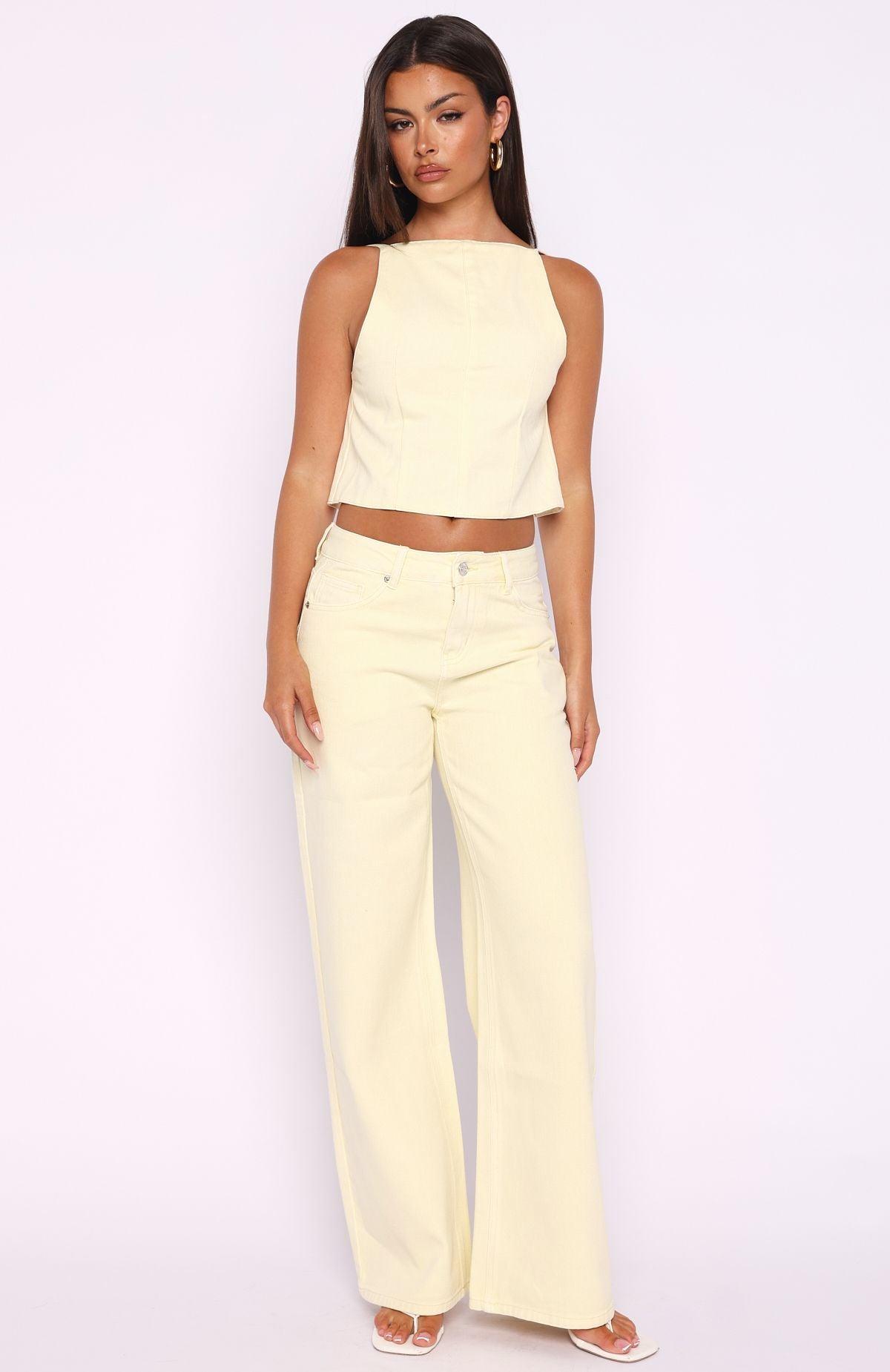 Outfit game strong in the Kalaya Mid Rise Wide Leg Jeans in Lemon Wash. With a mid-rise waist, relaxed wide-leg silhouette, classic button and zip closure, belt loops, a timeless 5-pocket design and a faux leather label side back, these jeans bring effortless style. Style them with a simple tank, sandals and layered gold jewellery for an easy, chic summer look.